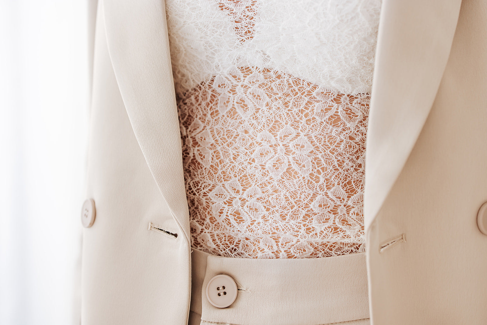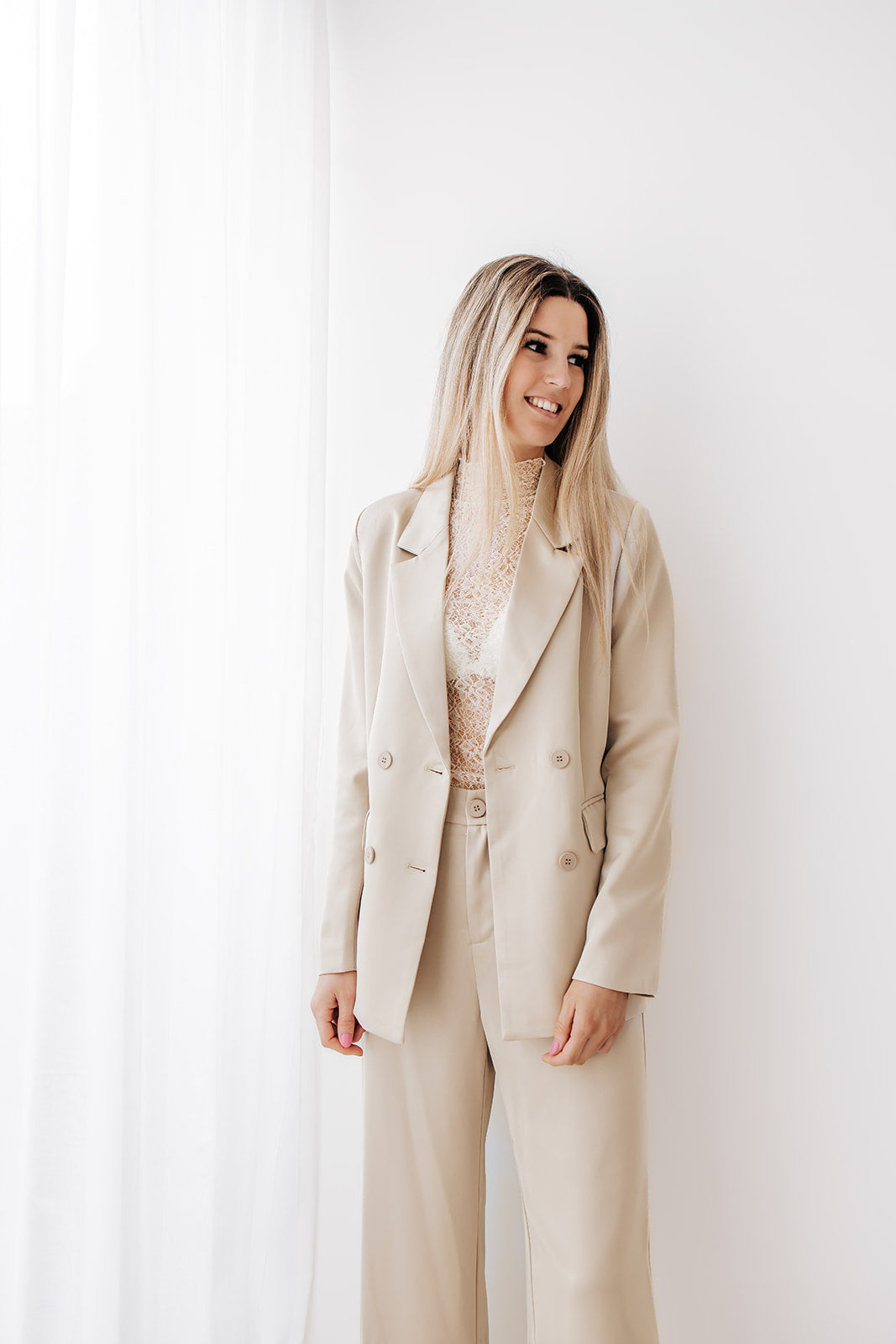 Onder de blazer draagt u een witte kanten blouse, die een prachtig contrast vormt met de glanzende stof van de set. De delicate kantdetails voegen een romantische en verfijnde touch toe, terwijl de lichte stof een luchtig en vrouwelijk effect creëert.