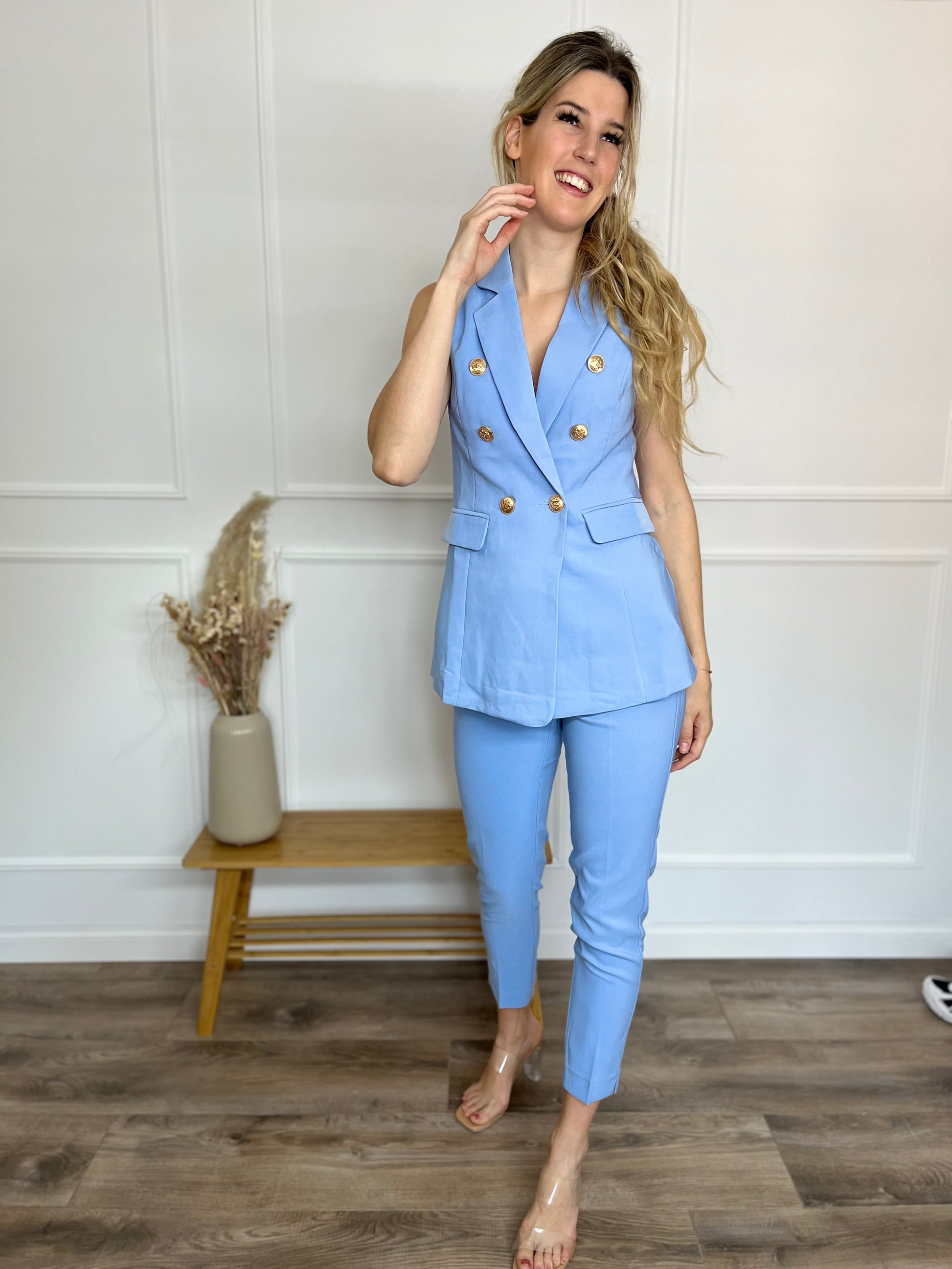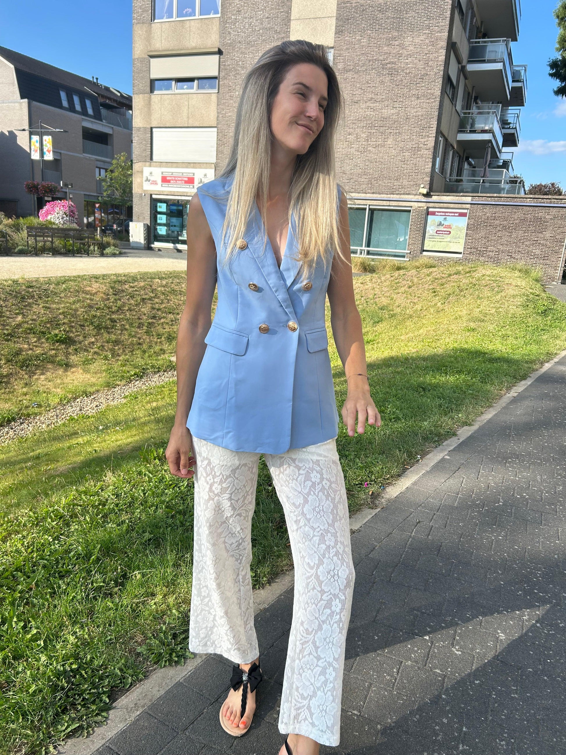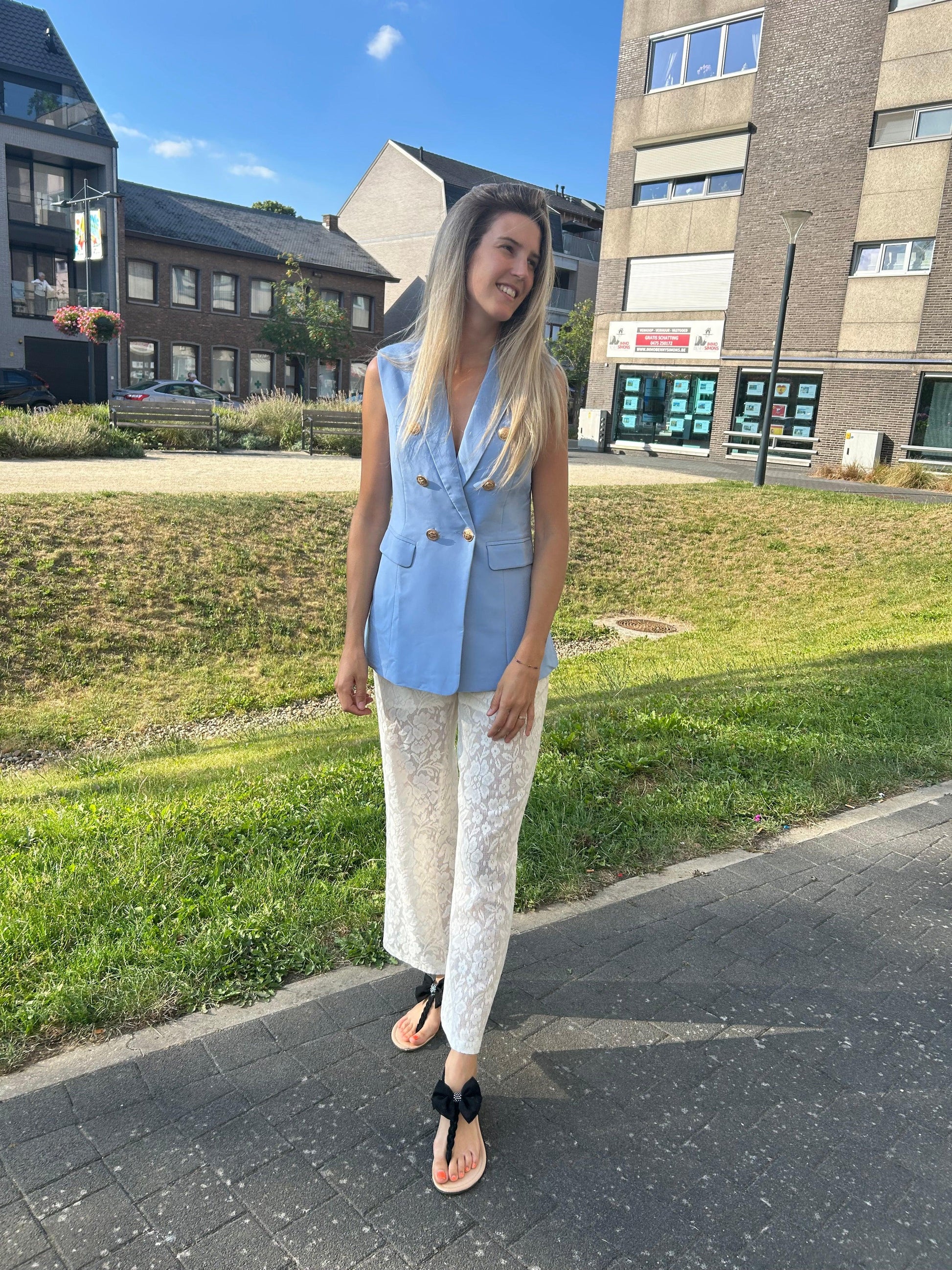 Mouwloze gecentreerde blazer met gouden knopen. Kan gecombineerd worden met onze broek Lulu.
