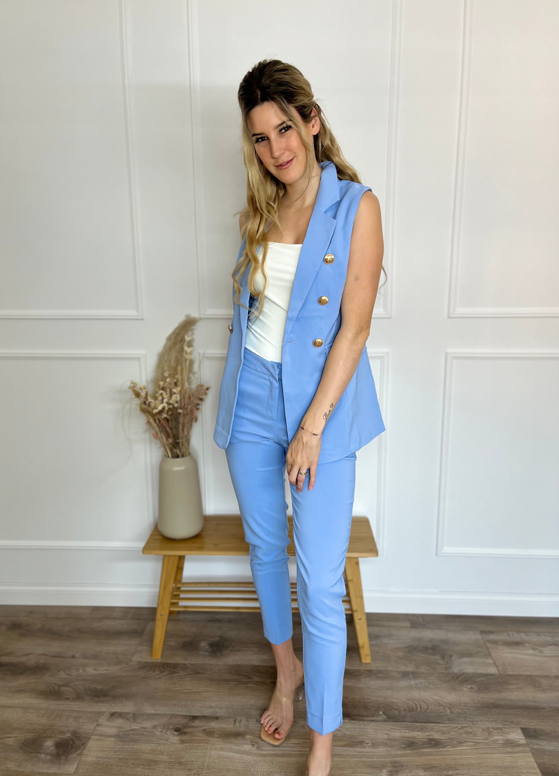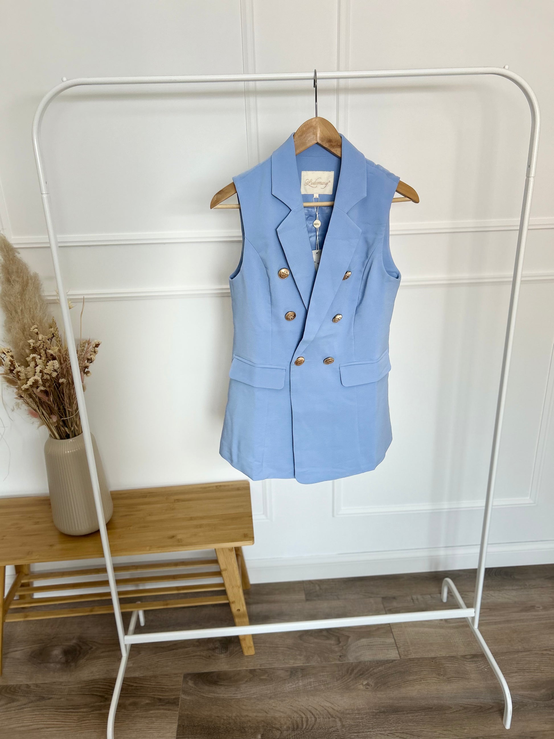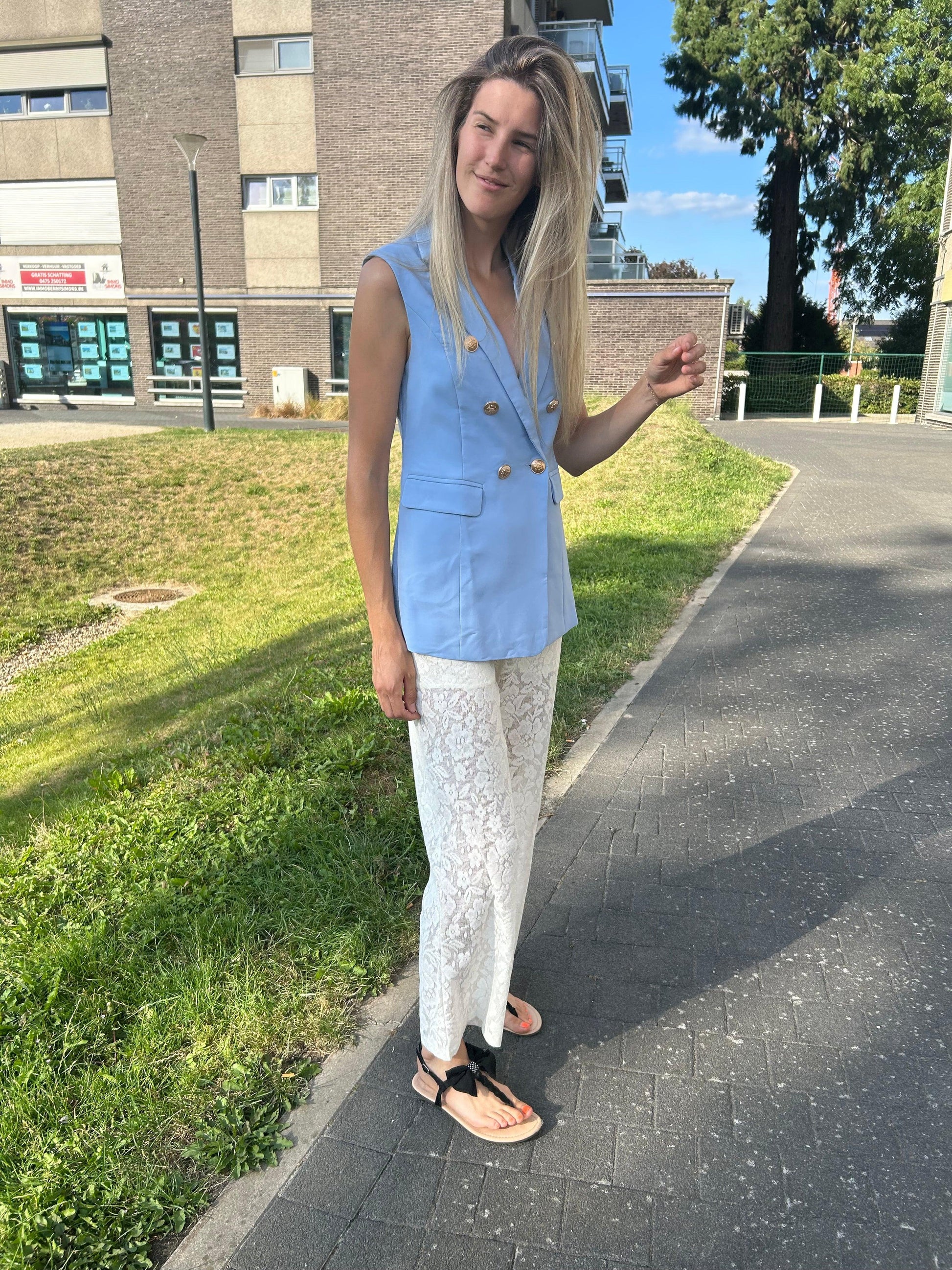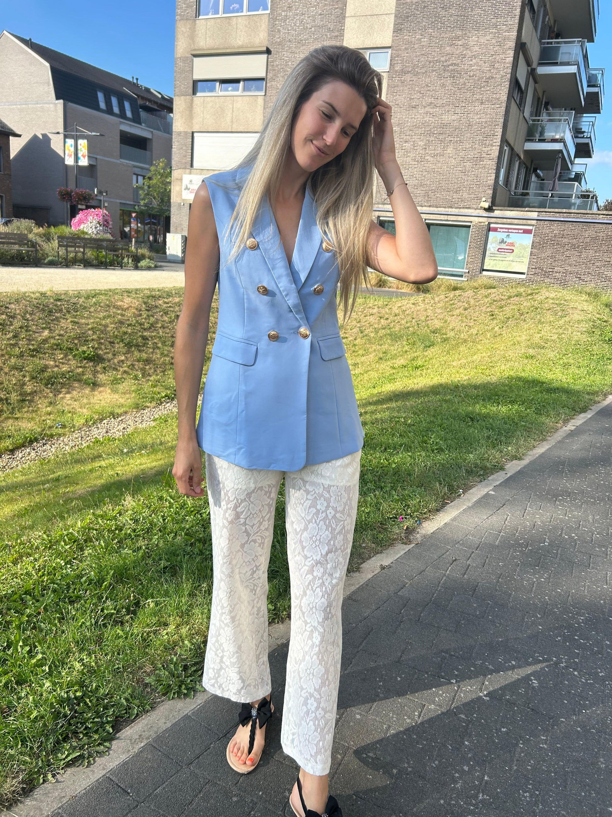 Mouwloze gecentreerde blazer met gouden knopen. Kan gecombineerd worden met onze broek Lulu.