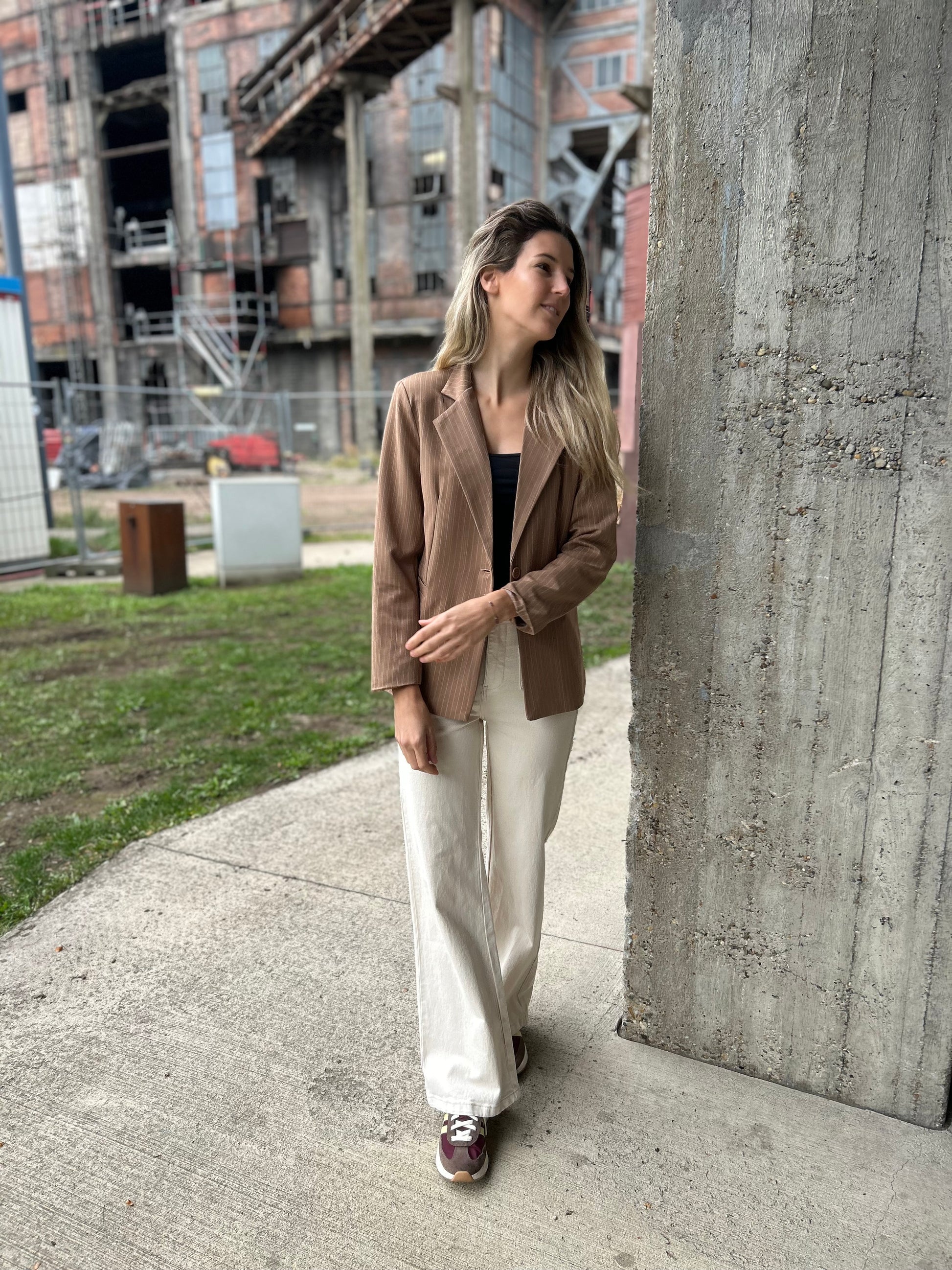 Gecentreerde blazer dat sluit met één knoop. We hebben deze blazer in het bruin en in de beige. De blazer heeft vooraan twee zakken voor de sier. Je kan deze blazer eindeloos combineren.