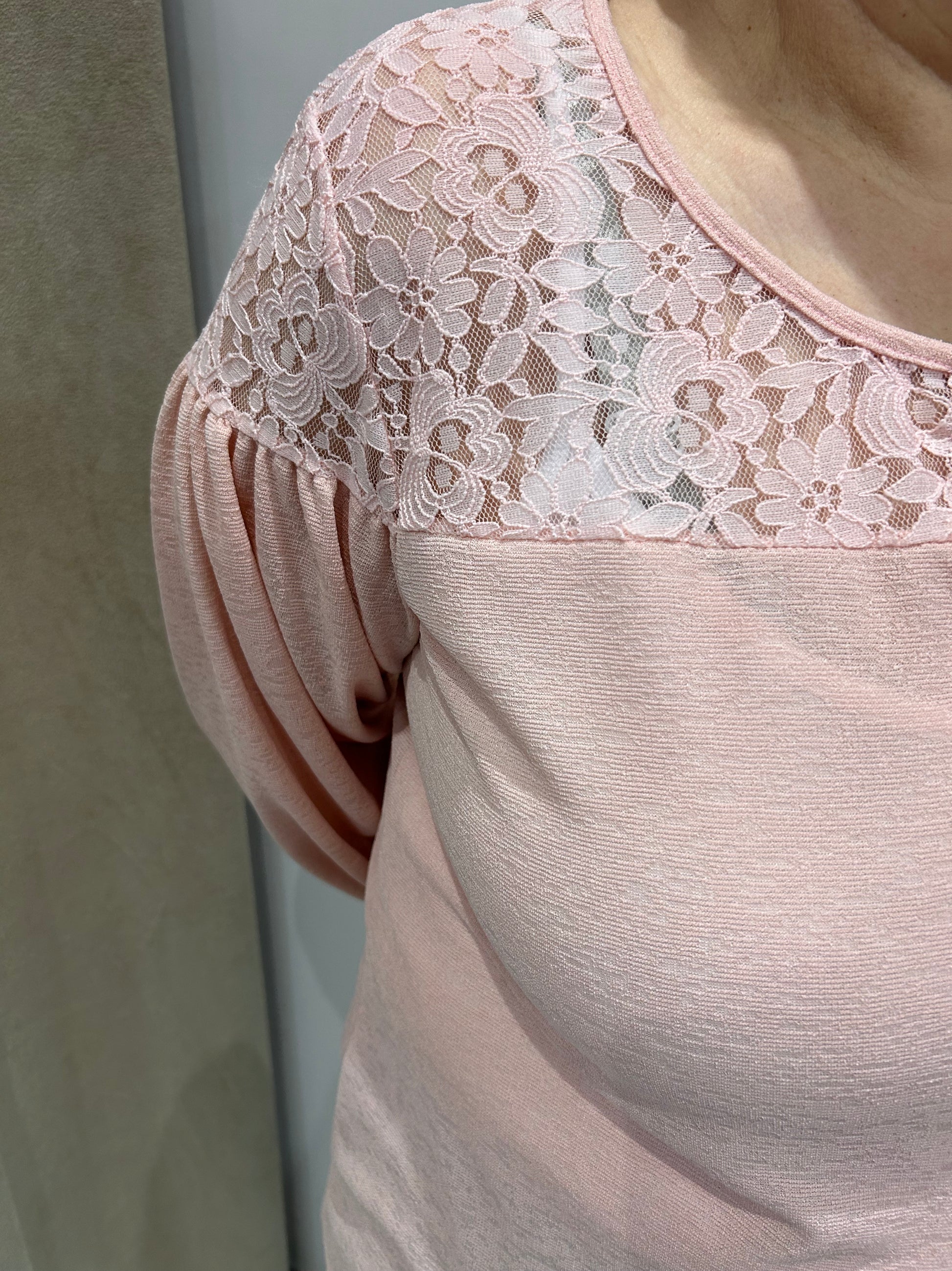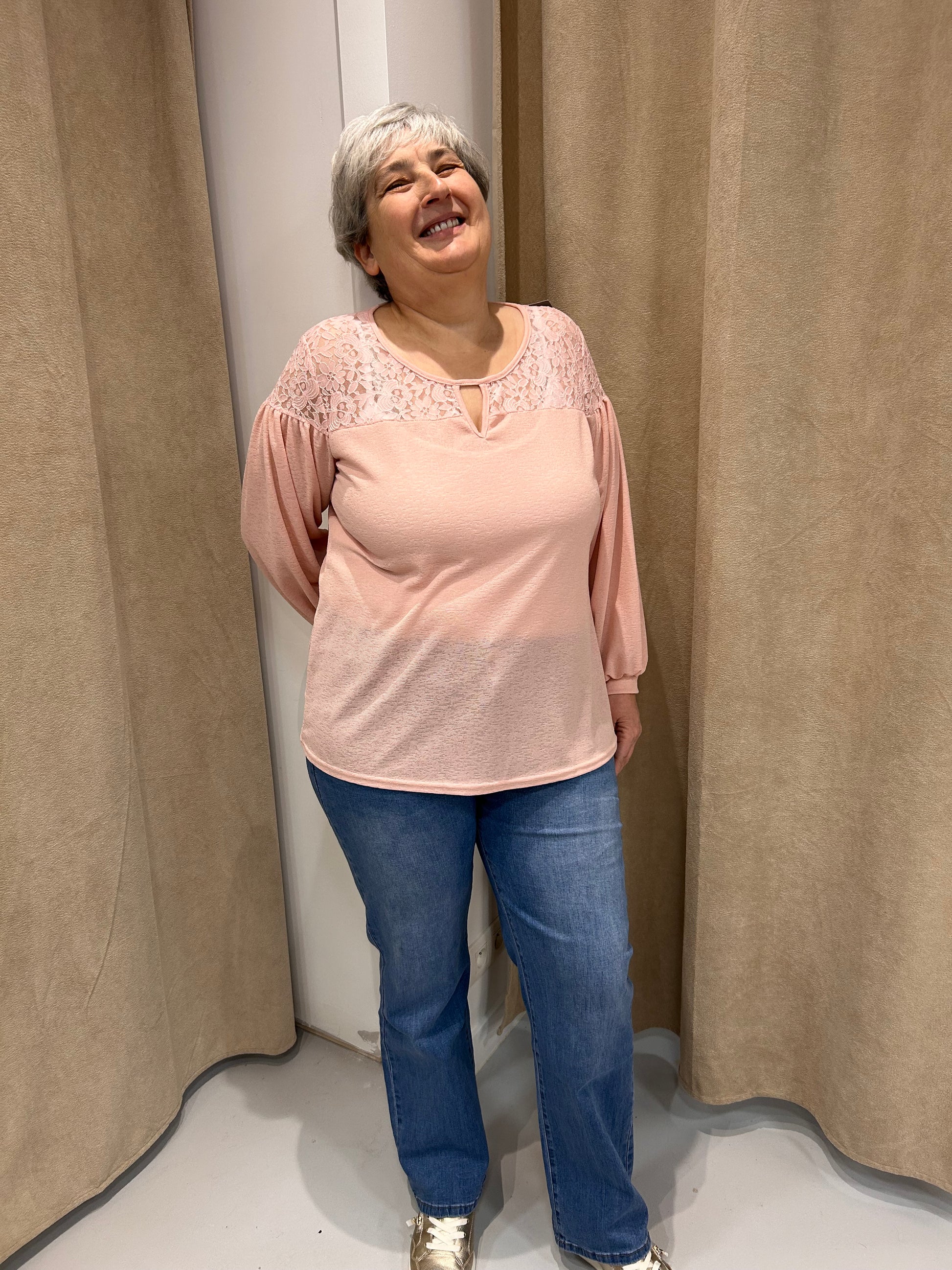 Blouse Alison is een dunne doorschijnende blouse met kant bovenaan. De blouse heeft een ronde hals met een kleine V uitsparing in het midden. De kant boven aan de blouse maakt de blouse elegant. Deze blouse kan je eindeloos combineren. Aan de pols is er een kleine band. We hebben deze blouse in twee kleuren: wit en nude. De volgende maten zijn beschikbaar: 42/44, 46/48, 50/52 en 54/56.