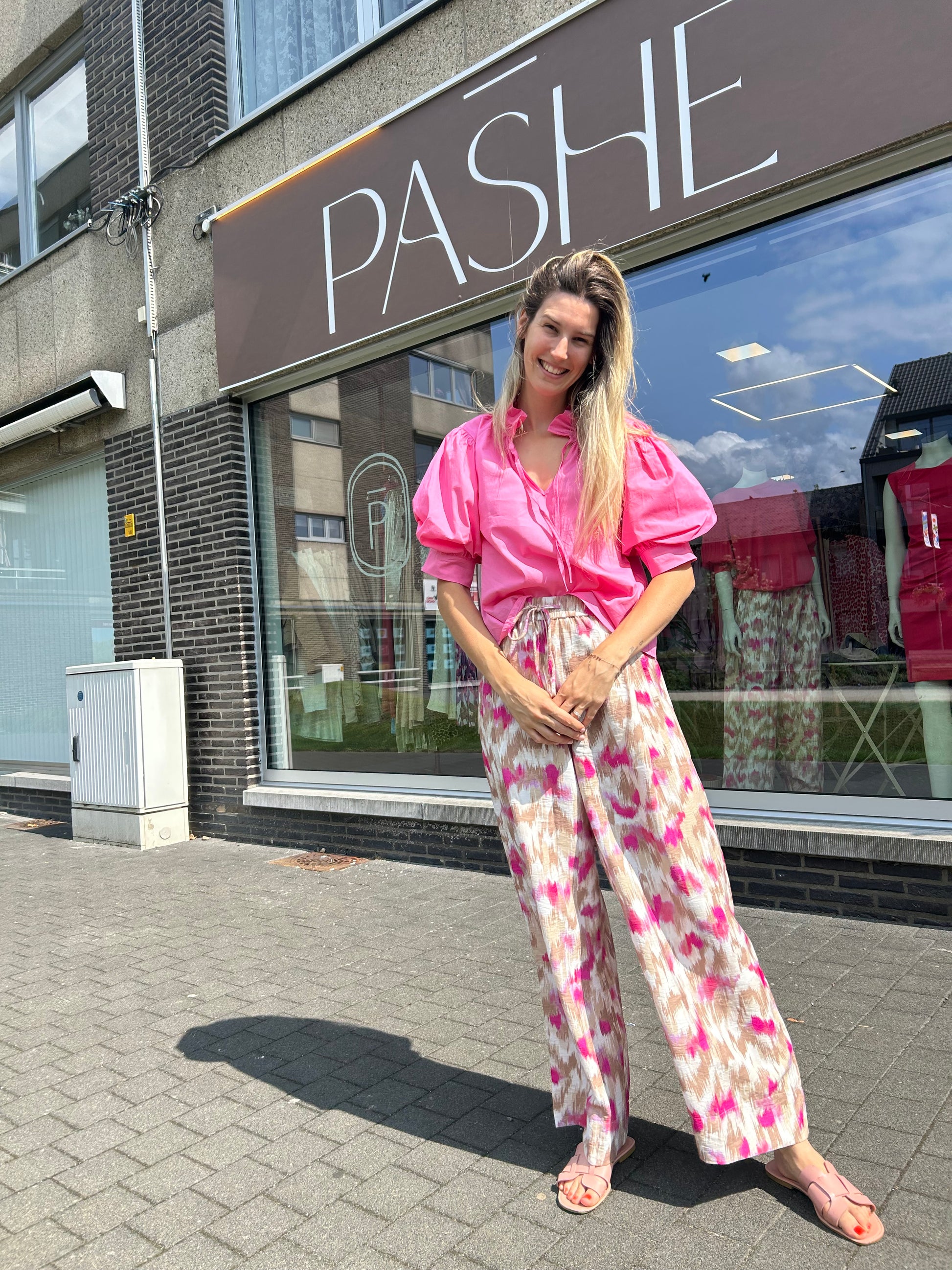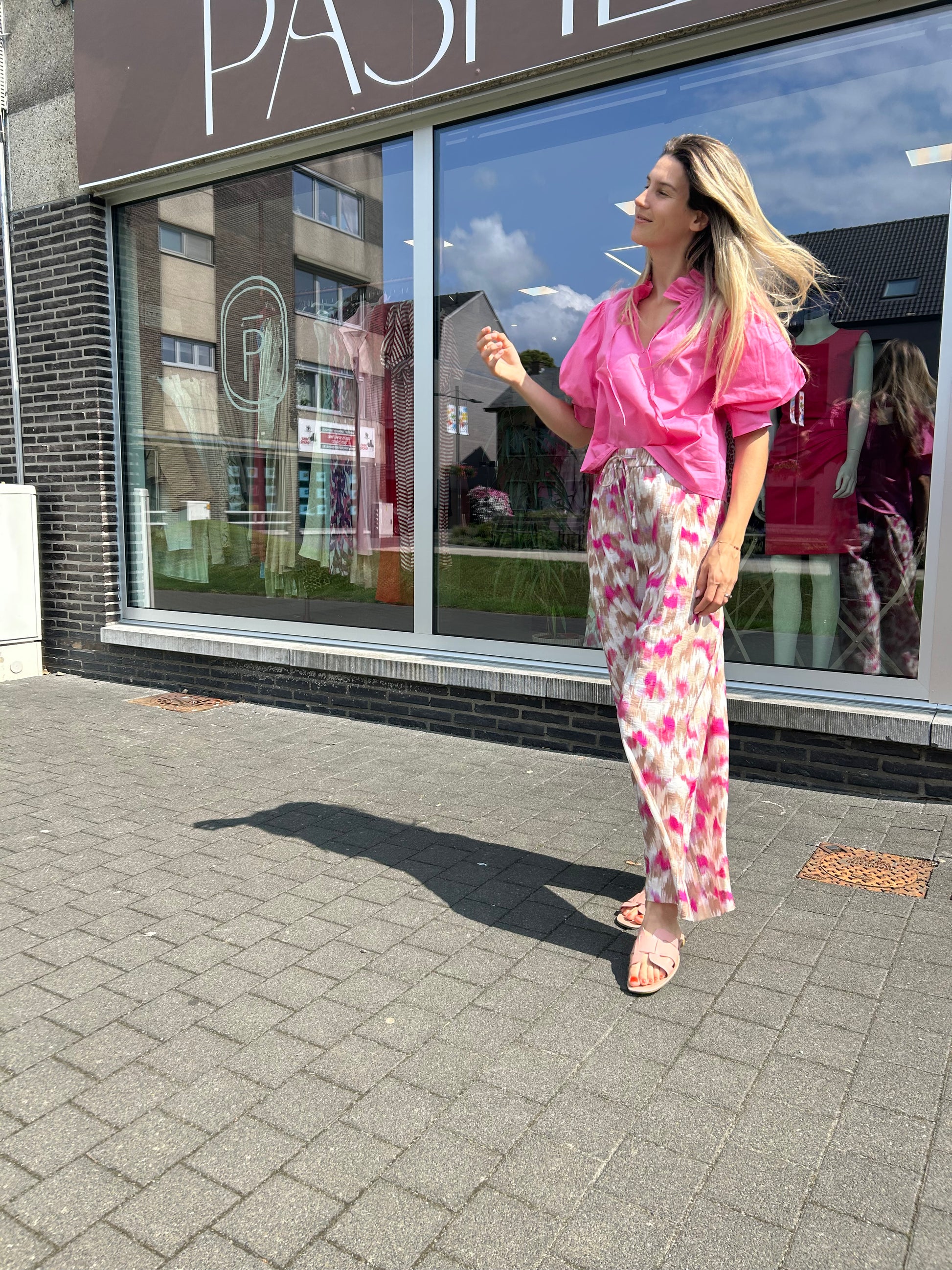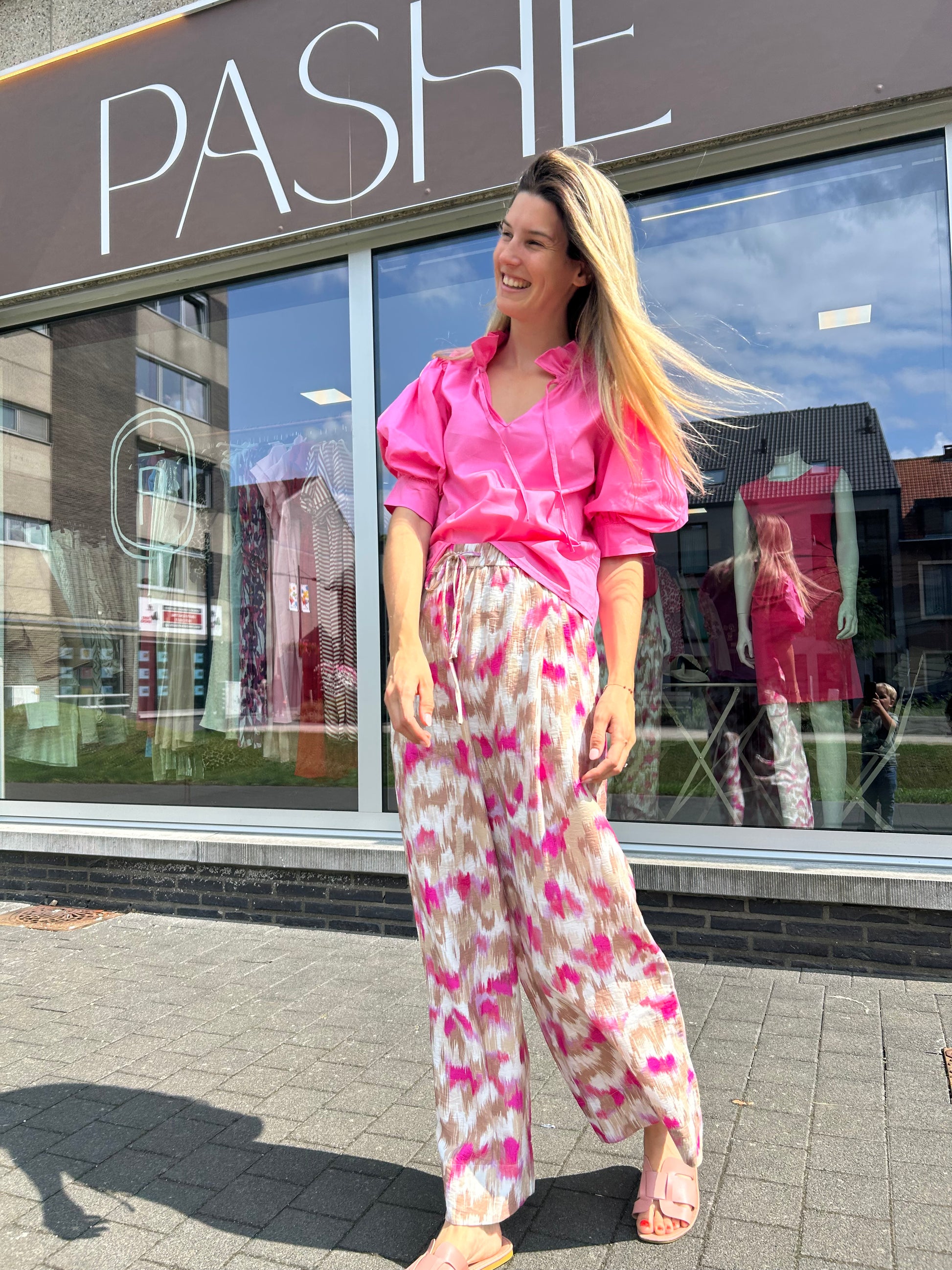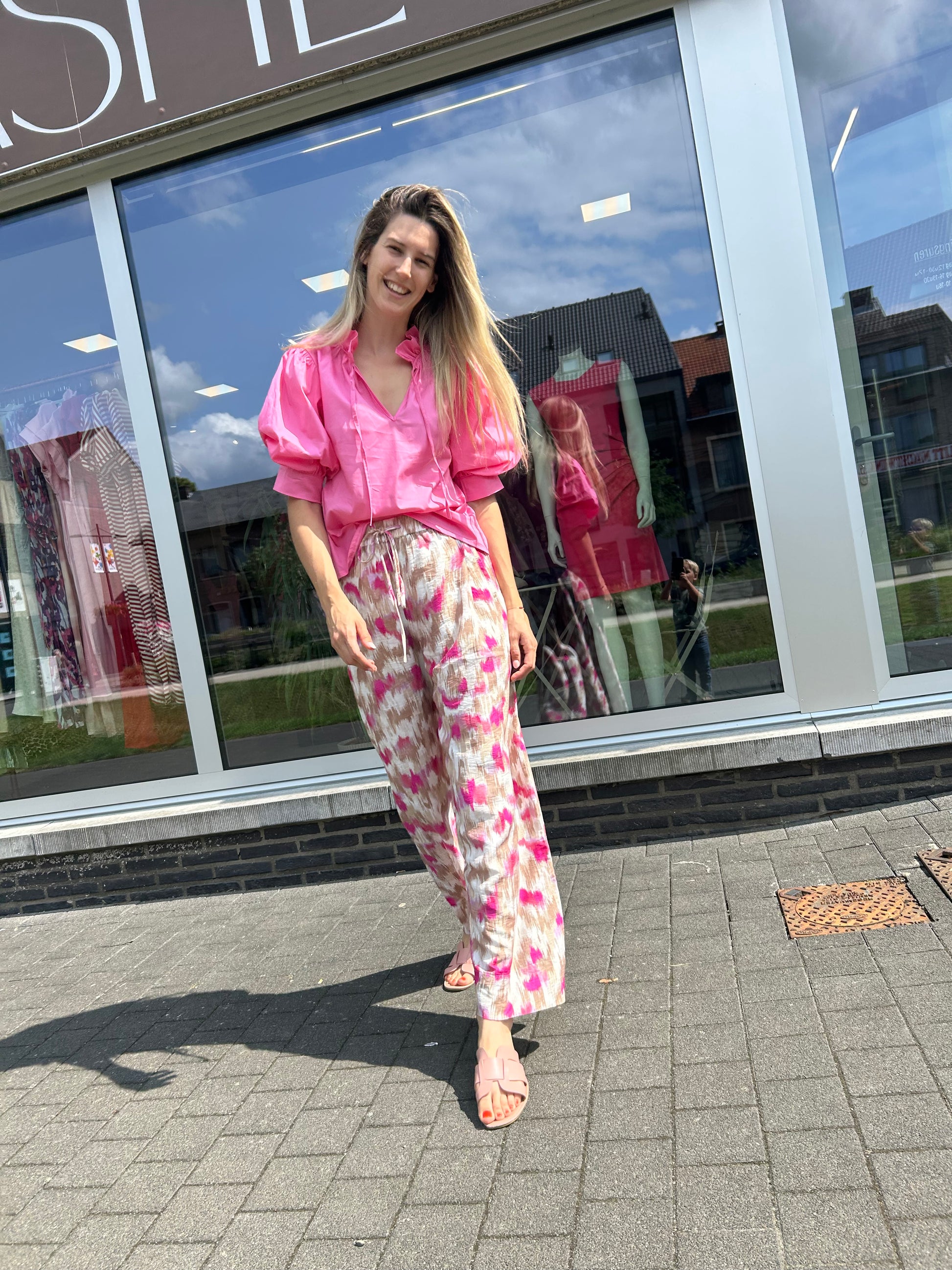 Elegante blouse van Italiaans katoen. Deze blouse heeft een geplooide kraag met striksluiting. Alsook pofmouwen tot aan de elleboog. De blouse heeft een rechte; losse pasvorm. We combineerden de blouse op "BROEK TESSA YEST" want samen vormen ze een mooi geheel.
