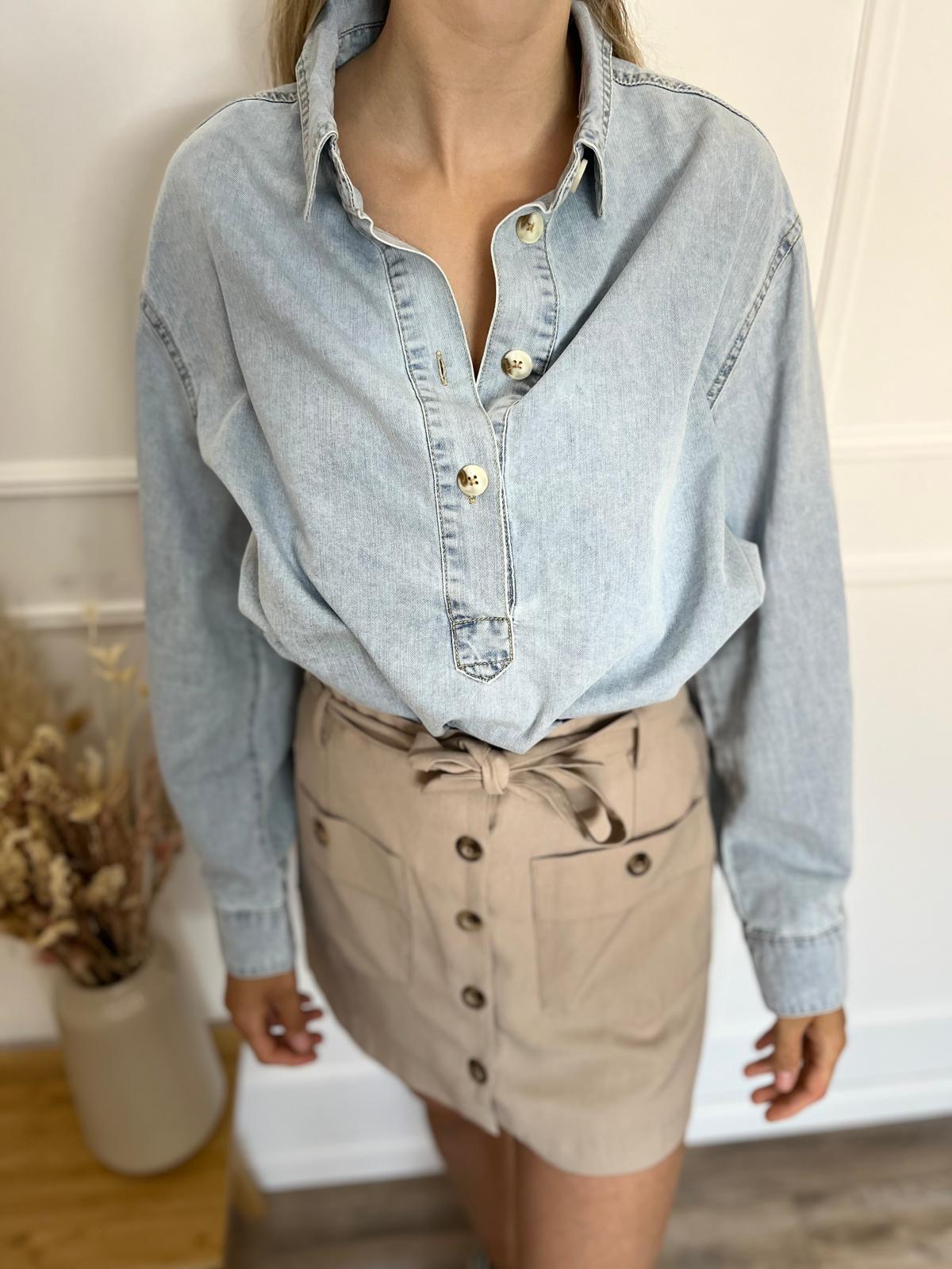 Onze blouse Dianne is een denim blouse met aan de voorkant knoopjes. Deze blouse heeft lange mouwen en een kraag.
