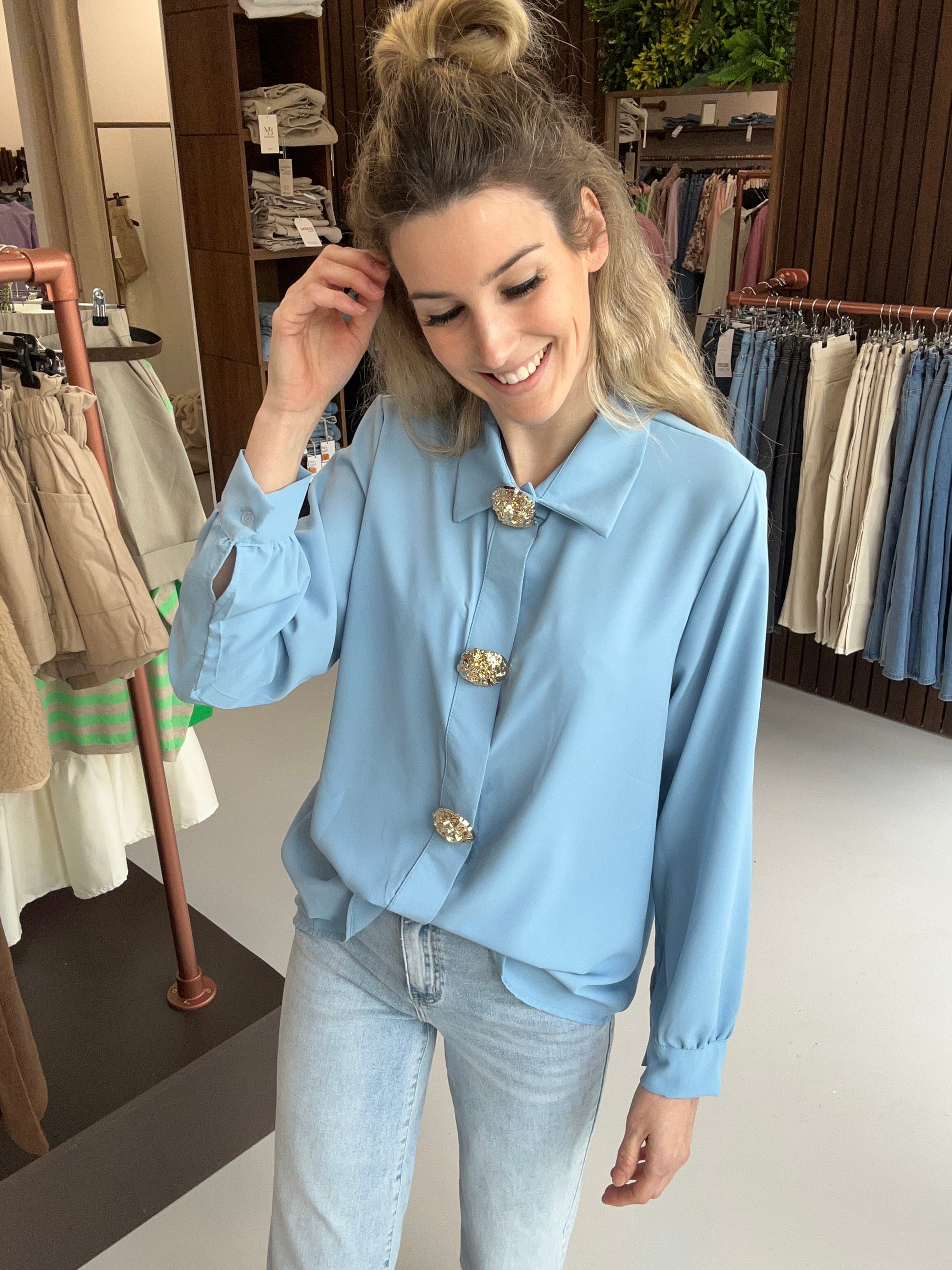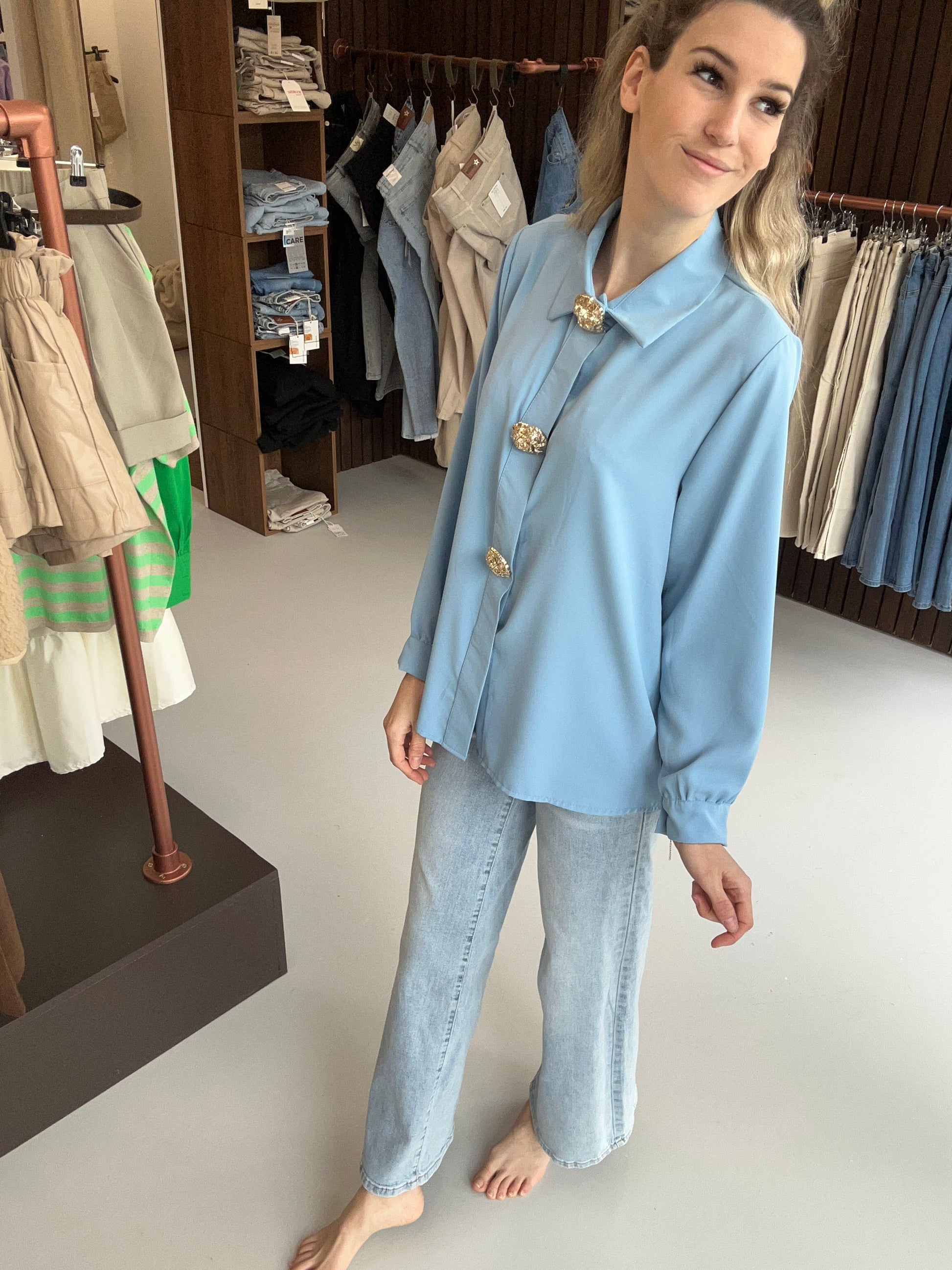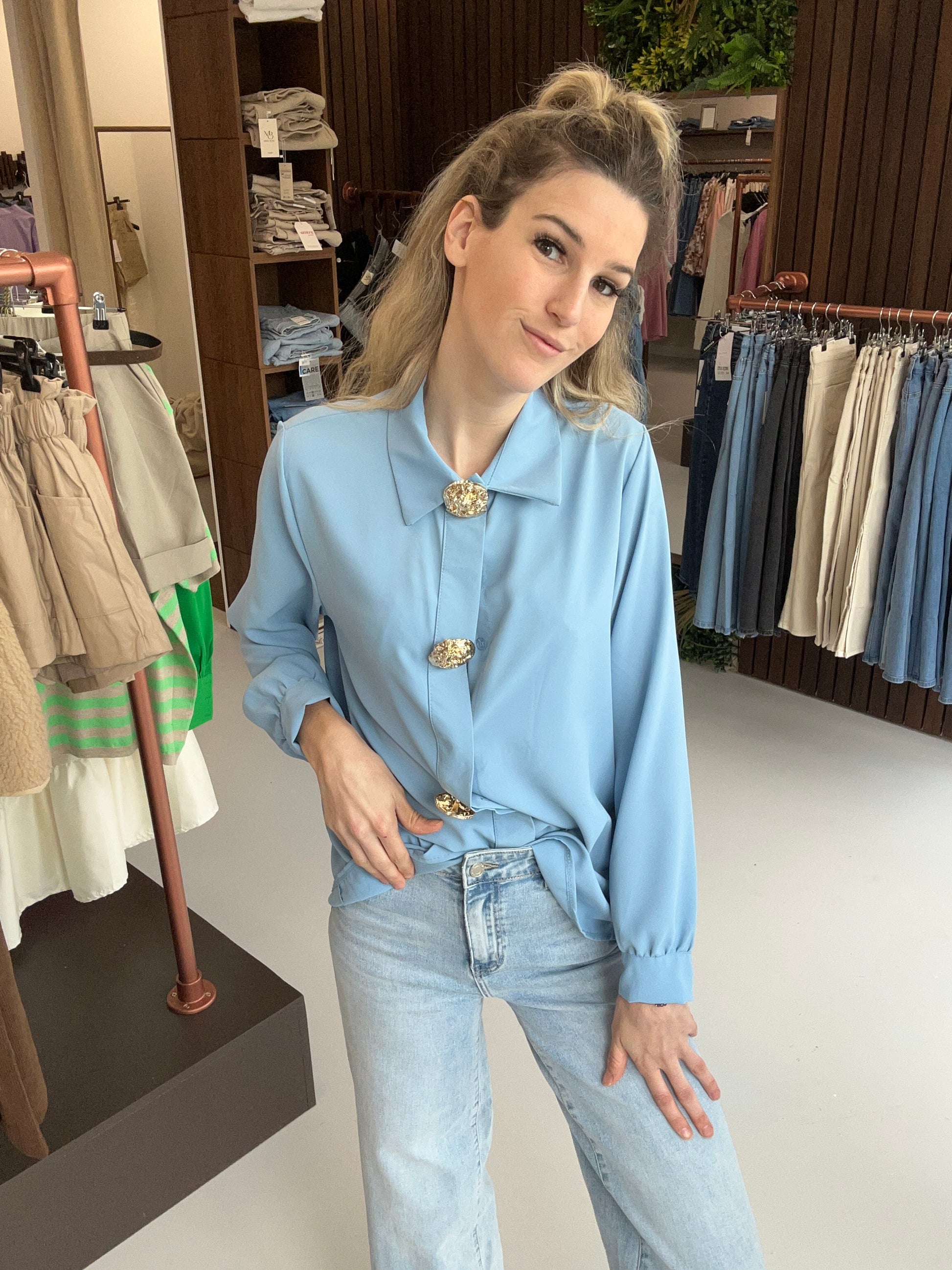 Blouse Evi sluit vooraan met knopjes en heeft bovenaan 3 mooie gouden sierknopen! Deze blouse dragen we vooraan in de jeans gestoken en laten het achteraan los hangen. Het heeft een mooie blauwe kleur en een kraag. Deze blouse heeft lange mouwen met een boord onderaan. Wij raden aan de blouse met de hand te wassen omwille van de knopen.