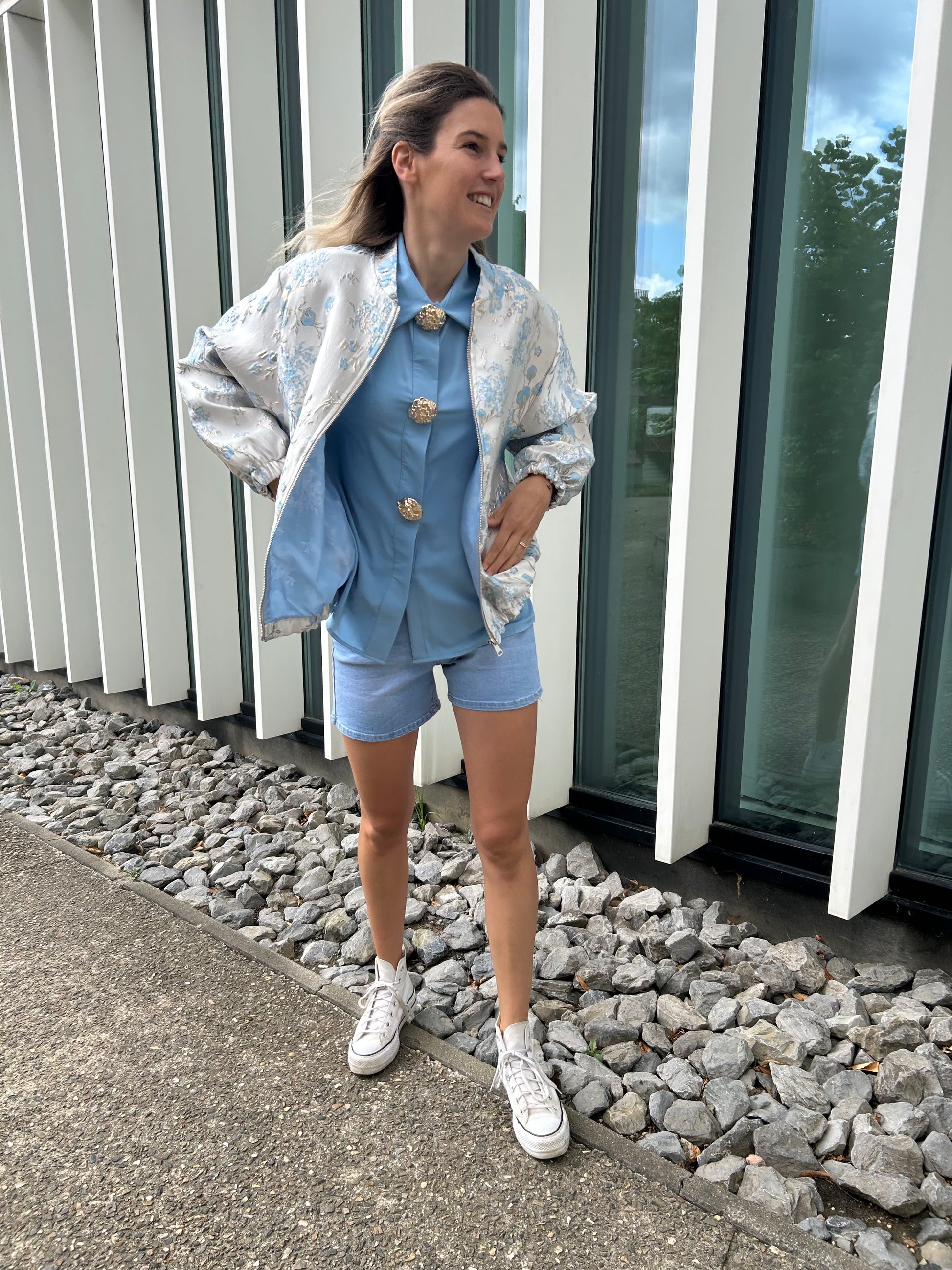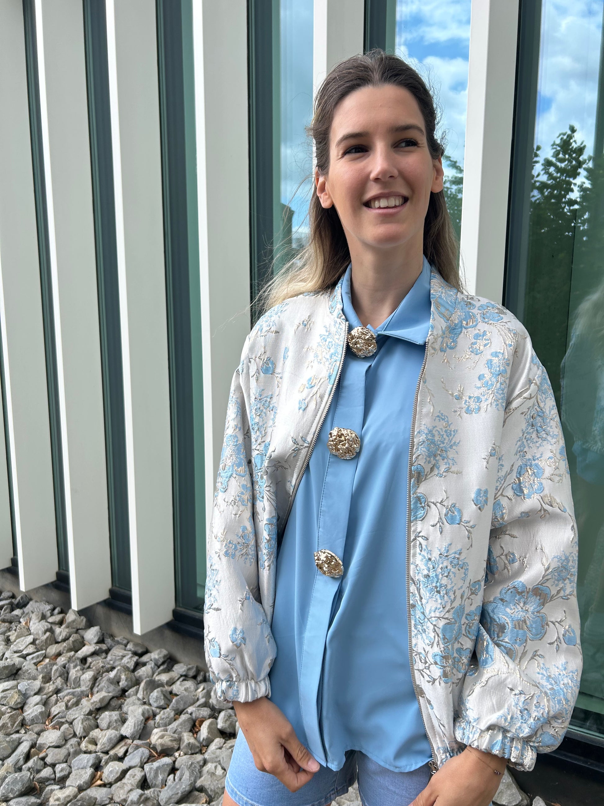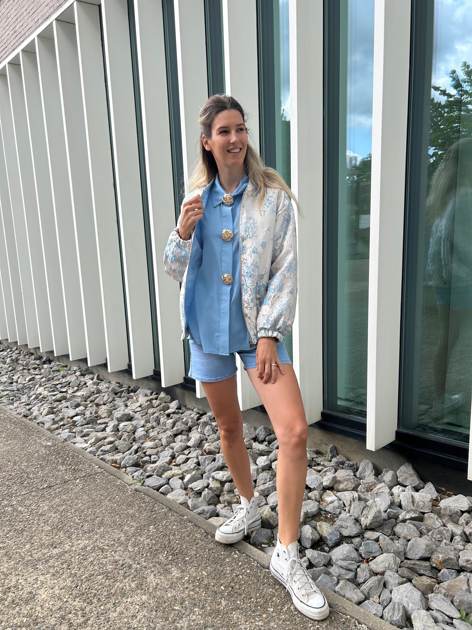 Blouse Evi sluit vooraan met knopjes en heeft bovenaan 3 mooie gouden sierknopen! Deze blouse dragen we vooraan in de jeans gestoken en laten het achteraan los hangen. Het heeft een mooie blauwe kleur en een kraag. Deze blouse heeft lange mouwen met een boord onderaan. Wij raden aan de blouse met de hand te wassen omwille van de knopen.