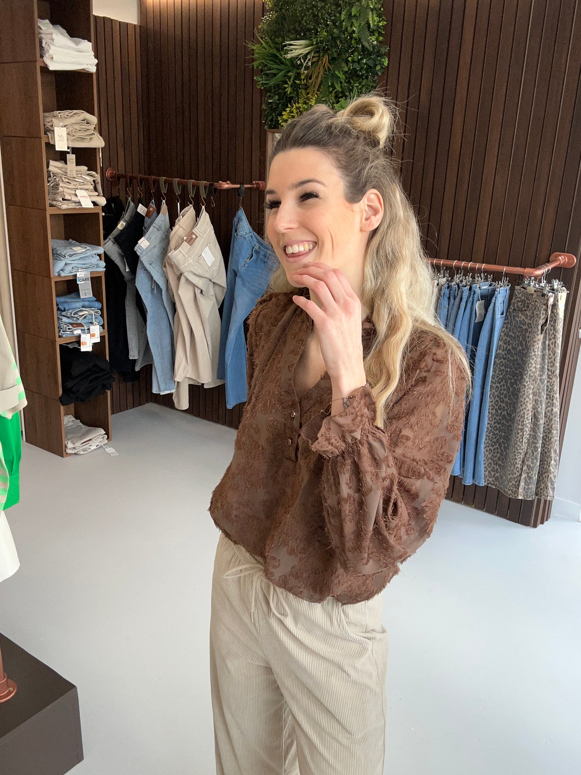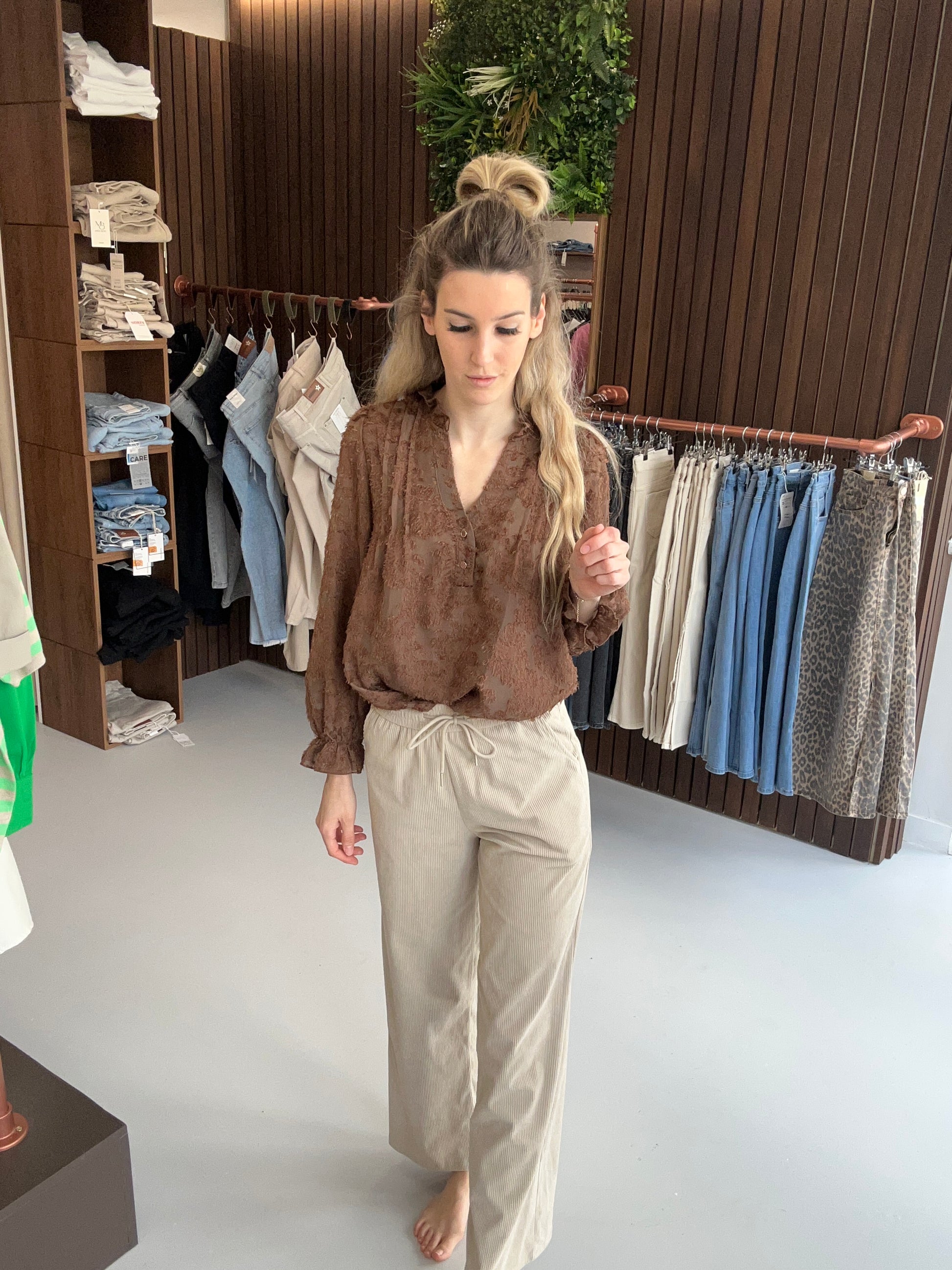 Blouse Saartje is een elegante blouse van lichtgewicht polyester, ideaal voor lente/zomer. De blouse is ontworpen om het vrouwelijke silhouet te accentueren. Het heeft een V-hals met 2 prachtige knoopjes afgewerkt met goud. De blouse heeft een leuke structuur en is licht doorschijnend maar dat stoort zeker niet. De blouse heeft lange mouwen met aan de pols een elastiek. Wij combineerden de blouse met onze "BROEK LIZZY TAUPE" want we vinden dit een prachtige combinatie.