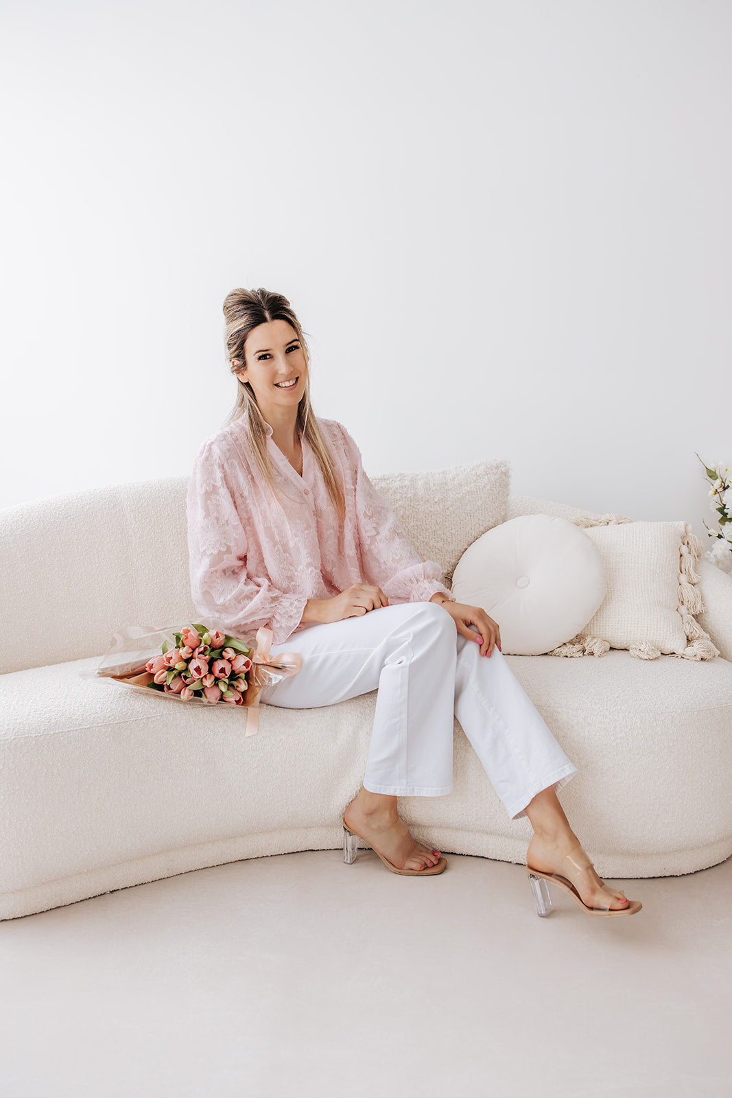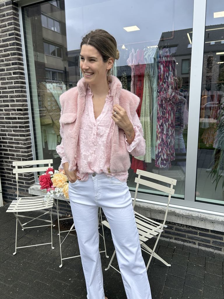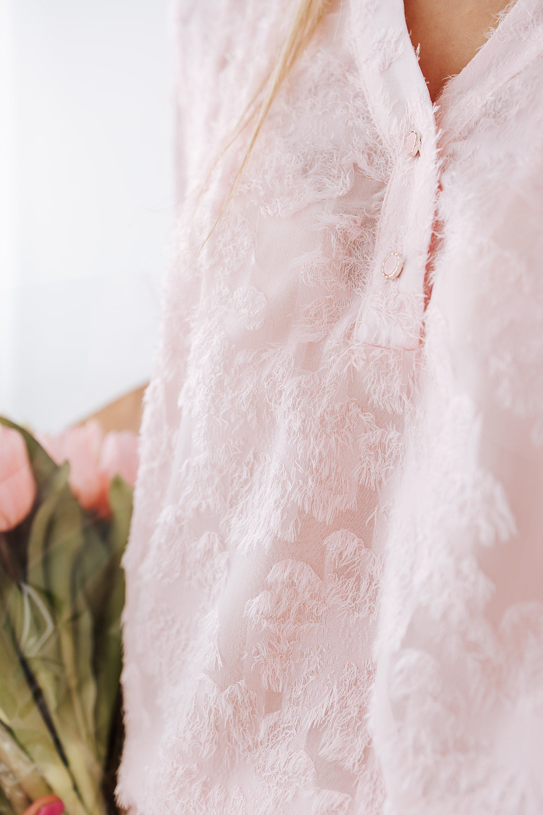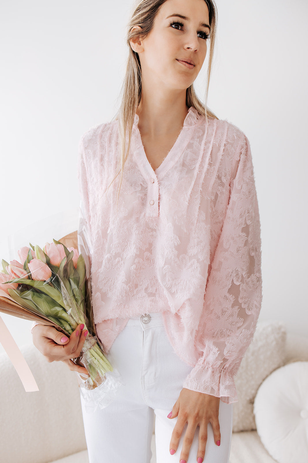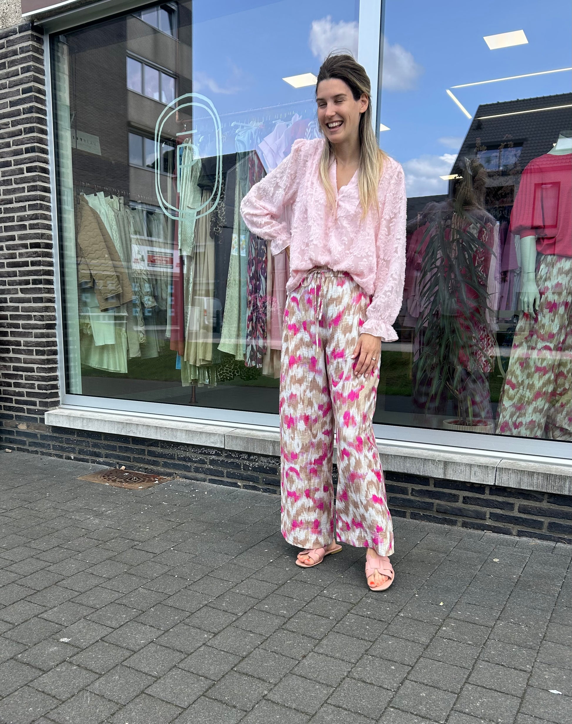 Blouse Saartje is een elegante blouse van lichtgewicht polyester, ideaal voor lente/zomer. De blouse is ontworpen om het vrouwelijke silhouet te accentueren. Het heeft een V-hals met 2 prachtige knoopjes afgewerkt met goud. De blouse heeft een leuke structuur en is licht doorschijnend maar dat stoort zeker niet. De blouse heeft lange mouwen met aan de pols een elastiek. We hebben deze blouse in 5 verschillende kleuren: bruin, rood, lichtblauw, roze en paars.