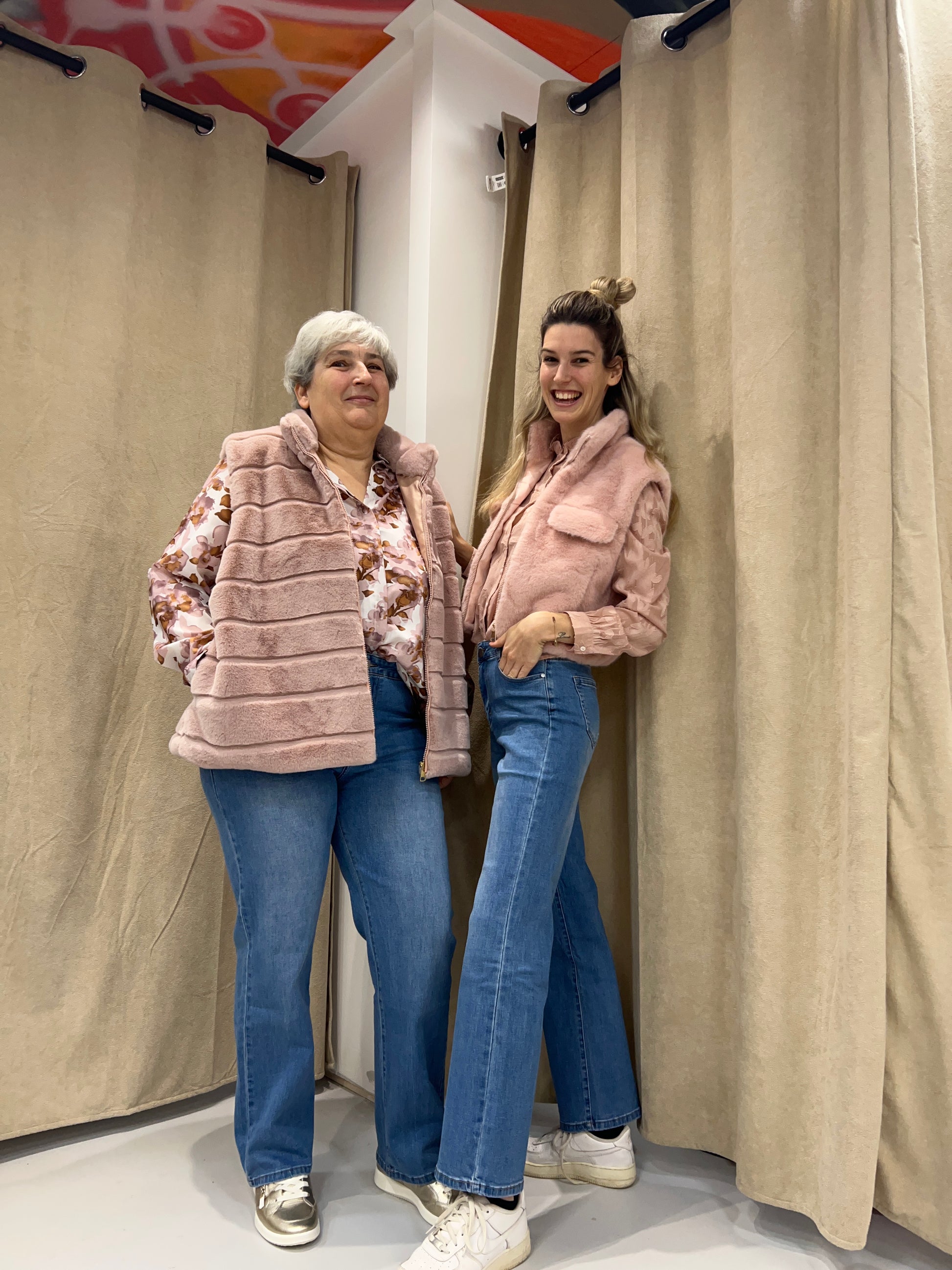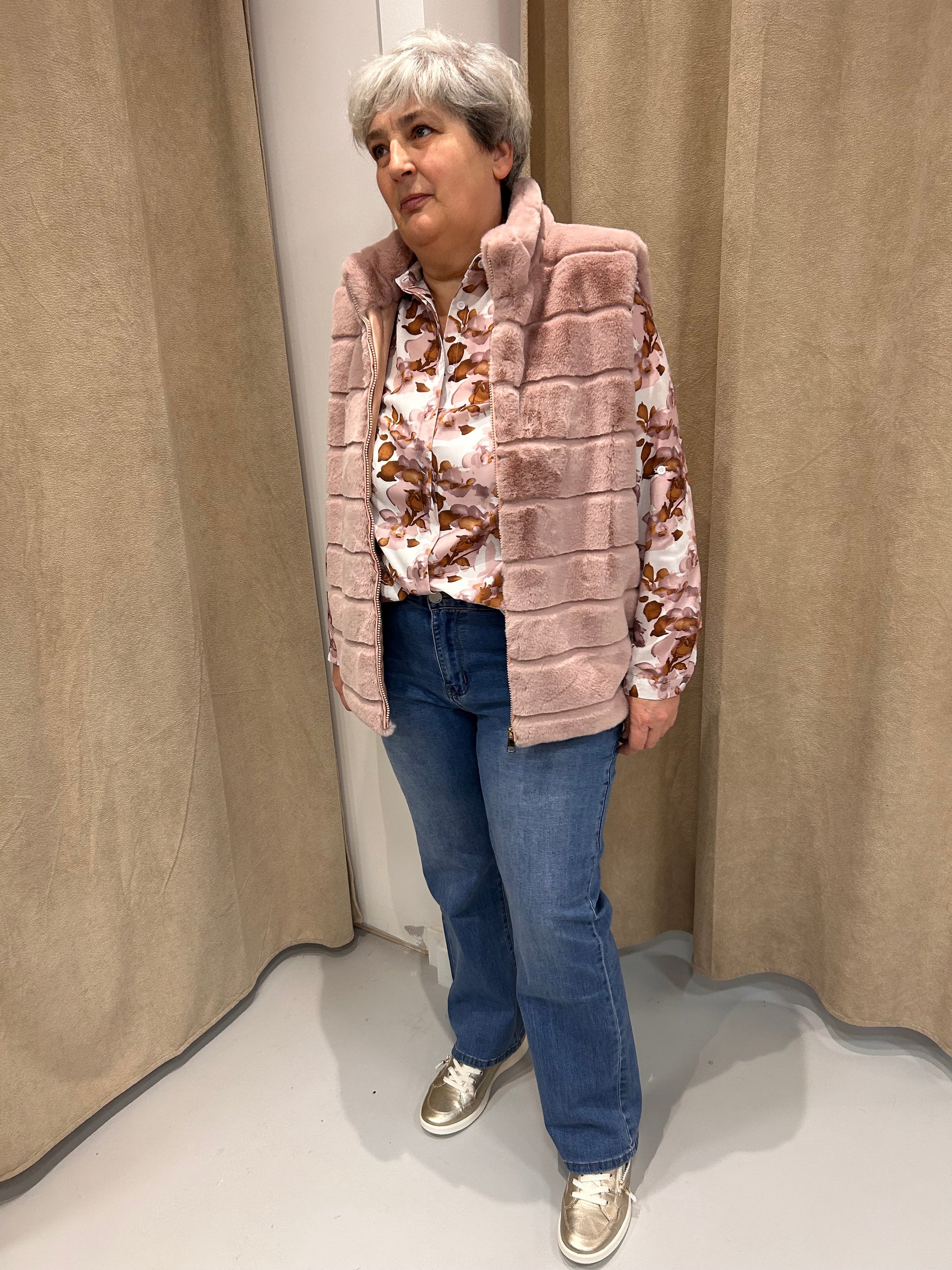 Super zachte nepbonte bodywarmer. Deze bodywarmer heeft een zilveren ritssluiting en een opstaande kraag. De bodywarmer heeft leuke onderverdelingen. Ideaal om over een leuke blousje te dragen bij wat kouder weer. Deze bodywarmer kan gedragen worden van maat 46-54. Wij combineerden de bodywarmer met onze 'BLOUSE ALISON '.