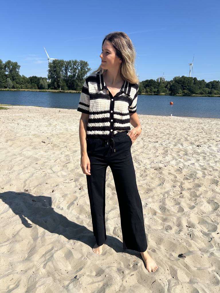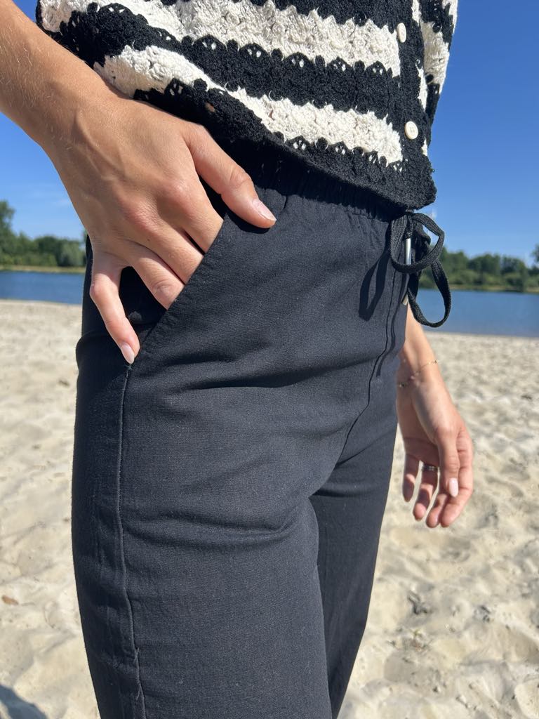 Wijde broek met katoenen linnenlook. De broek heeft een elastische band met een aantreklint. De broek heeft zakken en een rechte pijp.