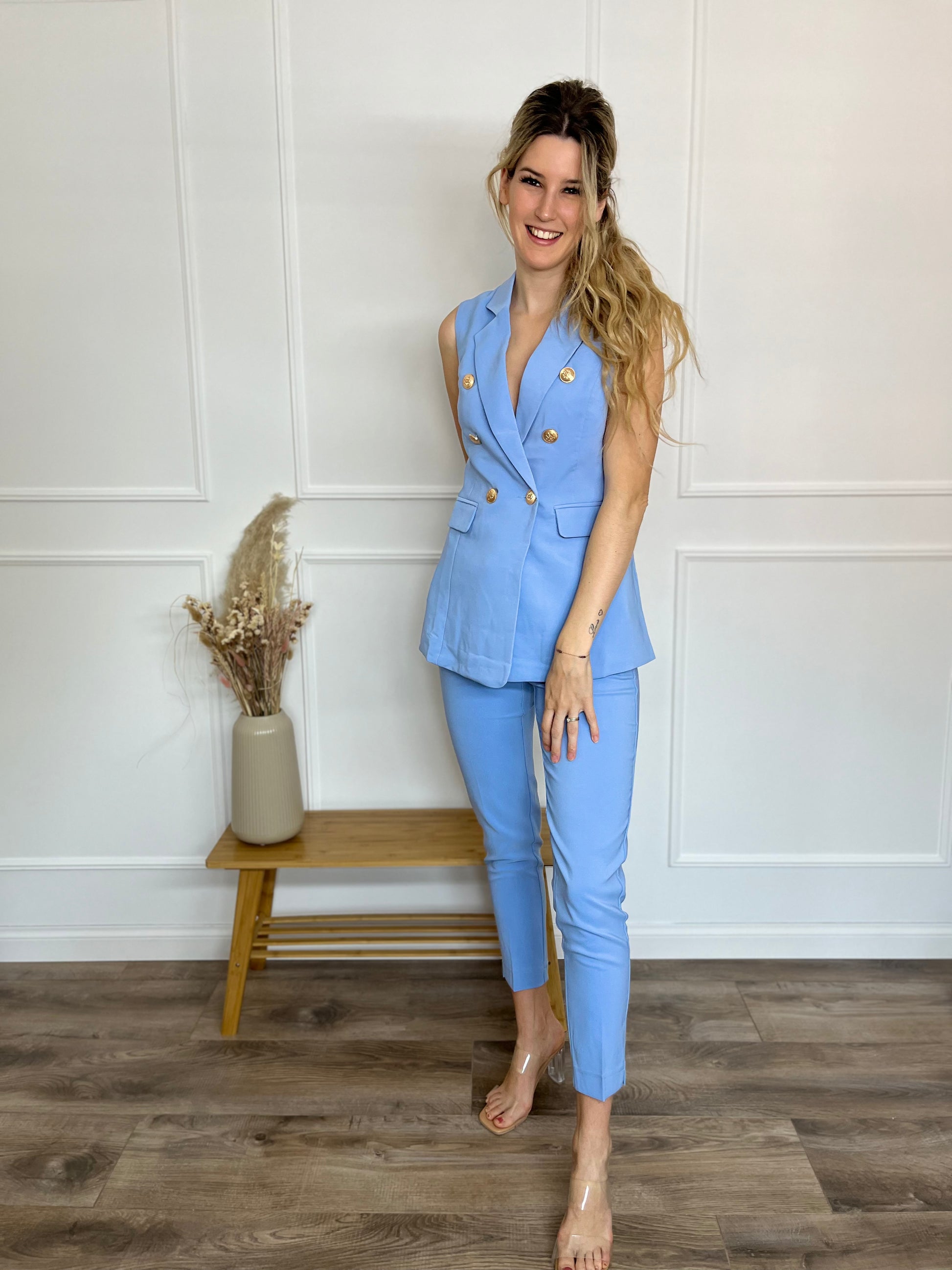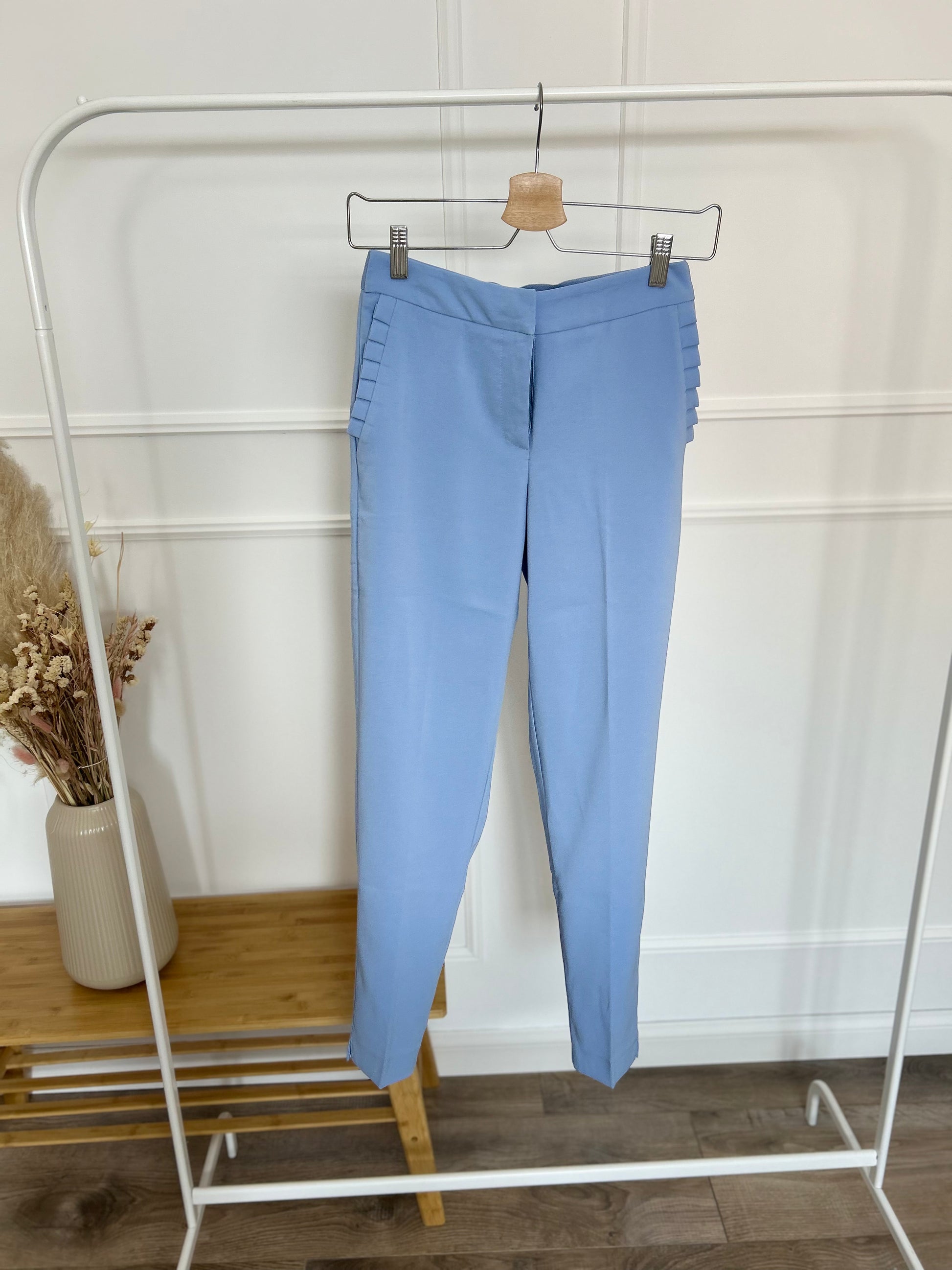Geklede broek met leuke afwerking aan de zakken en een elastische band achteraan.