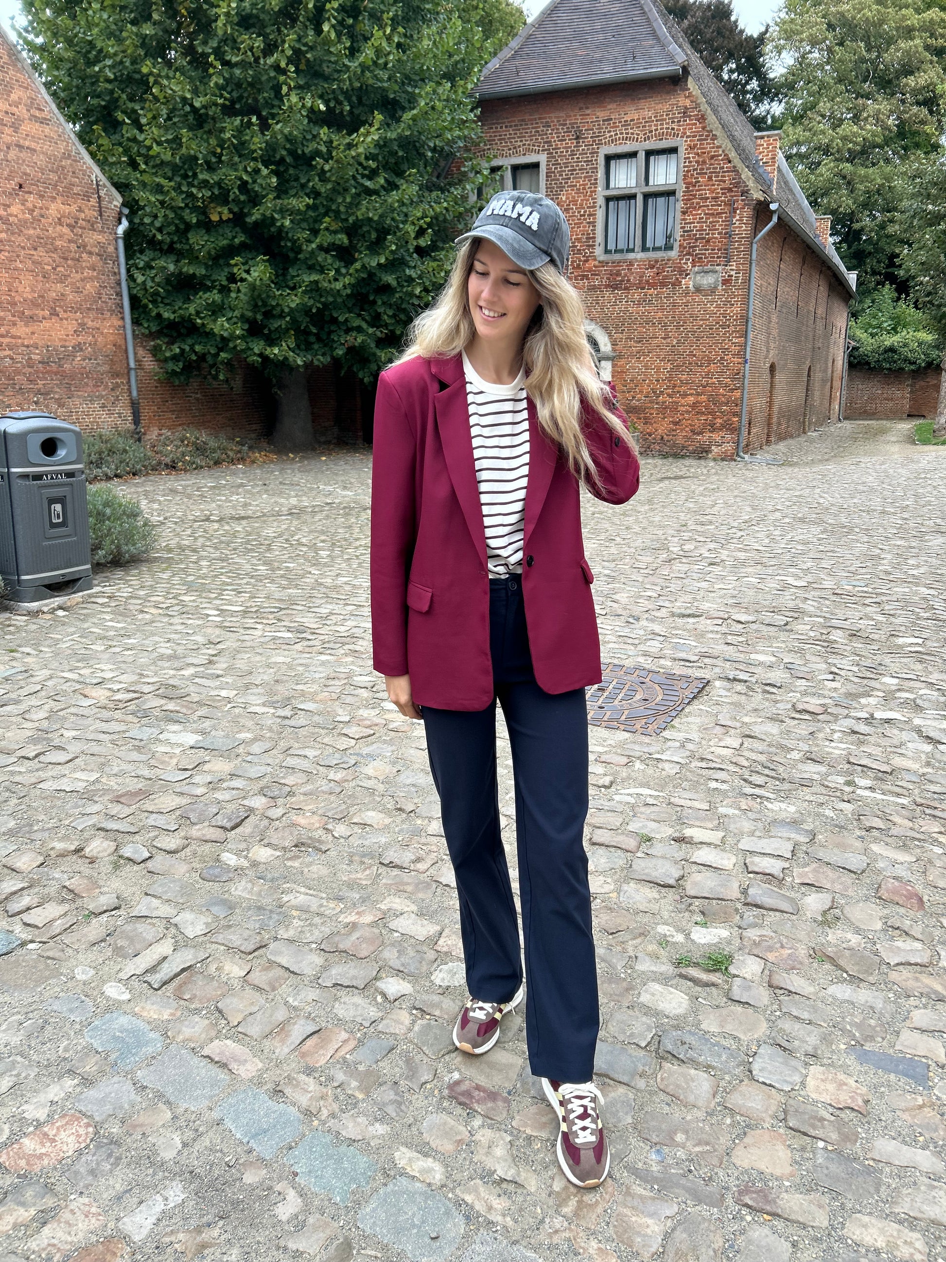 Yorin is een wijde broek van een viscose/nylon mix met een knoopsluiting en gesloten paspelzakken aan de achterkant. Het heeft ook elastiek in de tailleband aan de achterkant voor een comfortabele pasvorm.