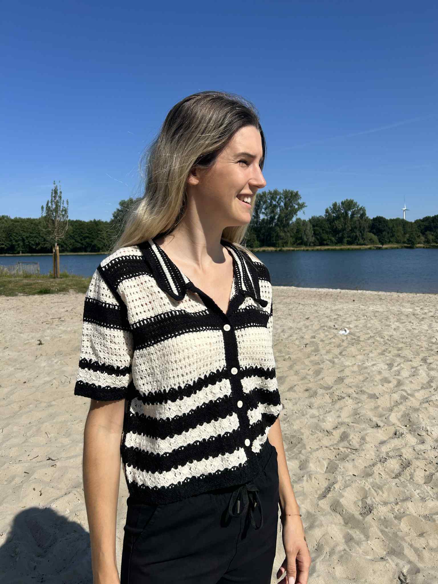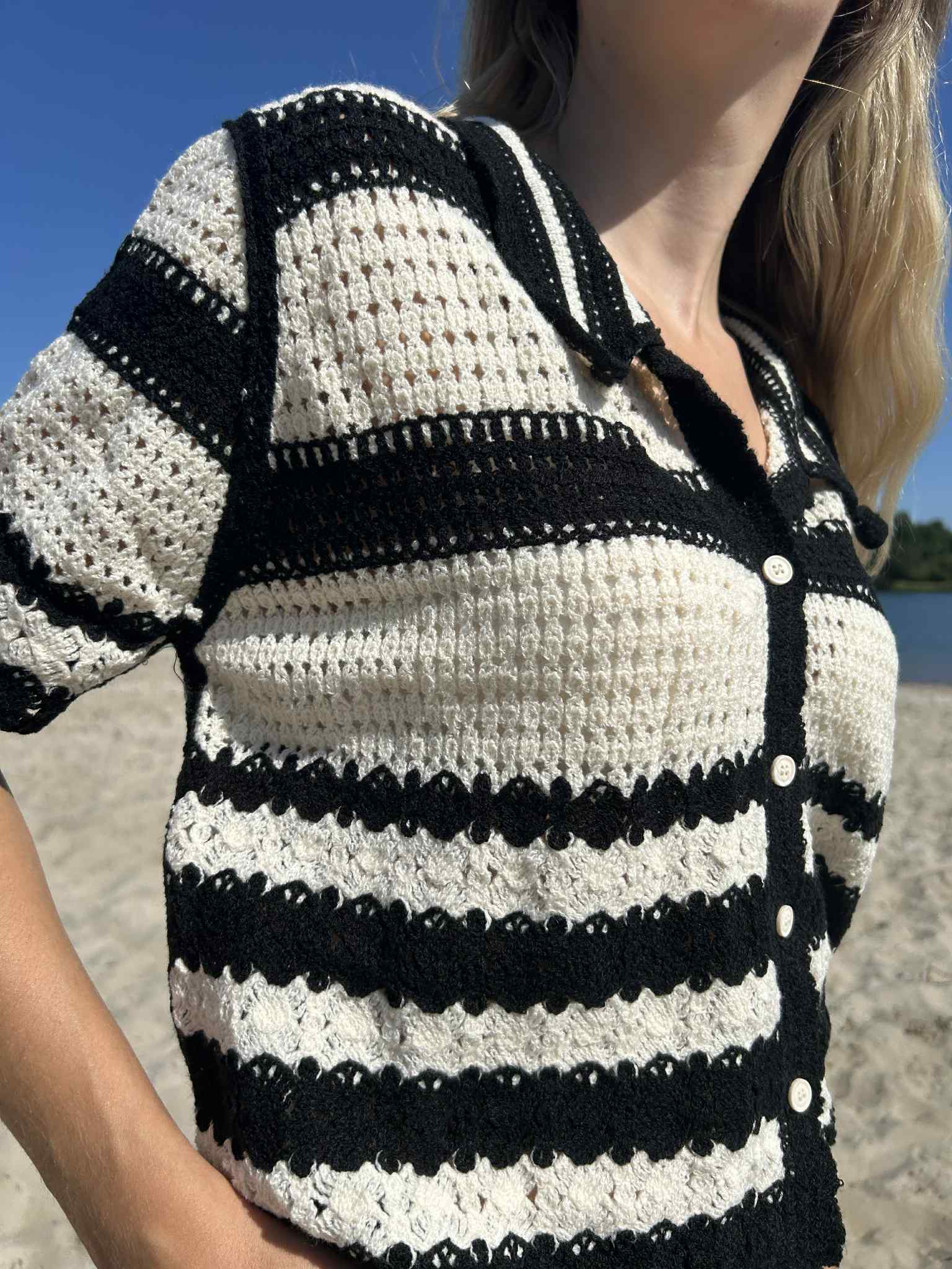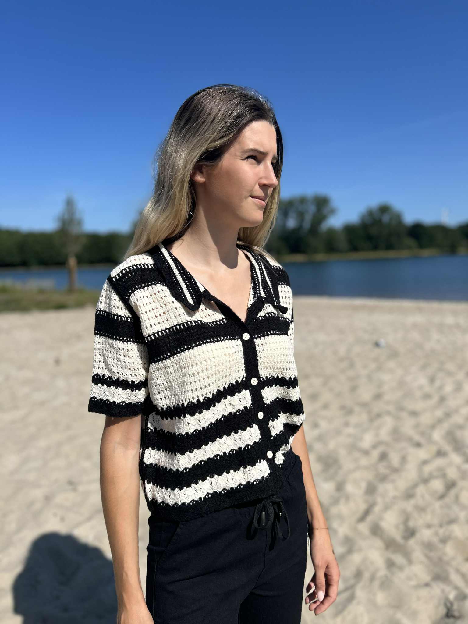 Deze gehaakte T-shirt bestaat uit kleine tweekleurige haak. Aan de voorkant bevinden zich kleine knoopjes en het is een recht modelletje. Wij hebben het T-shirt gecombineerd op onze "BROEK DODO" of "ROK JUDY" want samen vormen ze een mooi geheel.