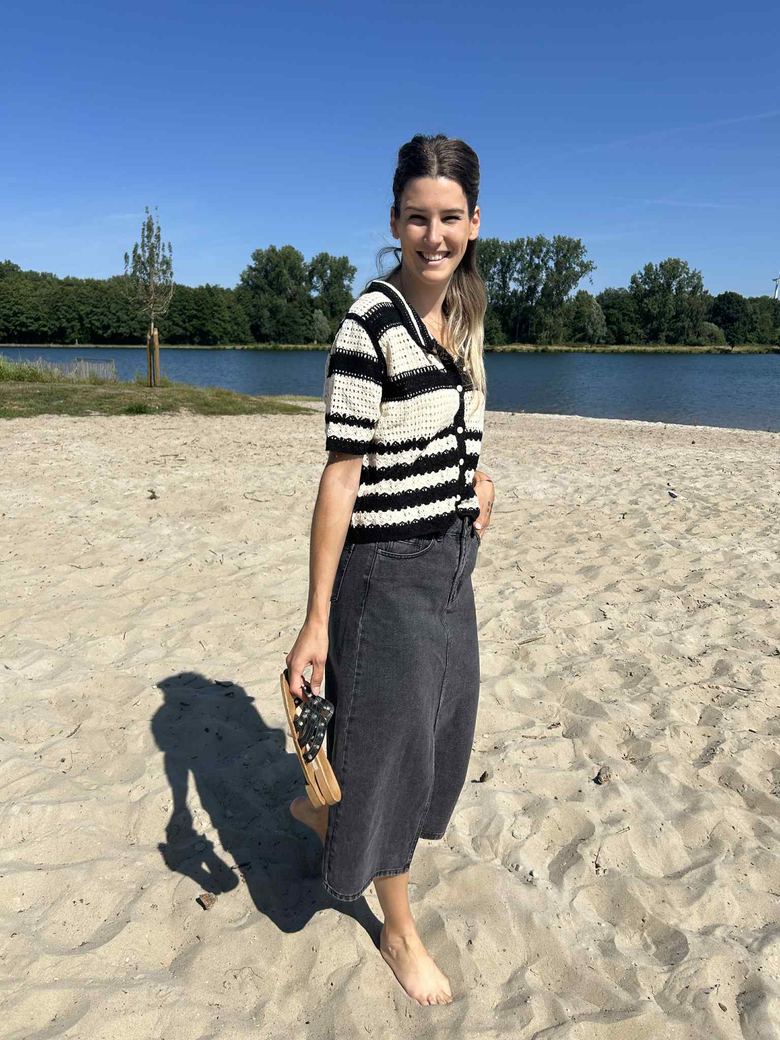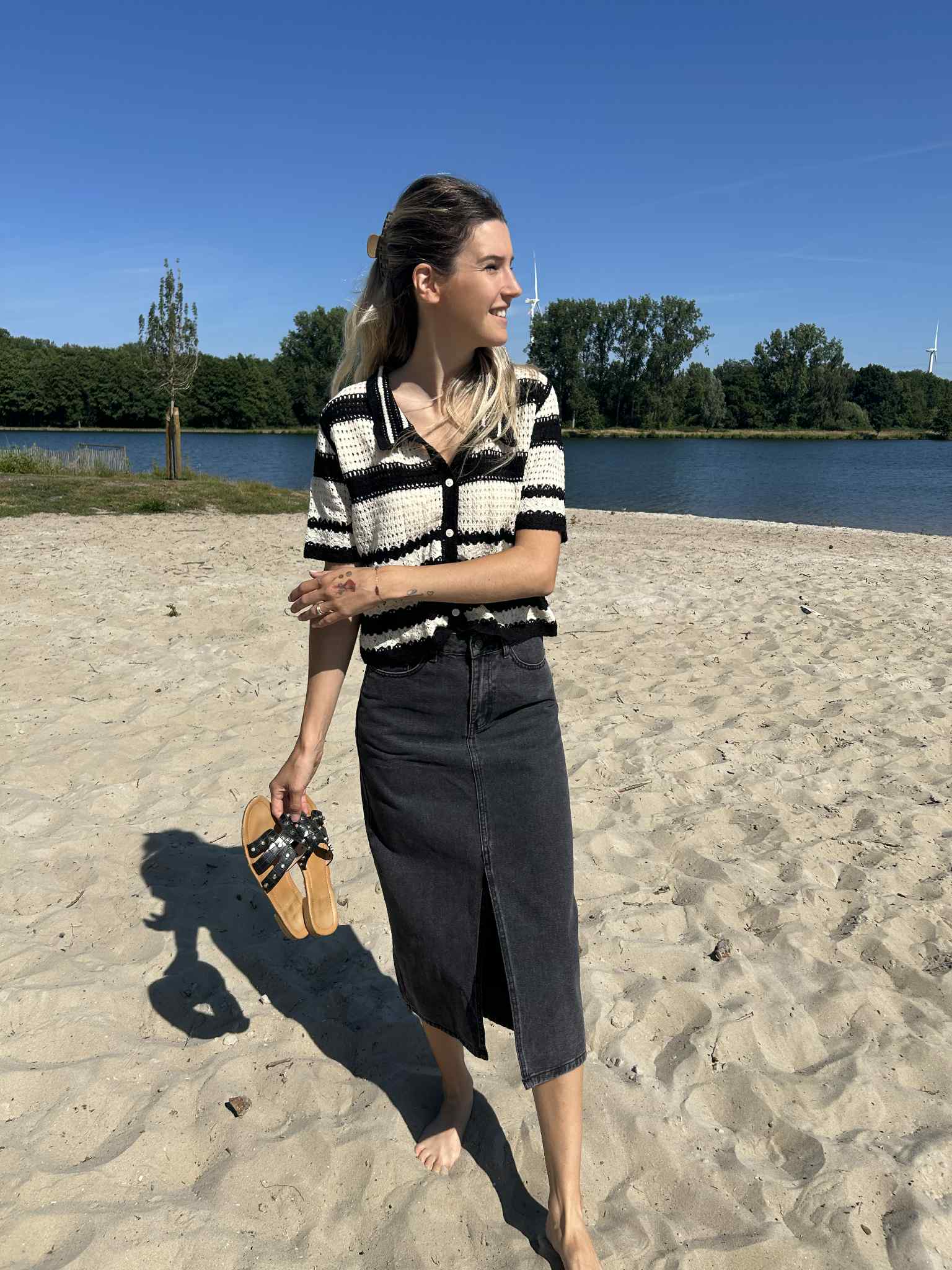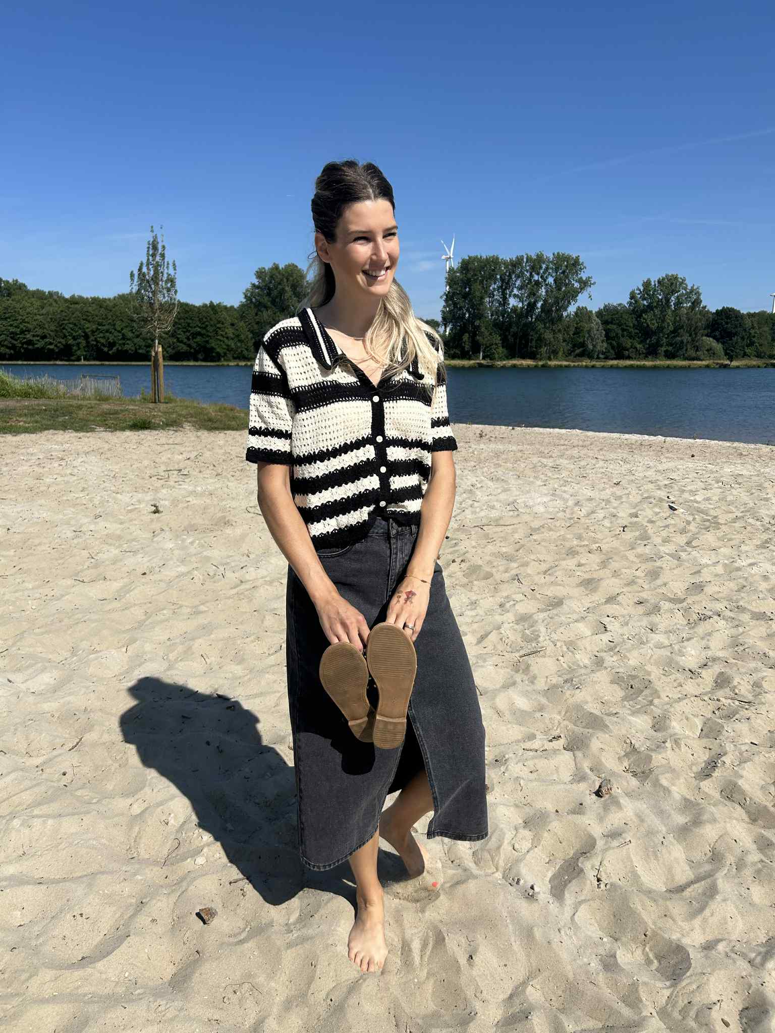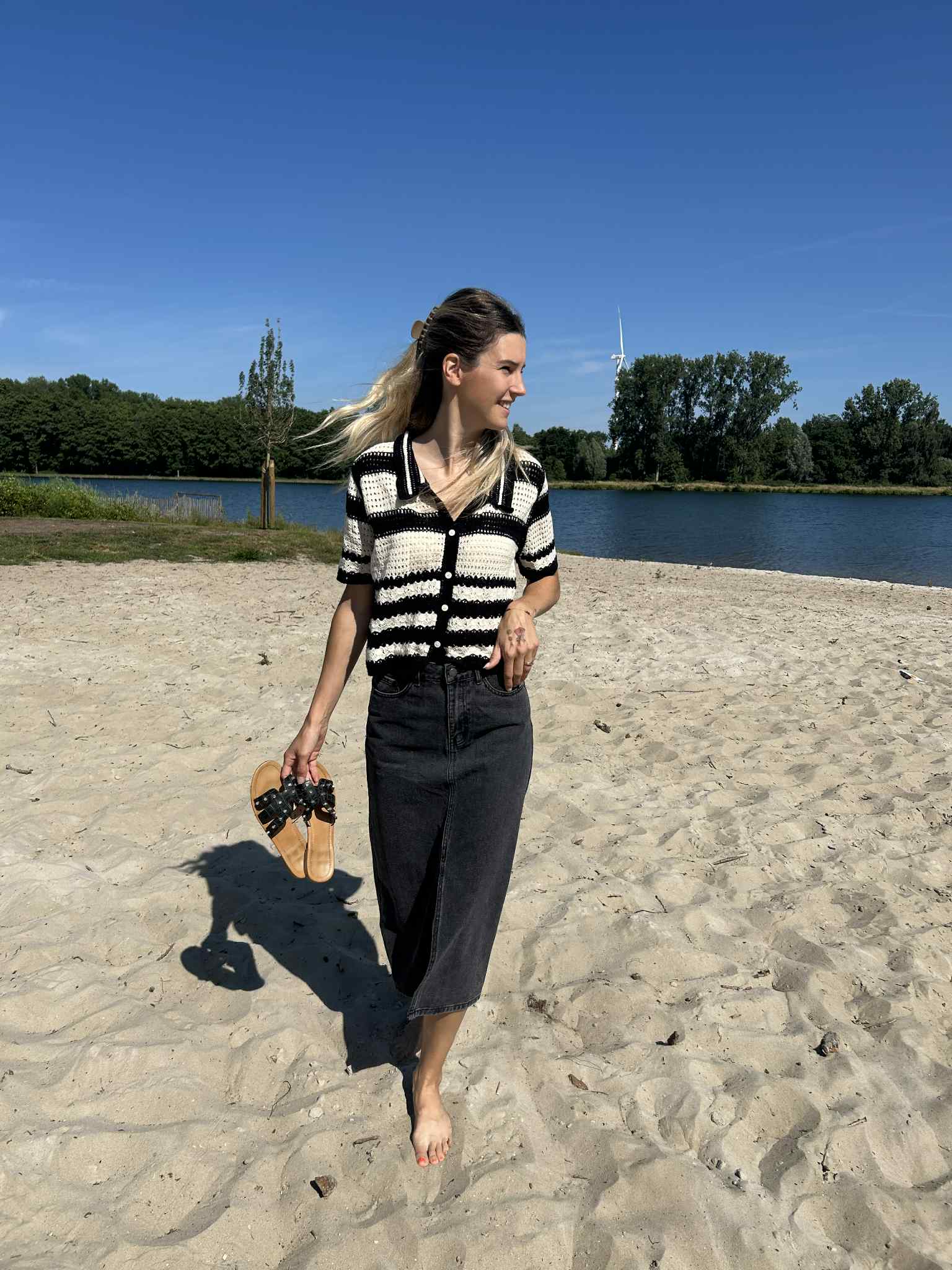 Deze gehaakte T-shirt bestaat uit kleine tweekleurige haak. Aan de voorkant bevinden zich kleine knoopjes en het is een recht modelletje. Wij hebben het T-shirt gecombineerd op onze "BROEK DODO" of "ROK JUDY" want samen vormen ze een mooi geheel.