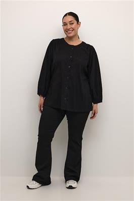 Leuk zwart los katoenen hemd. Het is een losvallend, pof model. De mouwen zijn los en hebben onderaan een boord. Het hemd heeft knopen van boven tot onder als sluiting. Het is een dun stofje en licht doorschijnend maar zeker niet storend!