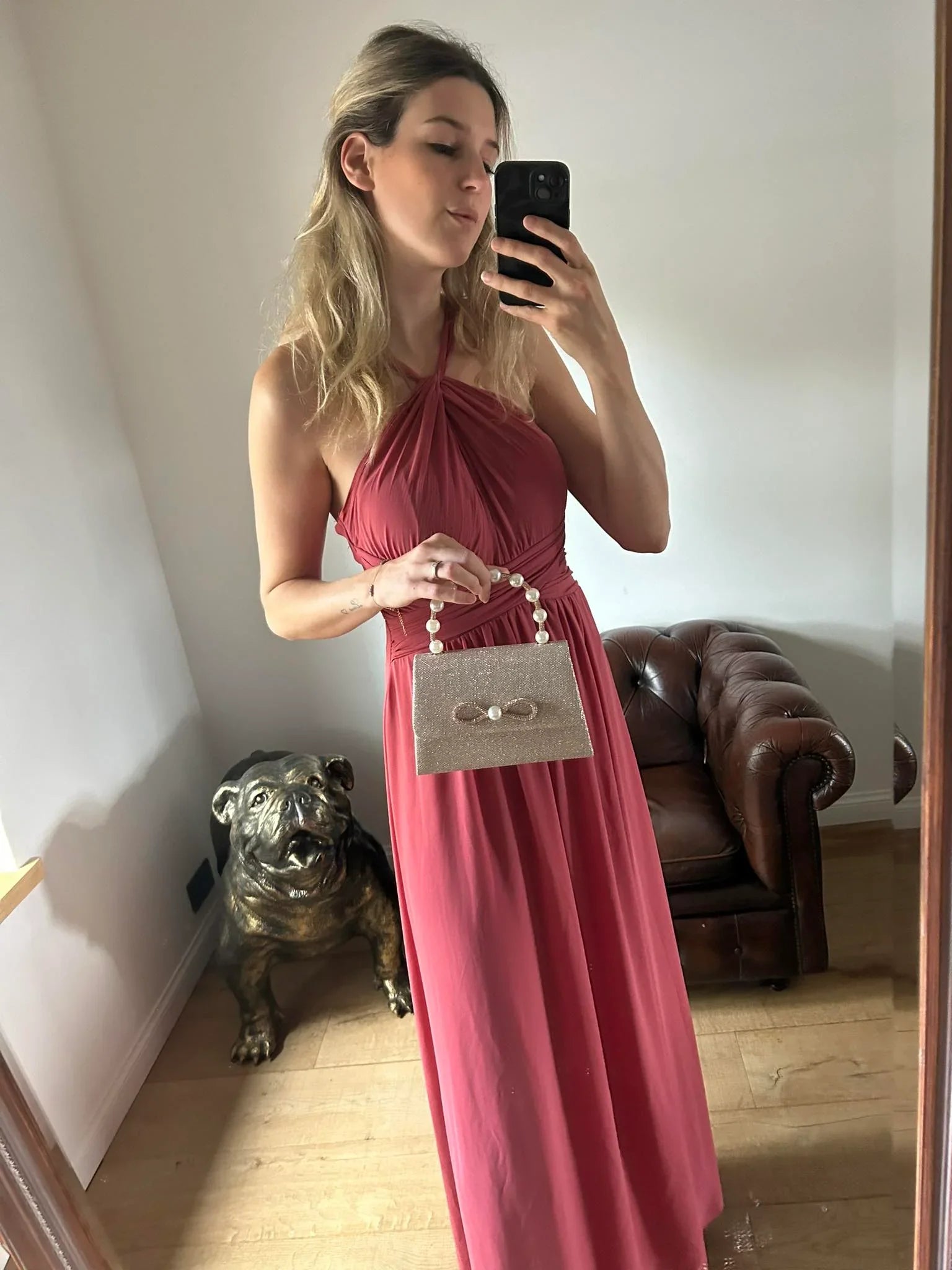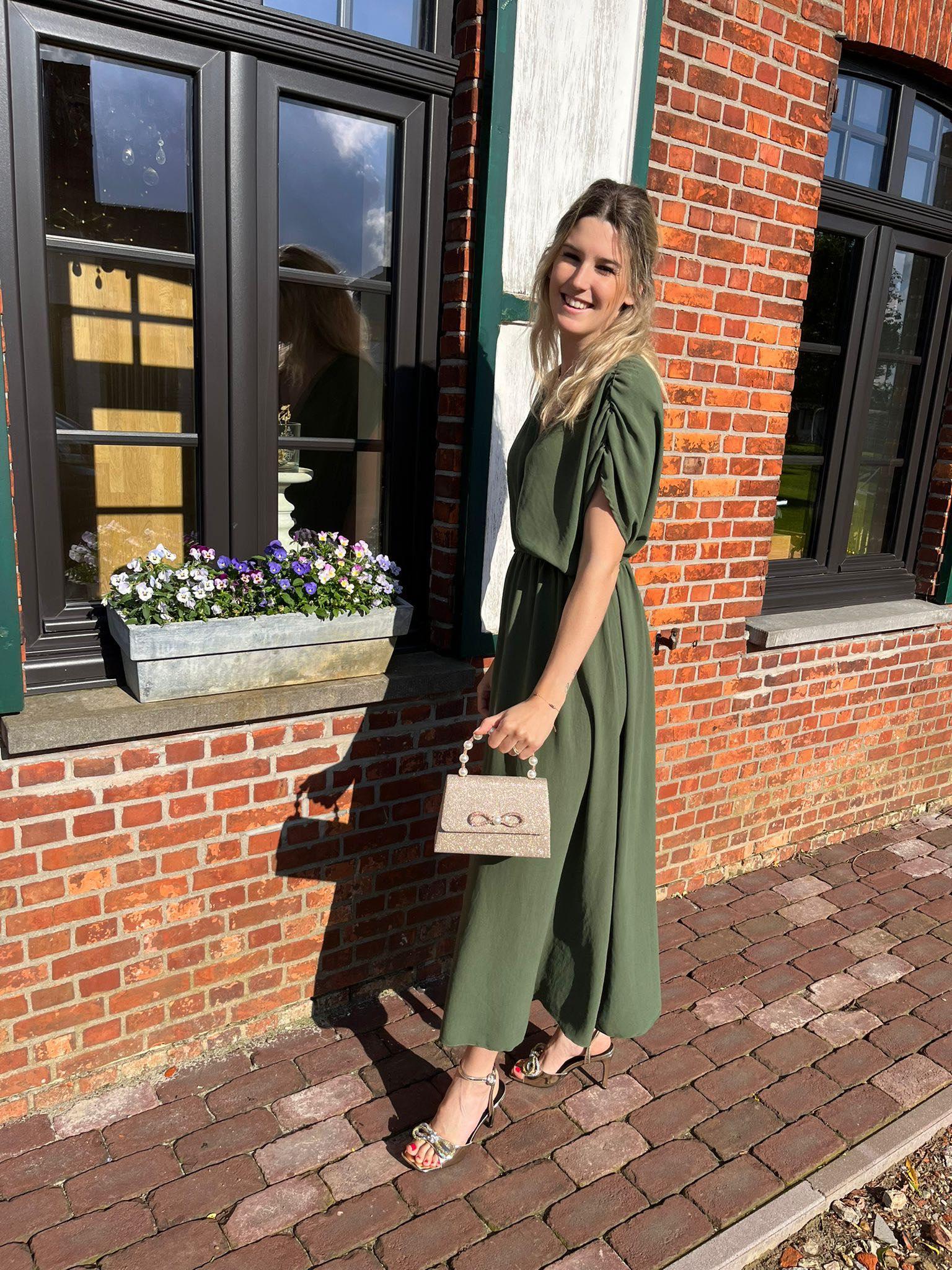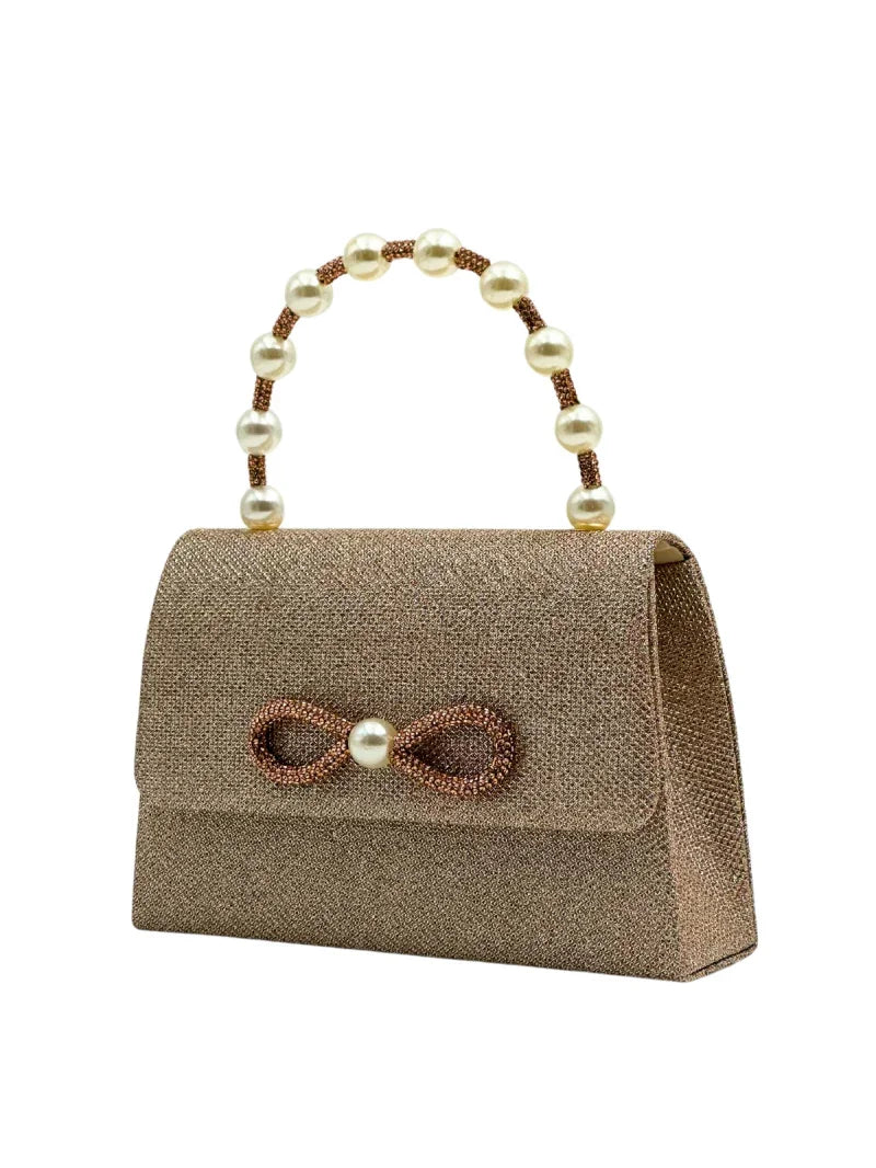 Mooie gouden handtasje met een strikje en een parel handvat.