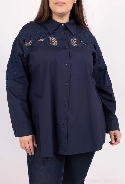 Elegant katoenen poplin shirt, versierd met ton-sur-ton borduursels op de mouwen en voorkant voor een verfijnde touch. Het is een oversized hemd dat sluit met knopen van onder tot boven. We hebben dit hemd in 2 verschillende maten: 42/44 en 46/48.