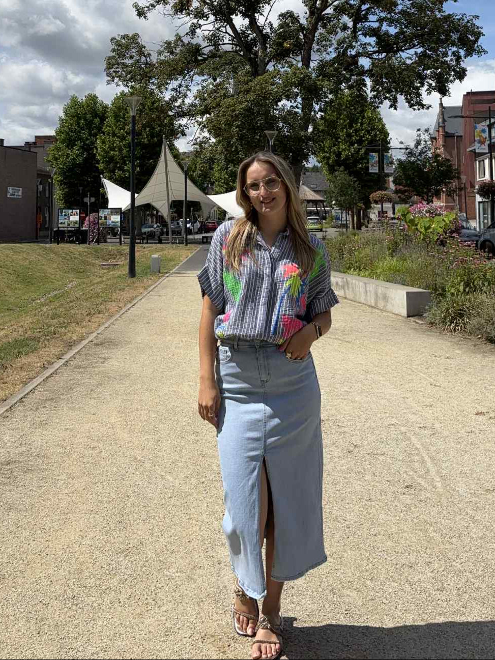 Blauw gestreept hemdje in een oversized model. Het hemdje heeft knoopjes vooraan. Het hemdje heeft losse korte mouwtjes en is lekker fris om te dragen omwille van het linnen dat er in zit. Het hemdje heeft mooie kleurrijke tekeningen er op gedrukt. Dit T-shirt hebben we in 1 maat en kan van maat 36 tem maat 44 gedragen worden.