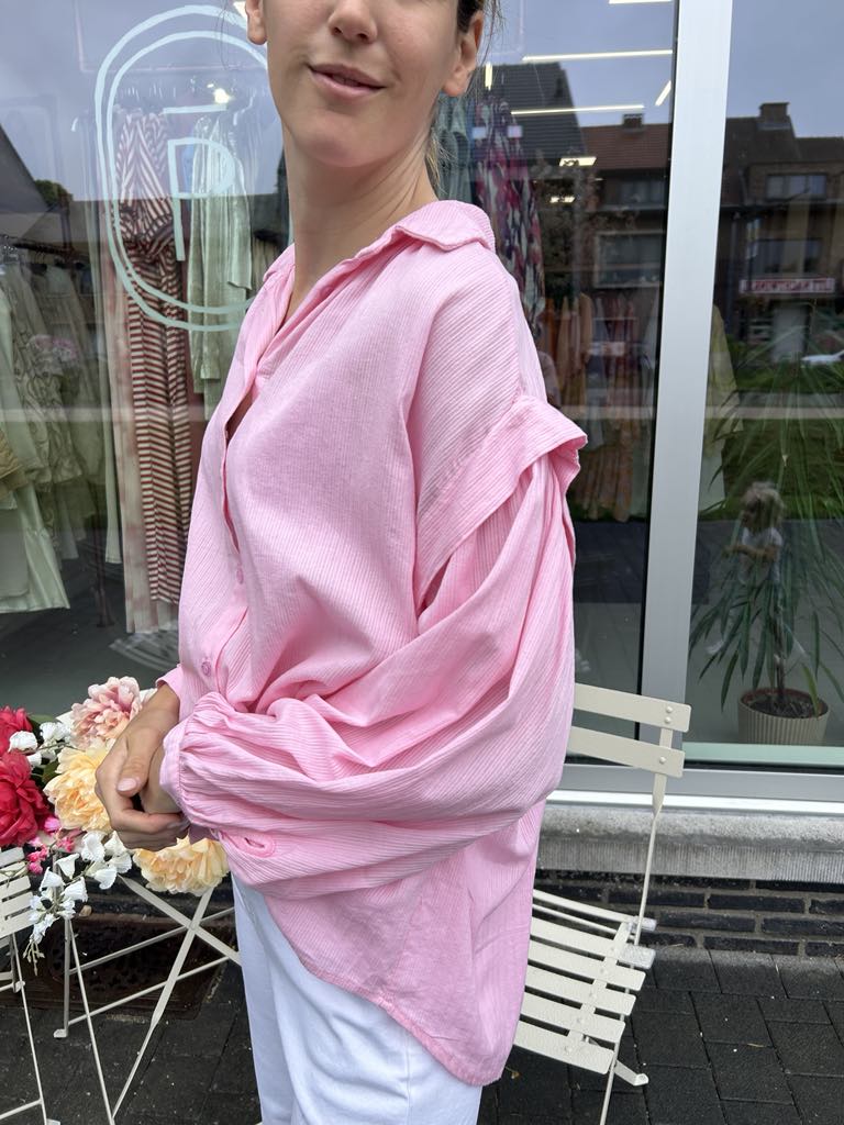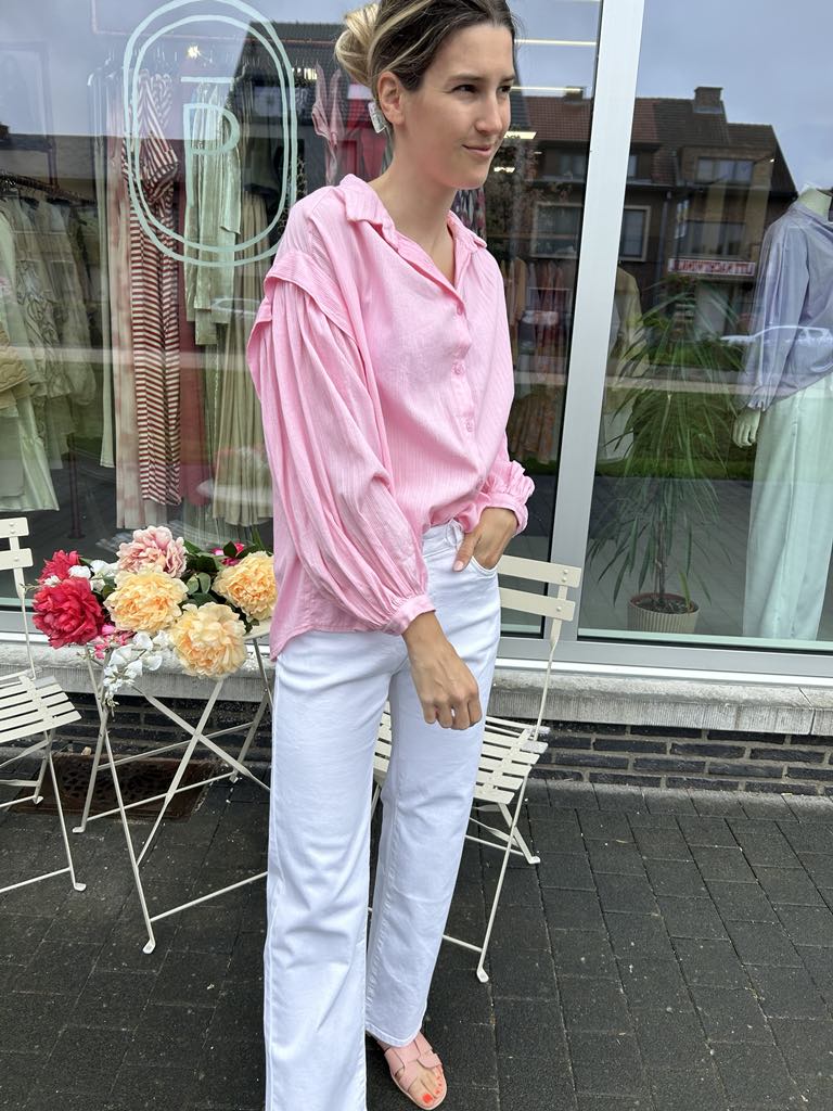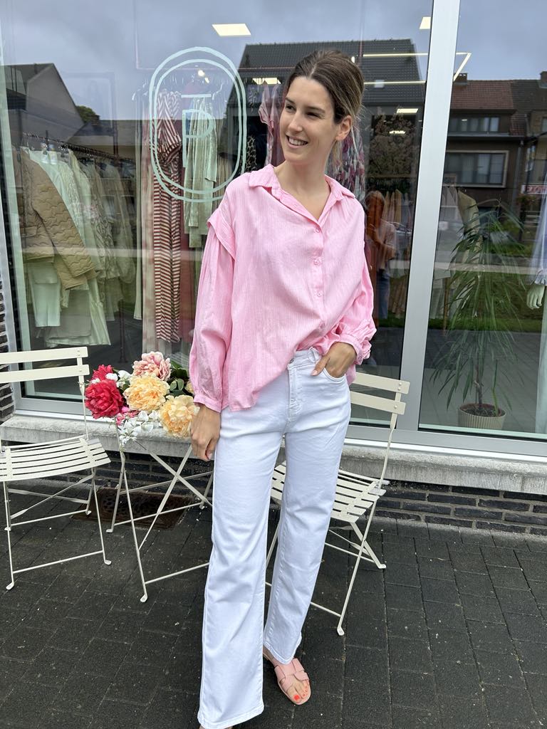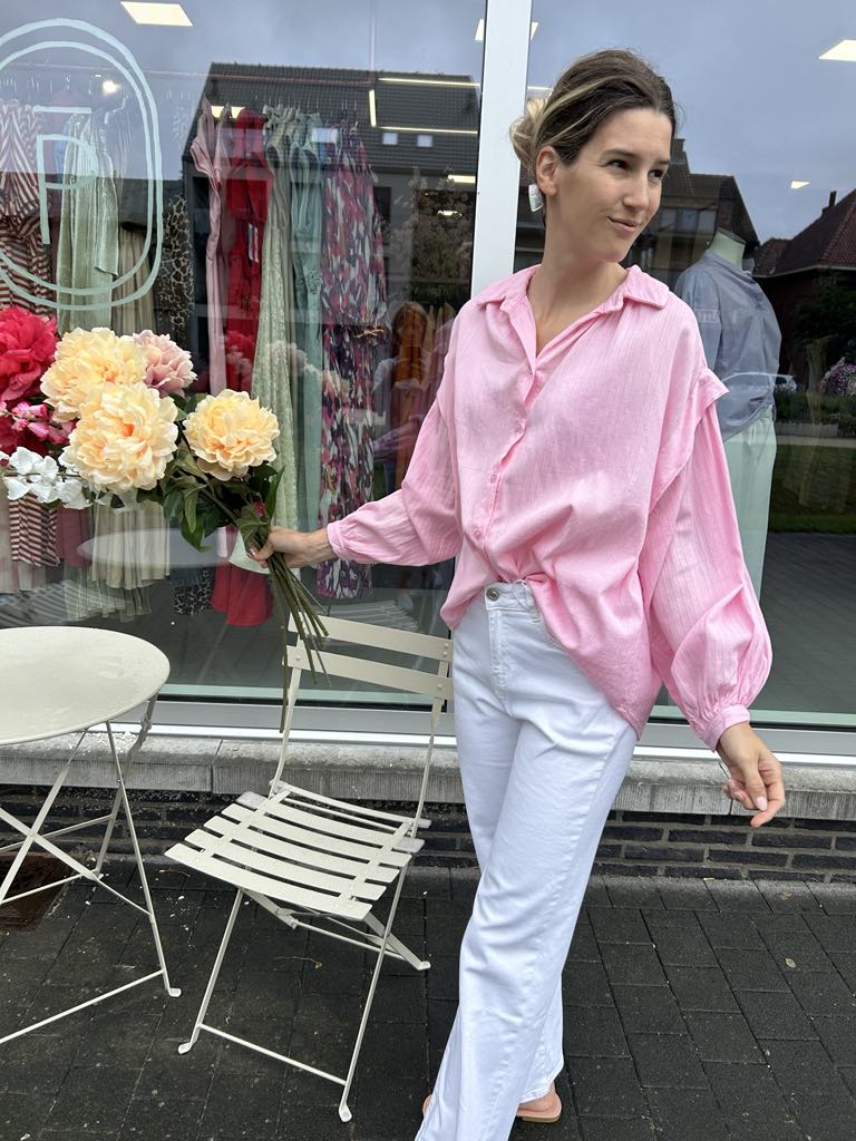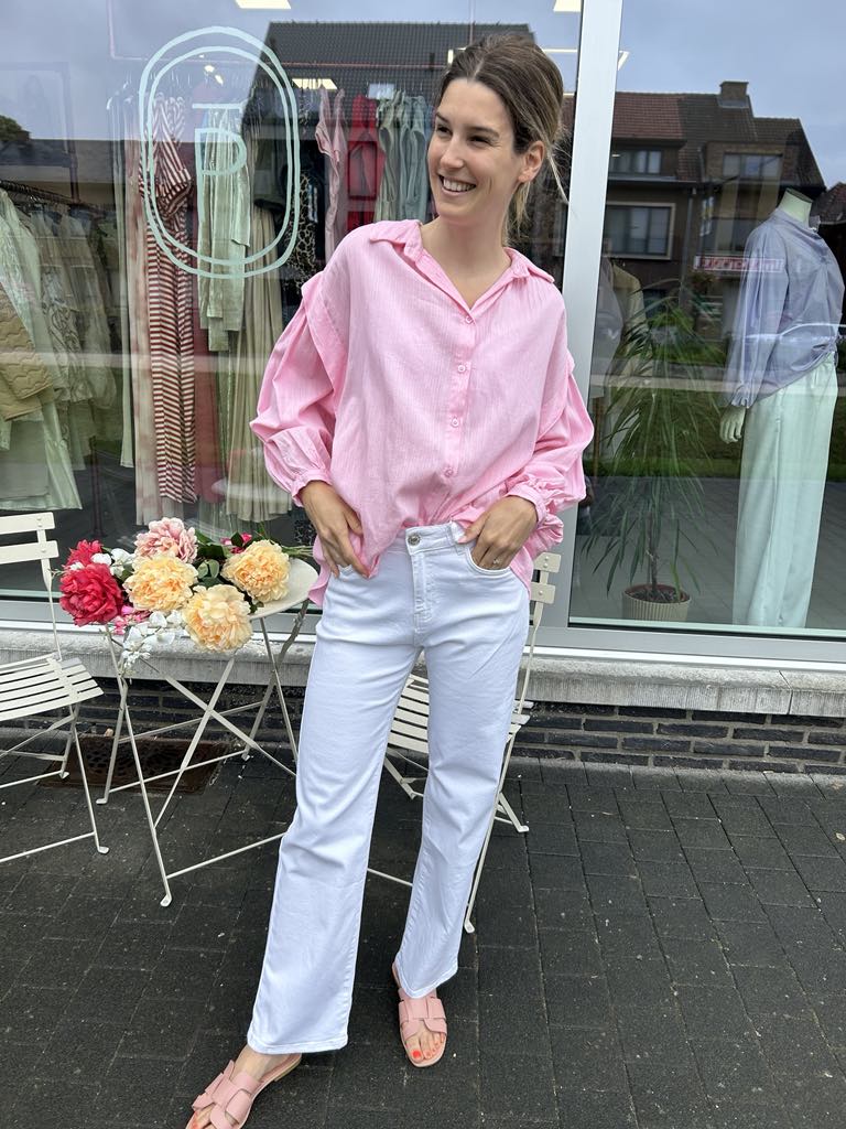 Het is een dunne hemdsblouse met een detail aan de mouw en leuke streepjes. Dit hemd sluit vooraan met knoopjes ook is deze afgewerkt met een hele mooie kraag. Wij combineerden het hemd met onze ‘JEANS NOVO WIT’. Dit hemd is TU en past van maat 36 tot 42. We hebben dit hemd in de kleur geel en roze.