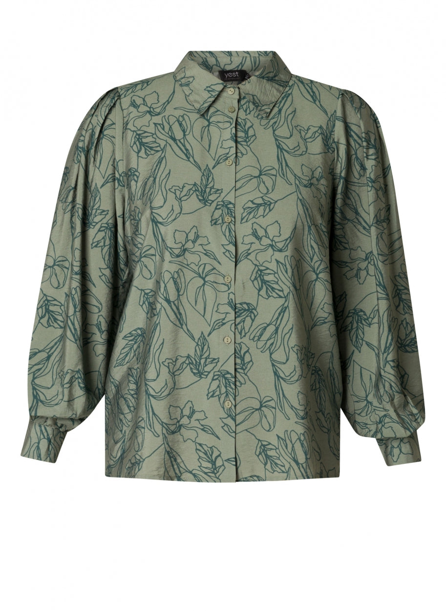 Deze blouse met groen dessin is vervaardigd van 85% Ecovero viscose, een duurzame en milieuvriendelijke stof. De blouse heeft een platte kraag en een knoopsluiting aan de voorzijde. De plooien op de schouderkop voegen een subtiele, verfijnde detail toe aan het ontwerp.