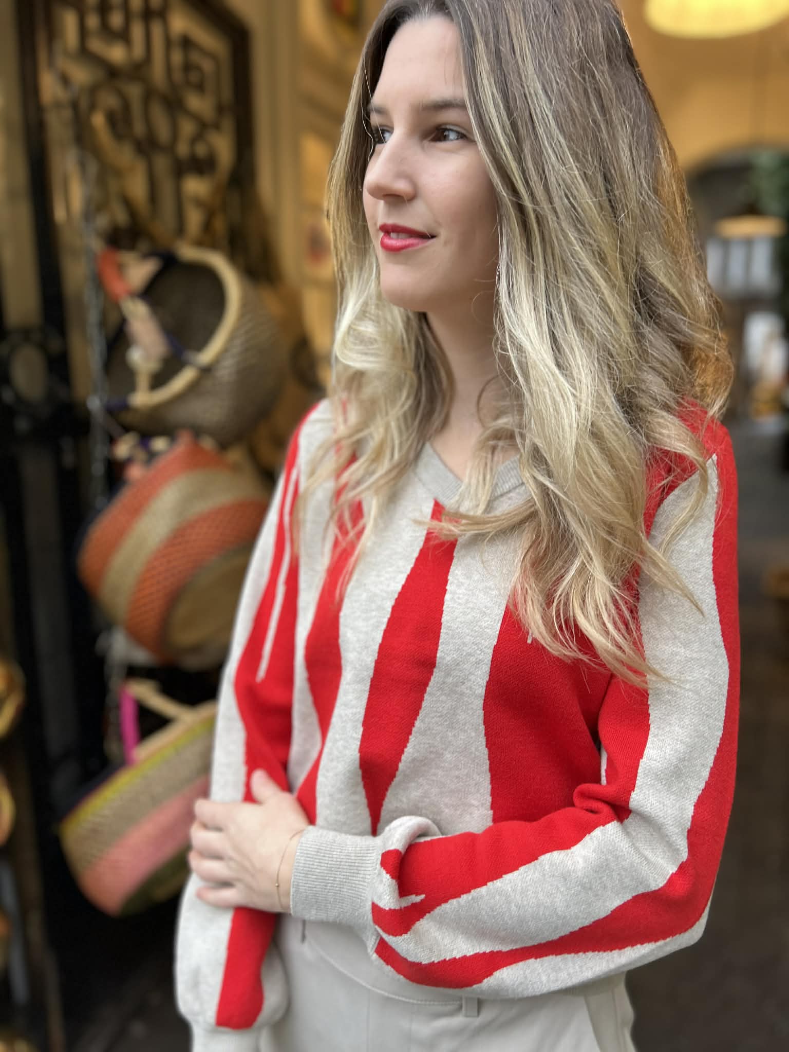 Statement knit alert! De Suvi trui combineert een zachte feel met een krachtige jacquardprint. De wijde mouwen en V-hals geven een moderne twist, terwijl de soepele stof heerlijk draagt. Verkrijgbaar in rood en zwart – opvallend, comfortabel en klaar om gezien te worden.