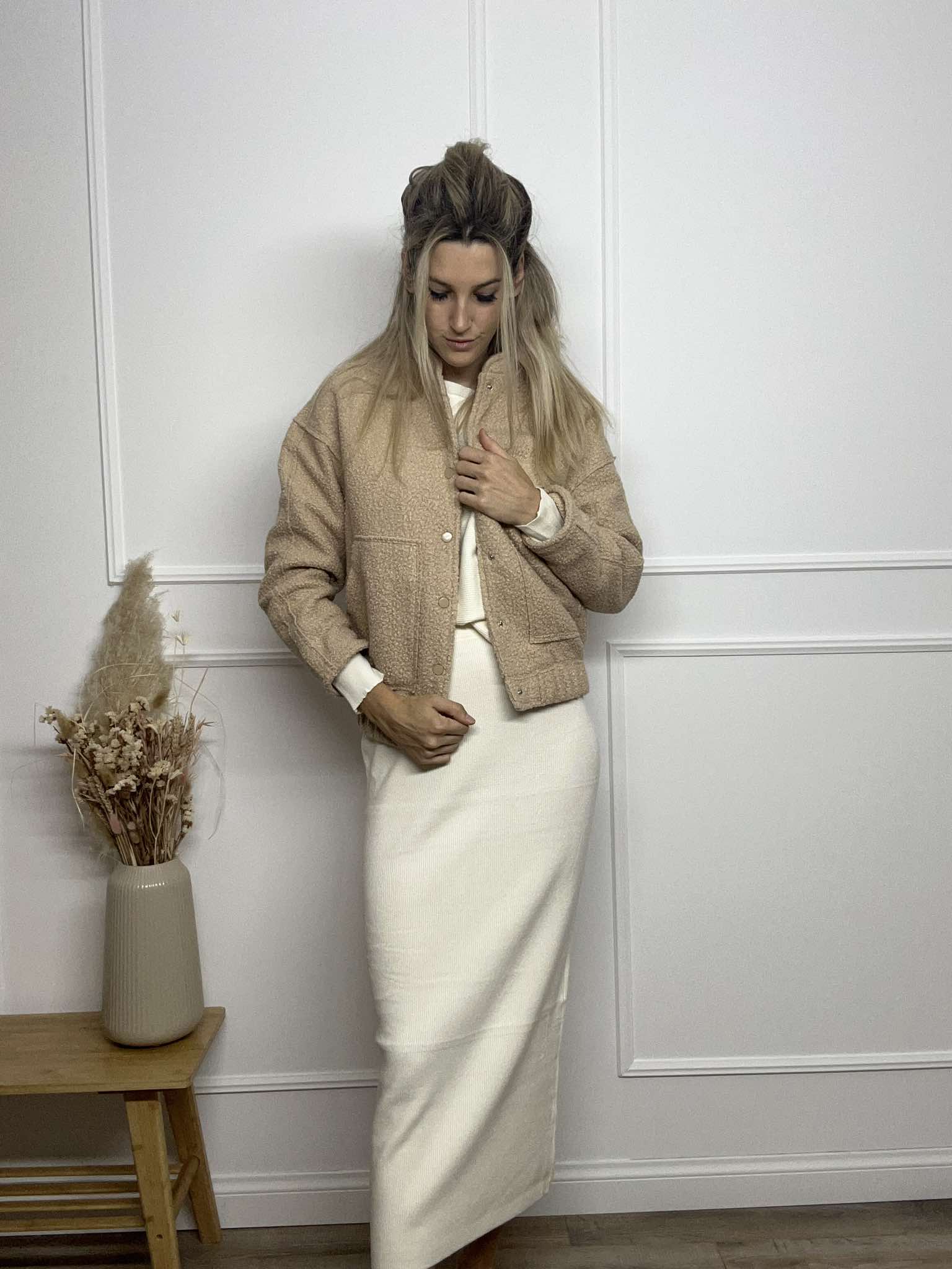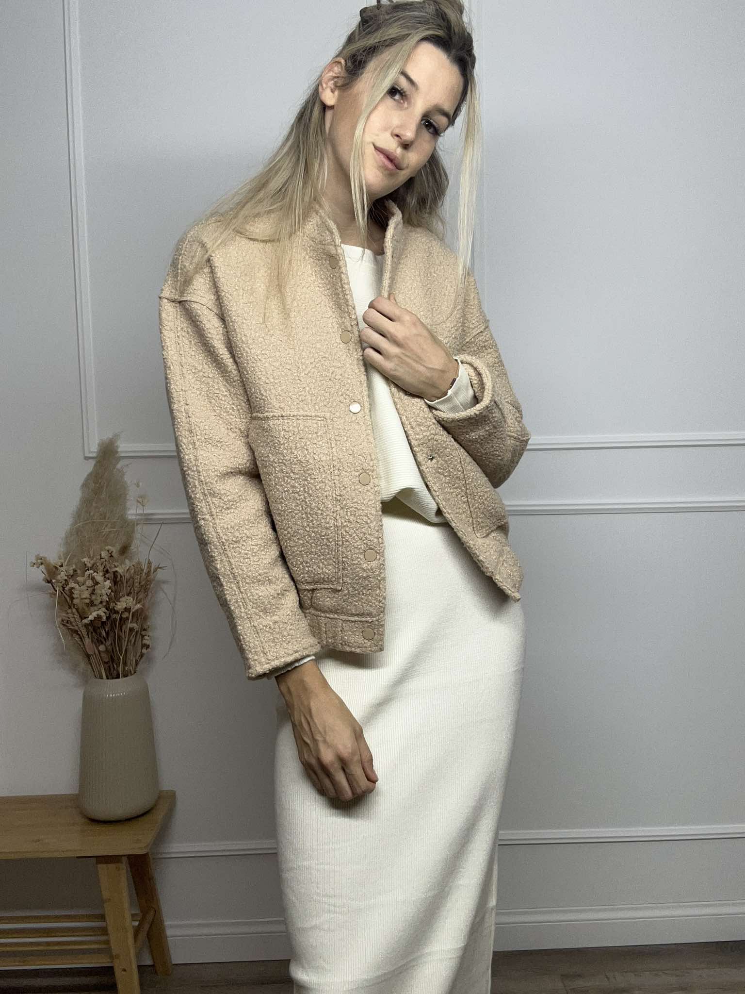 Deze bomberjas heeft een bouclettes stof en is lekker zacht. Deze jas heeft een oversized model en heeft een elastische band aan de onderzijde. De jas sluit met knopen en heeft twee zakken. Deze jas is eindeloos combineerbaar door de neutrale kleur en leuke fit.