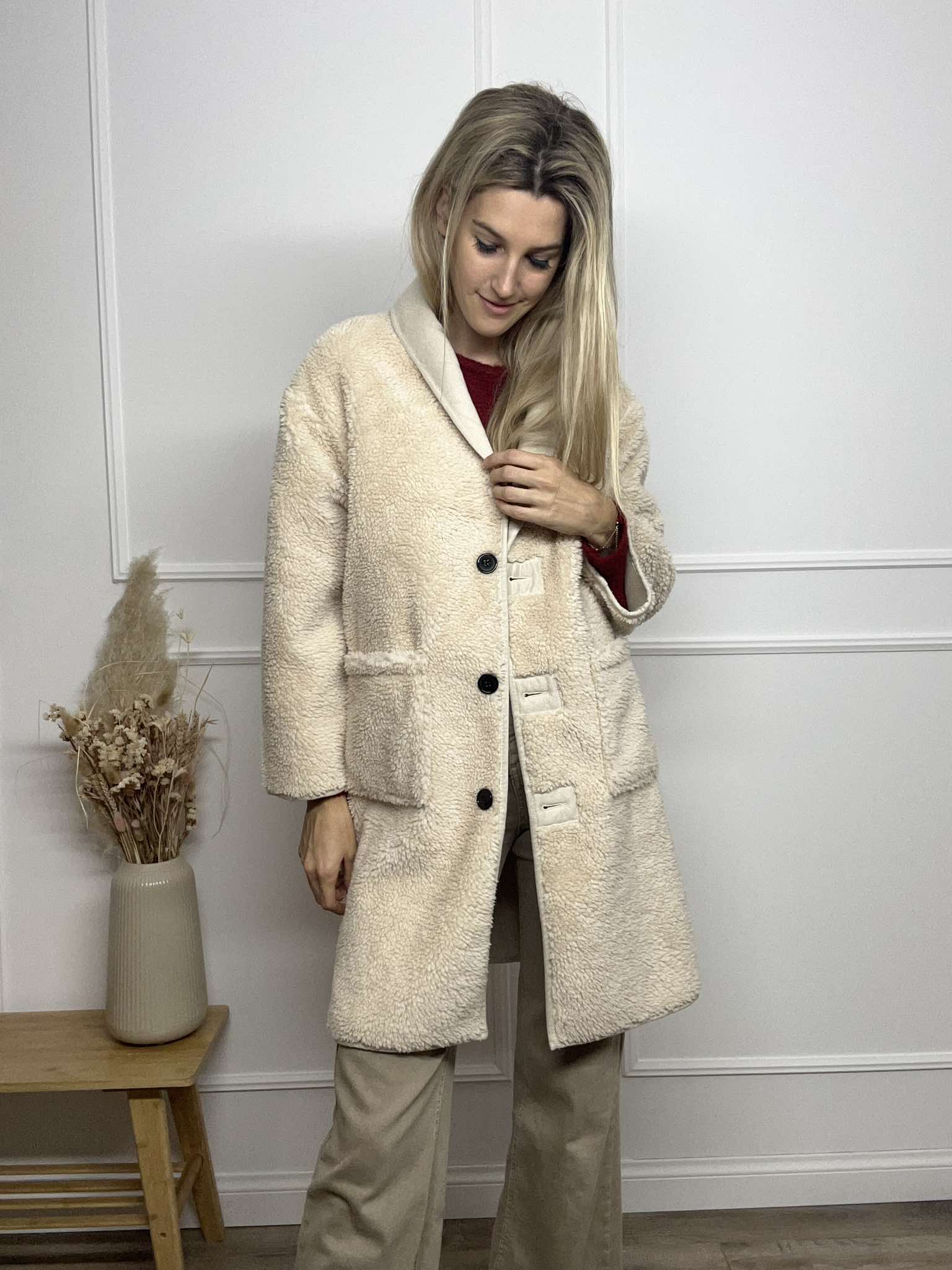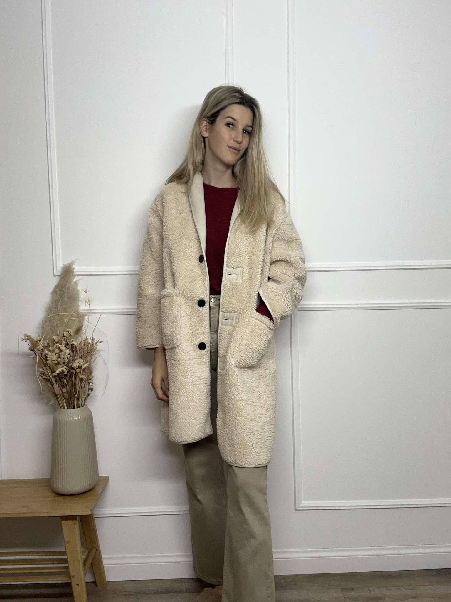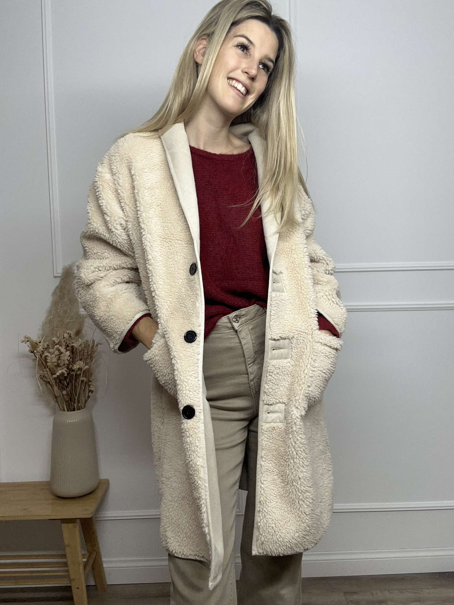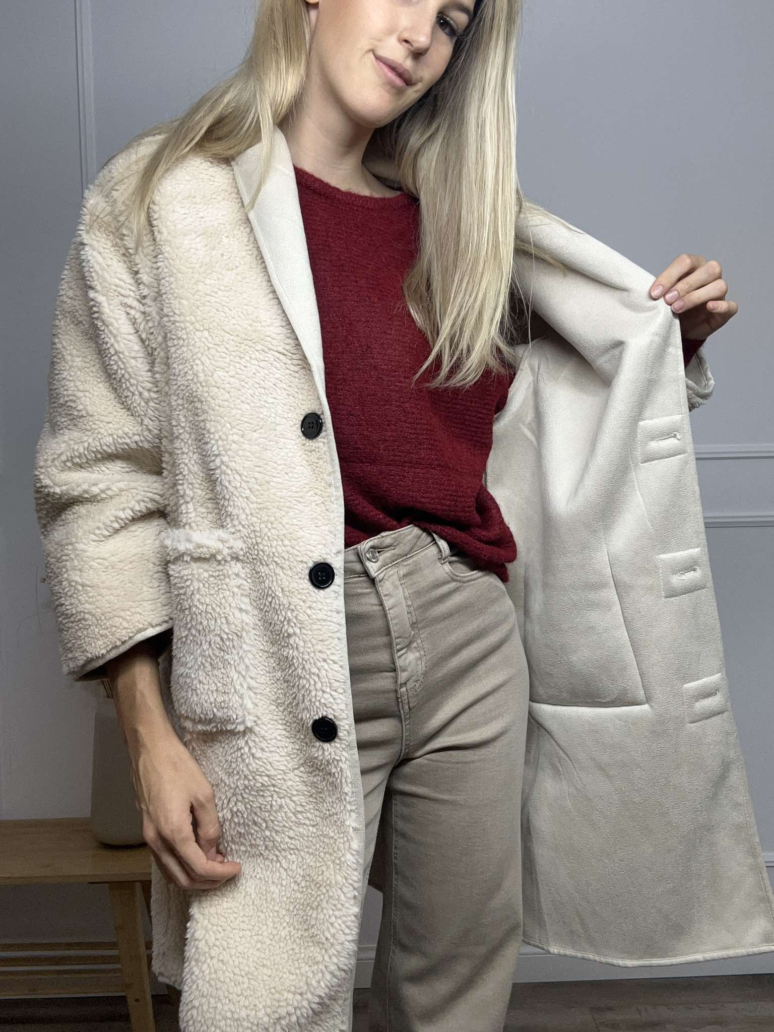 Deze jas is gemaakt van een super zachte wollen stof aan de buitenkant! Aan de binnenkant bevindt zich een vacht stof. De jas sluit met drie knopen en heeft twee zakken. Je kan deze zowel open als dicht dragen. We hebben deze jas in twee maten XS/S en M/L.