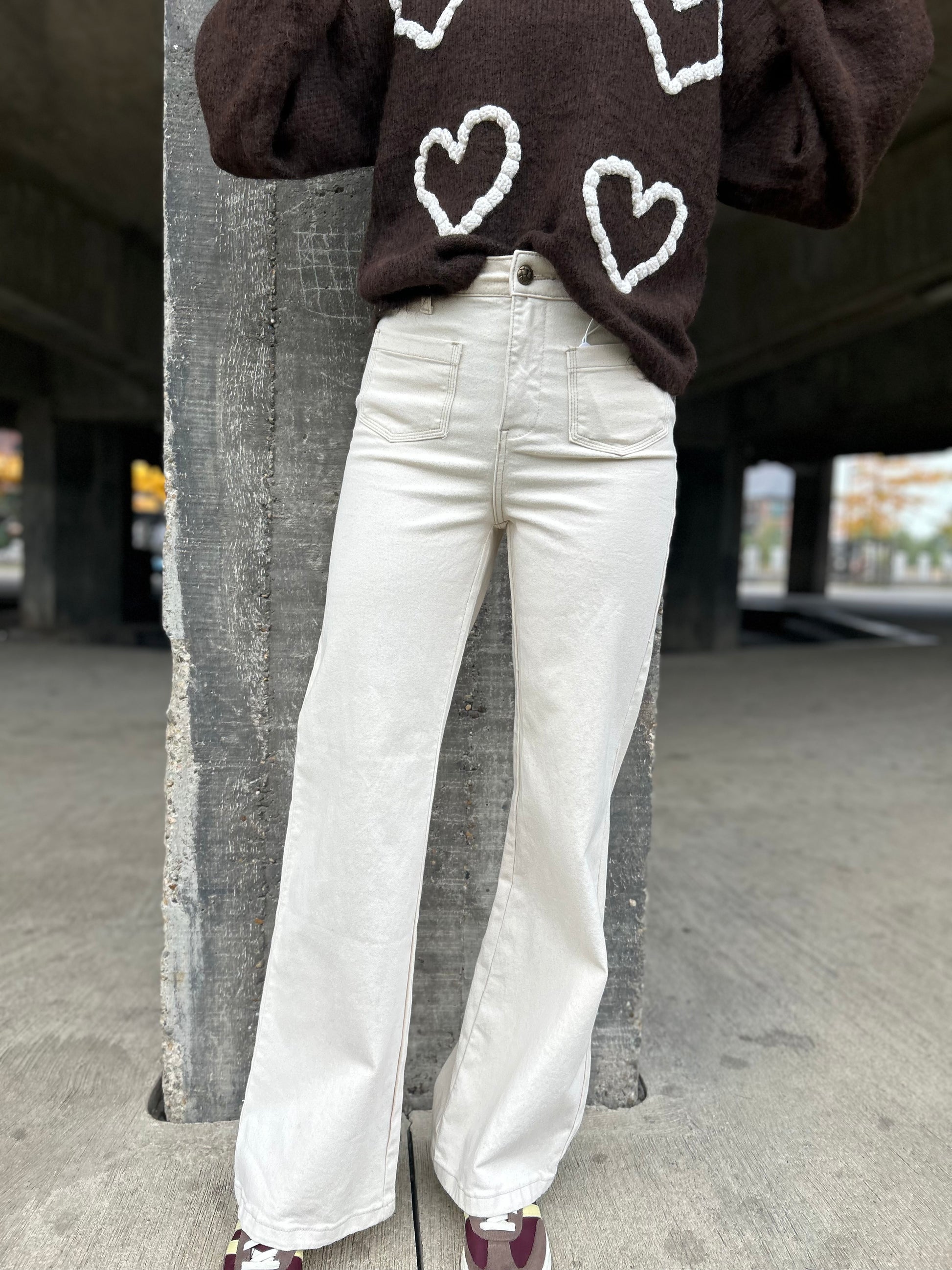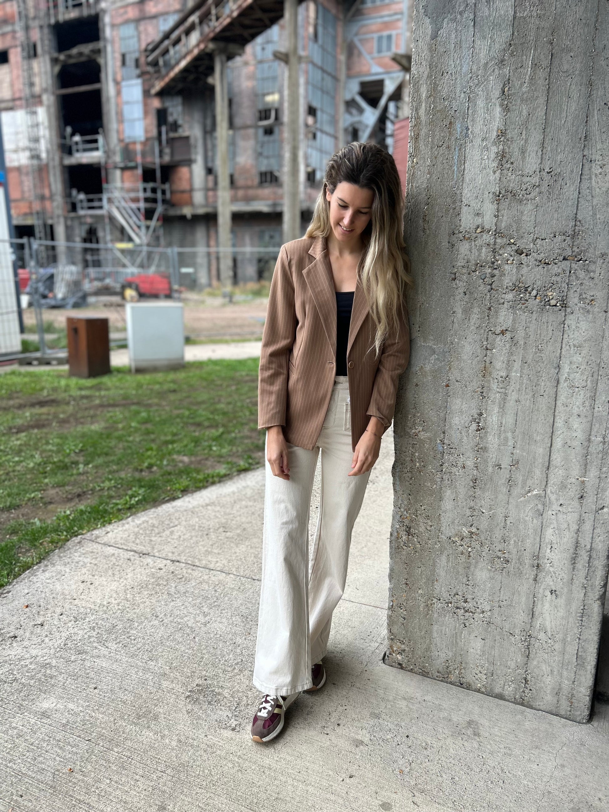 Jeans Gaspard is een wijde jeans met mooie zakken aan de voorkant. De jeans heeft een hoge taille met riemlus, rits- en knoopsluiting. De jeans heeft een mooie beige kleur en is van het merkje Oraije. Model Lien is 1m78 groot en draagt haar gebruikelijke maat 36 in deze jeans.