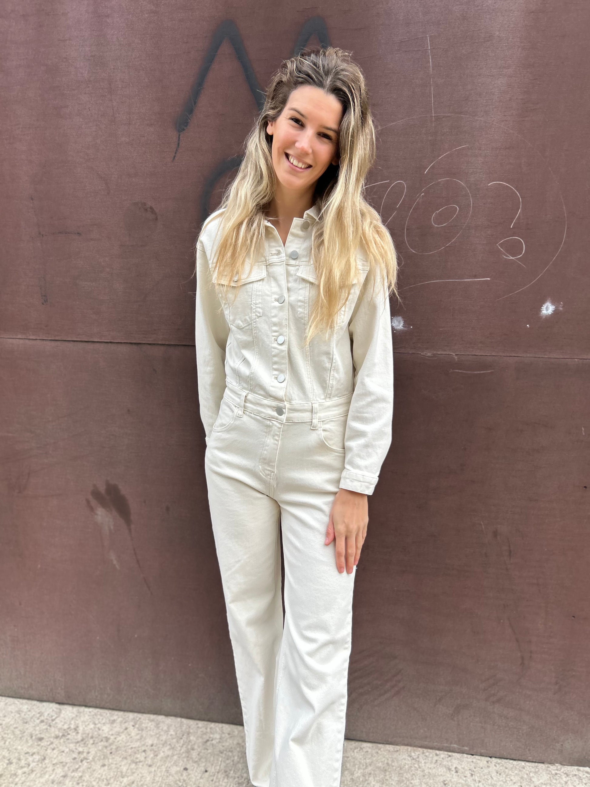 Jumpsuit Celine is een gebroken wit denim jumpsuit. Het bovenstuk sluit met knopjes en op de borst bevinden zich zakken. De broek heeft een ritssluiting alsook handige zakken. De jumpsuit heeft een bovenaan een aanpassende fit. De pijpen zijn breed en de jumpsuit bevat geen stretcht.