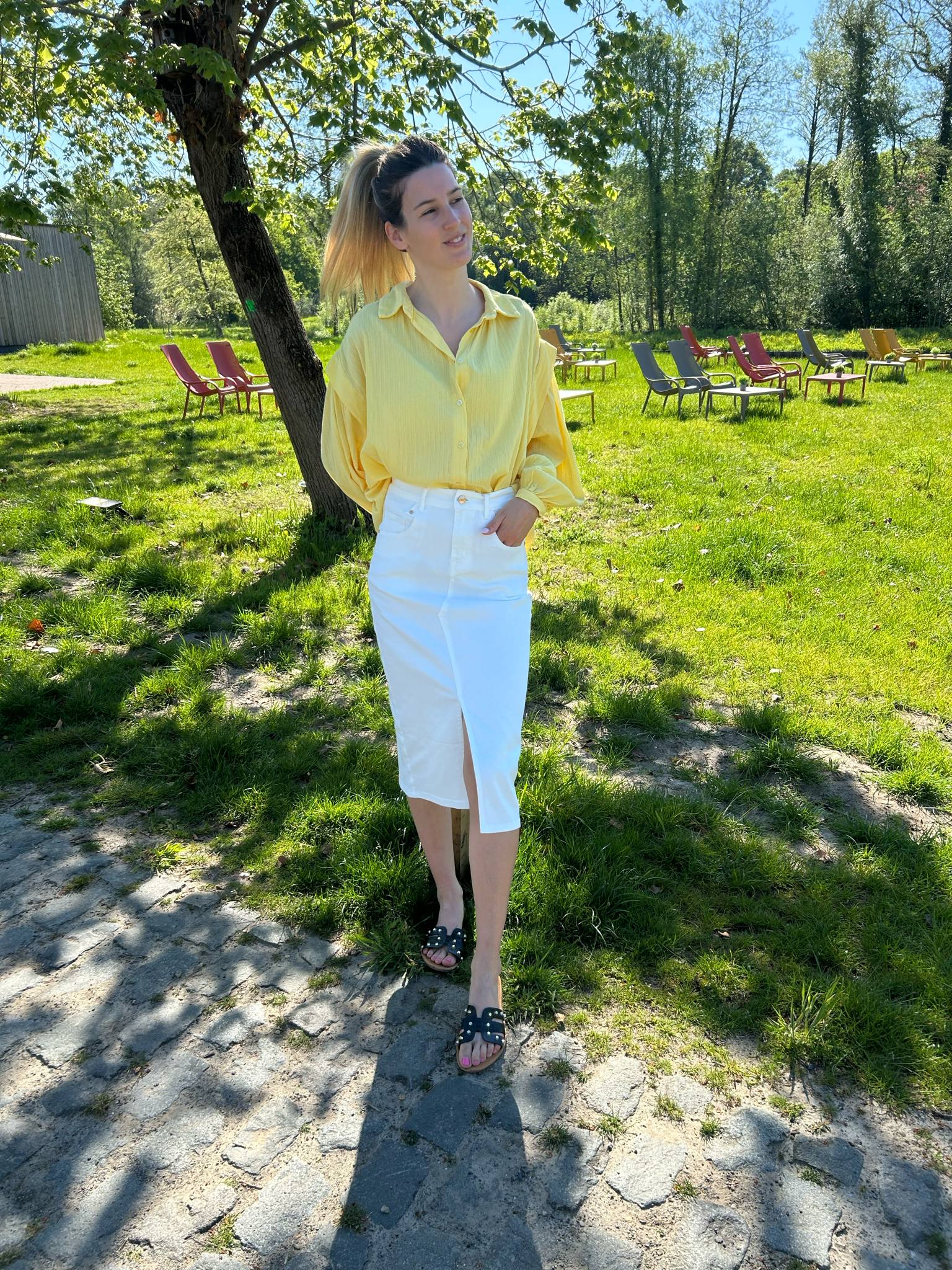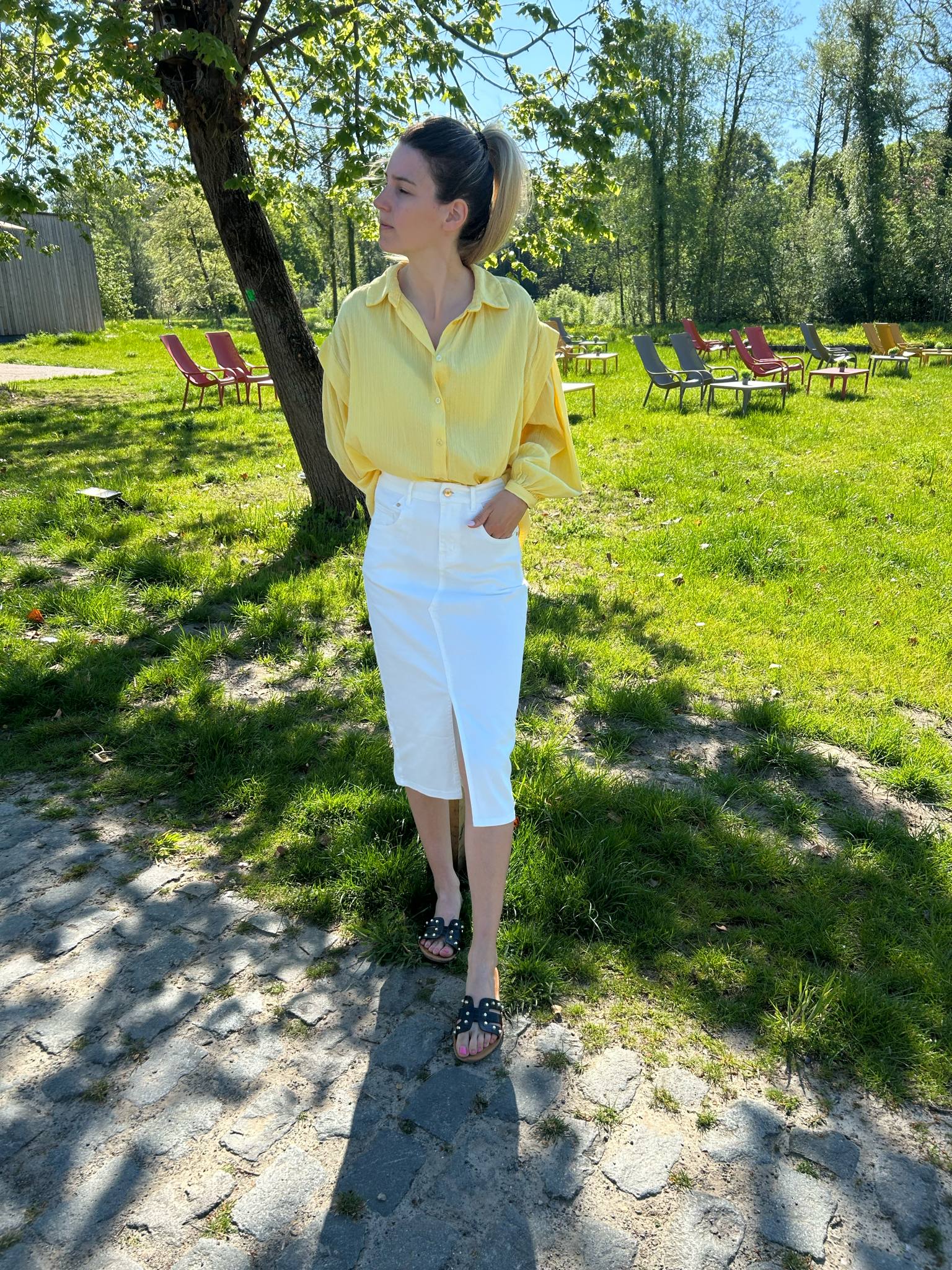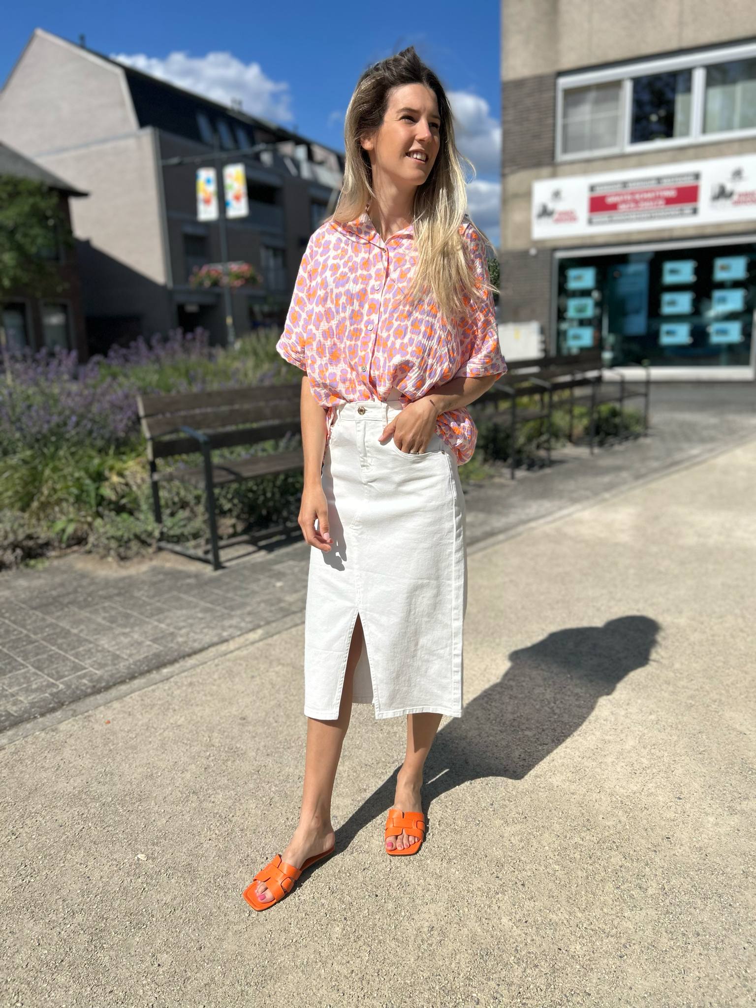 De rok heeft een middellange lengte en een split vooraan. De rok bevat stretcht en is een aansluitend model. De rok heeft ook zakken voor- en achteraan. We hebben deze frisse zomerrok van maat 36 tem maat 44.