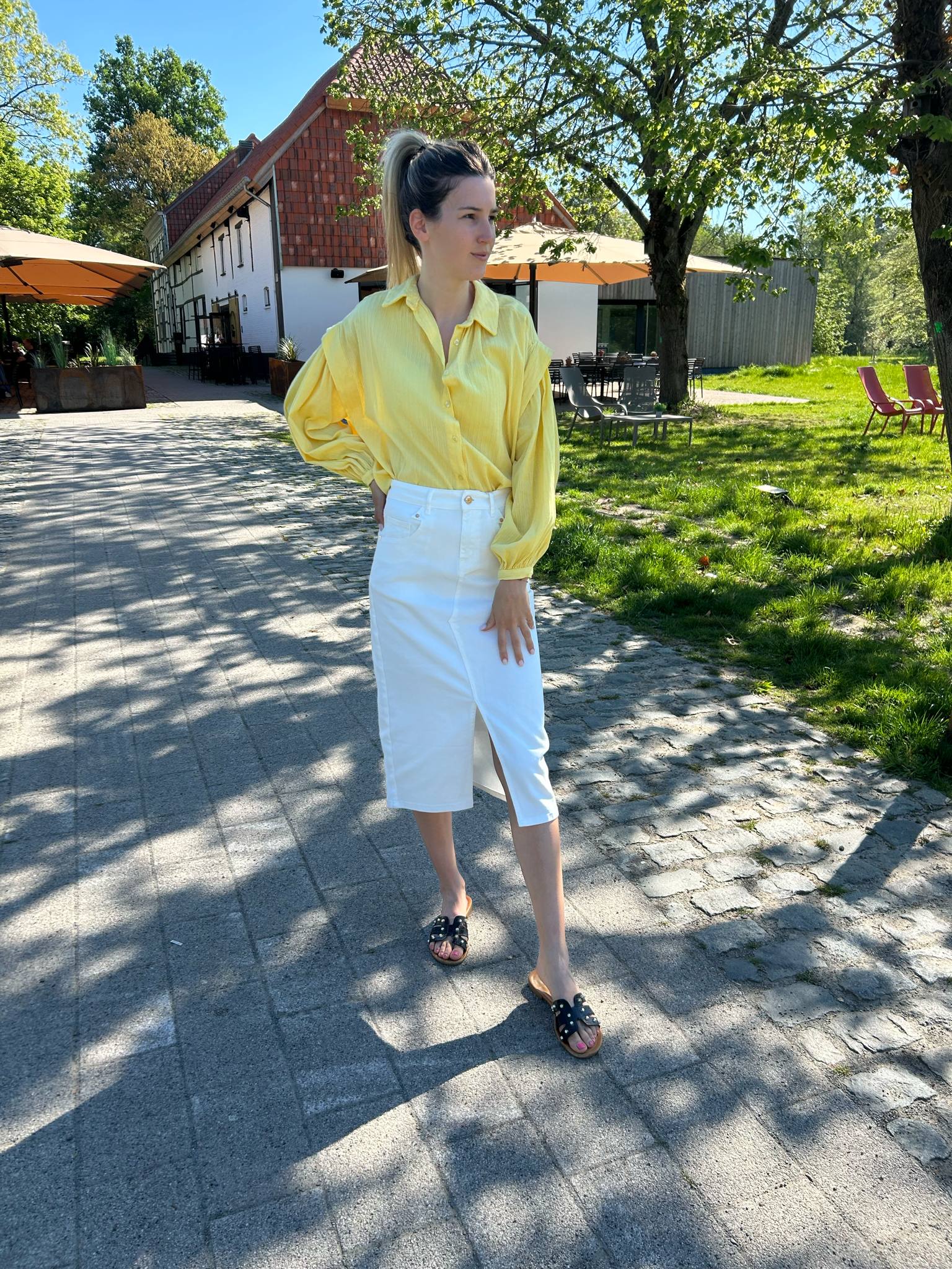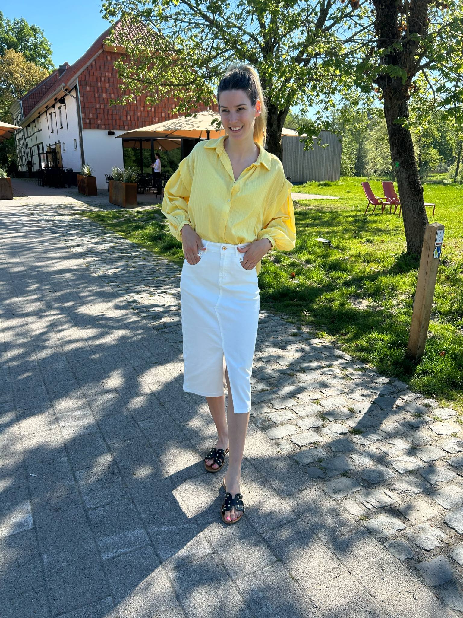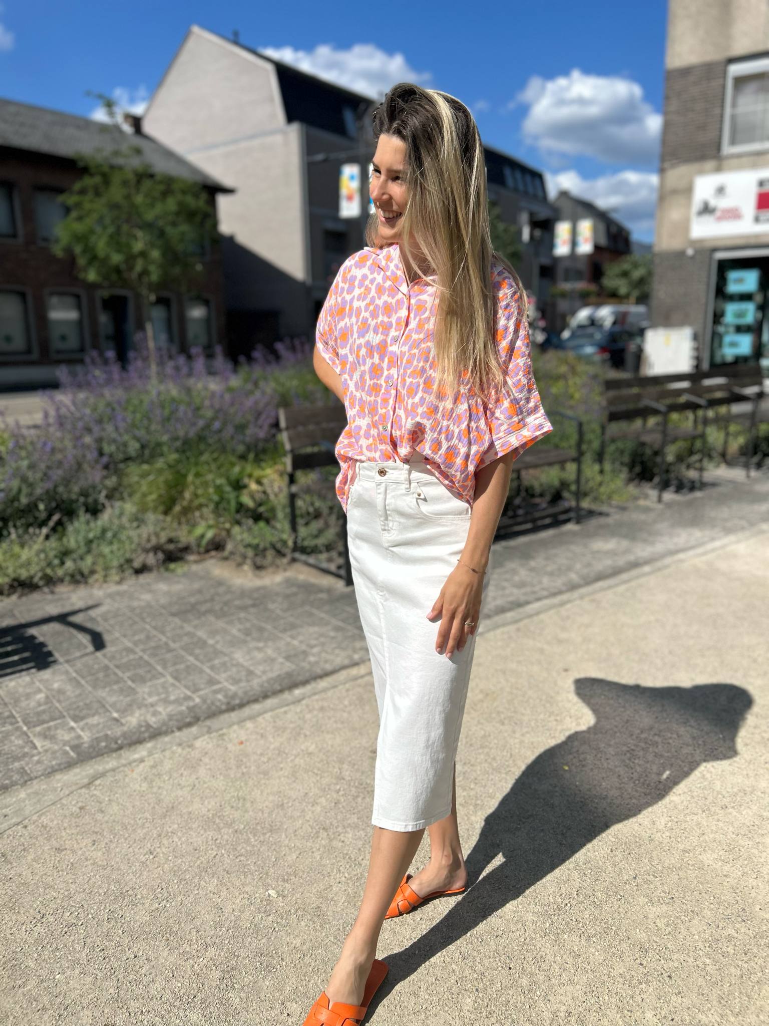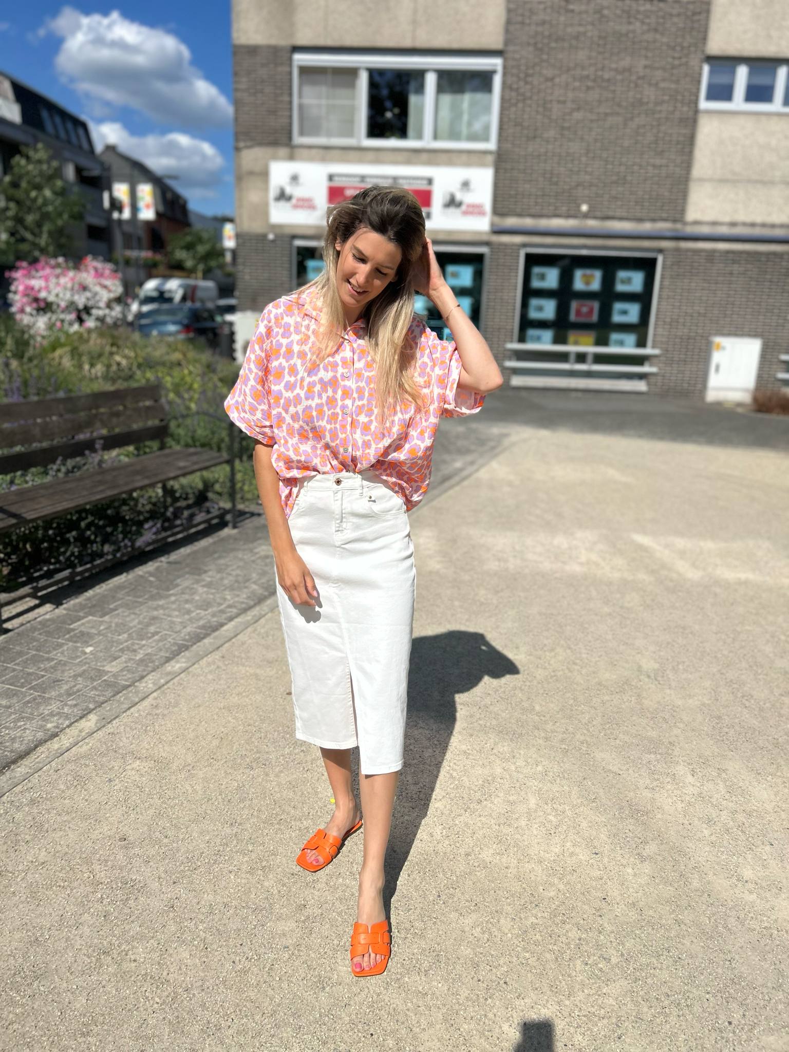 De rok heeft een middellange lengte en een split vooraan. De rok bevat stretcht en is een aansluitend model. De rok heeft ook zakken voor- en achteraan. We hebben deze frisse zomerrok van maat 36 tem maat 44.