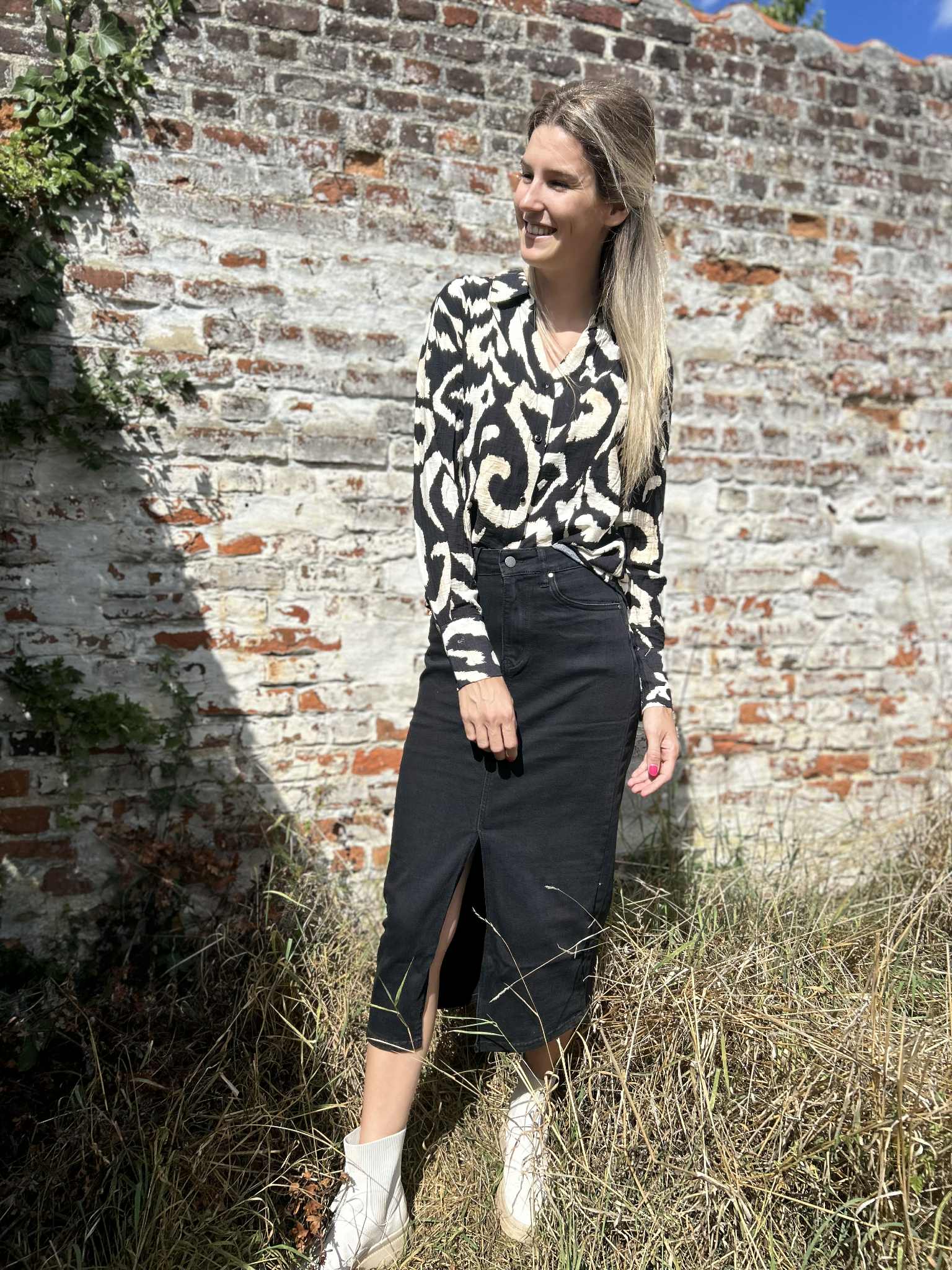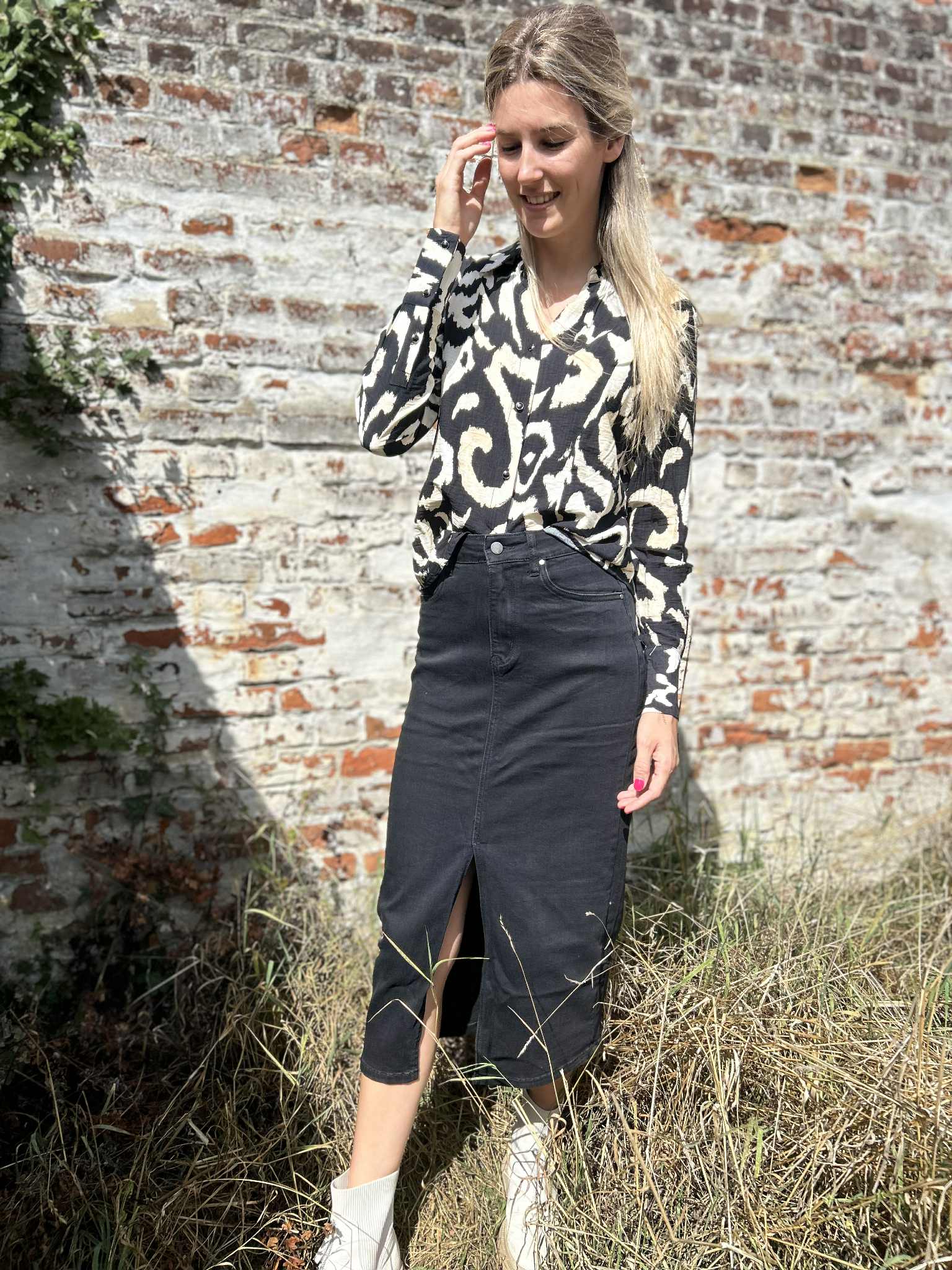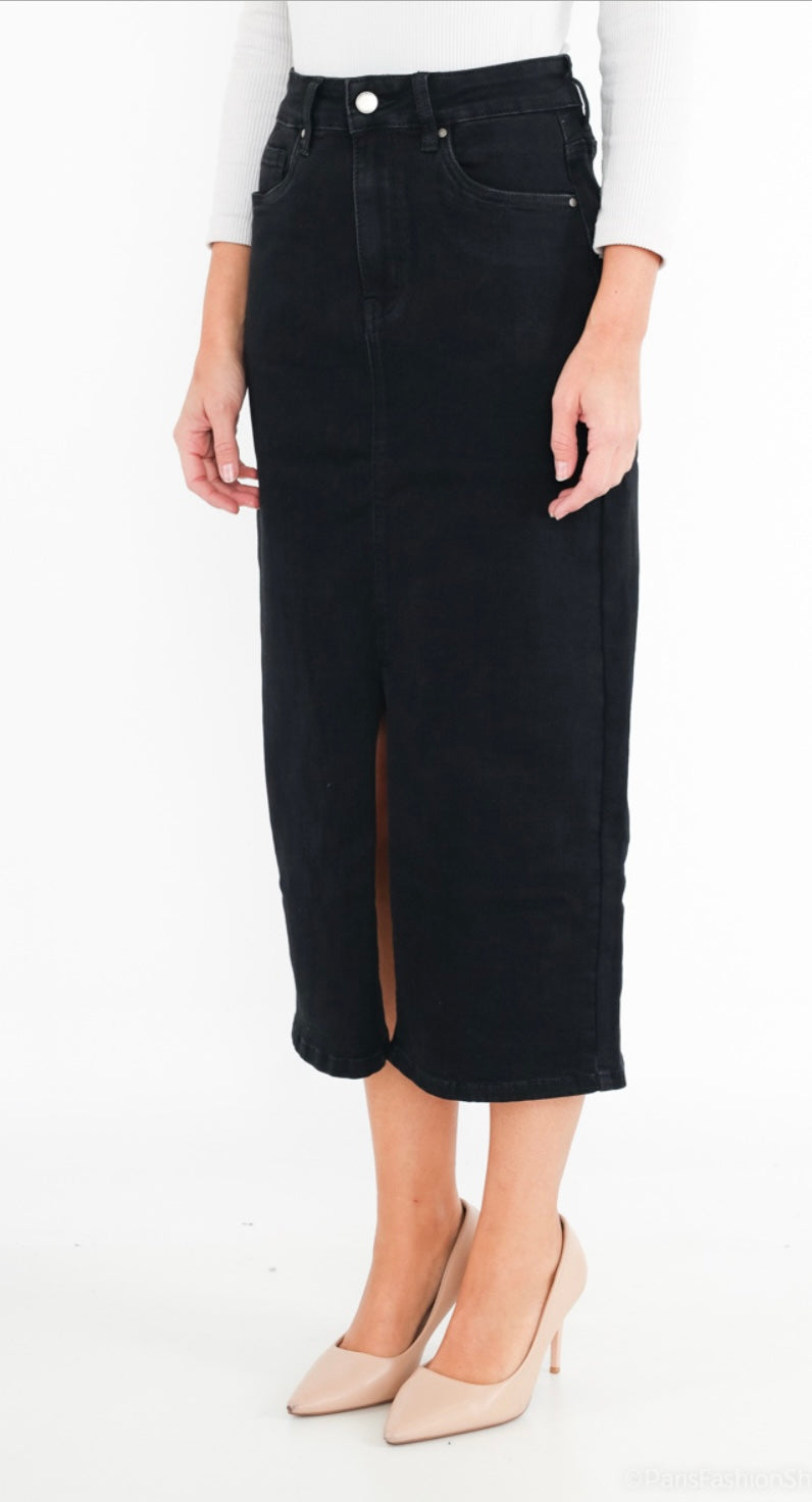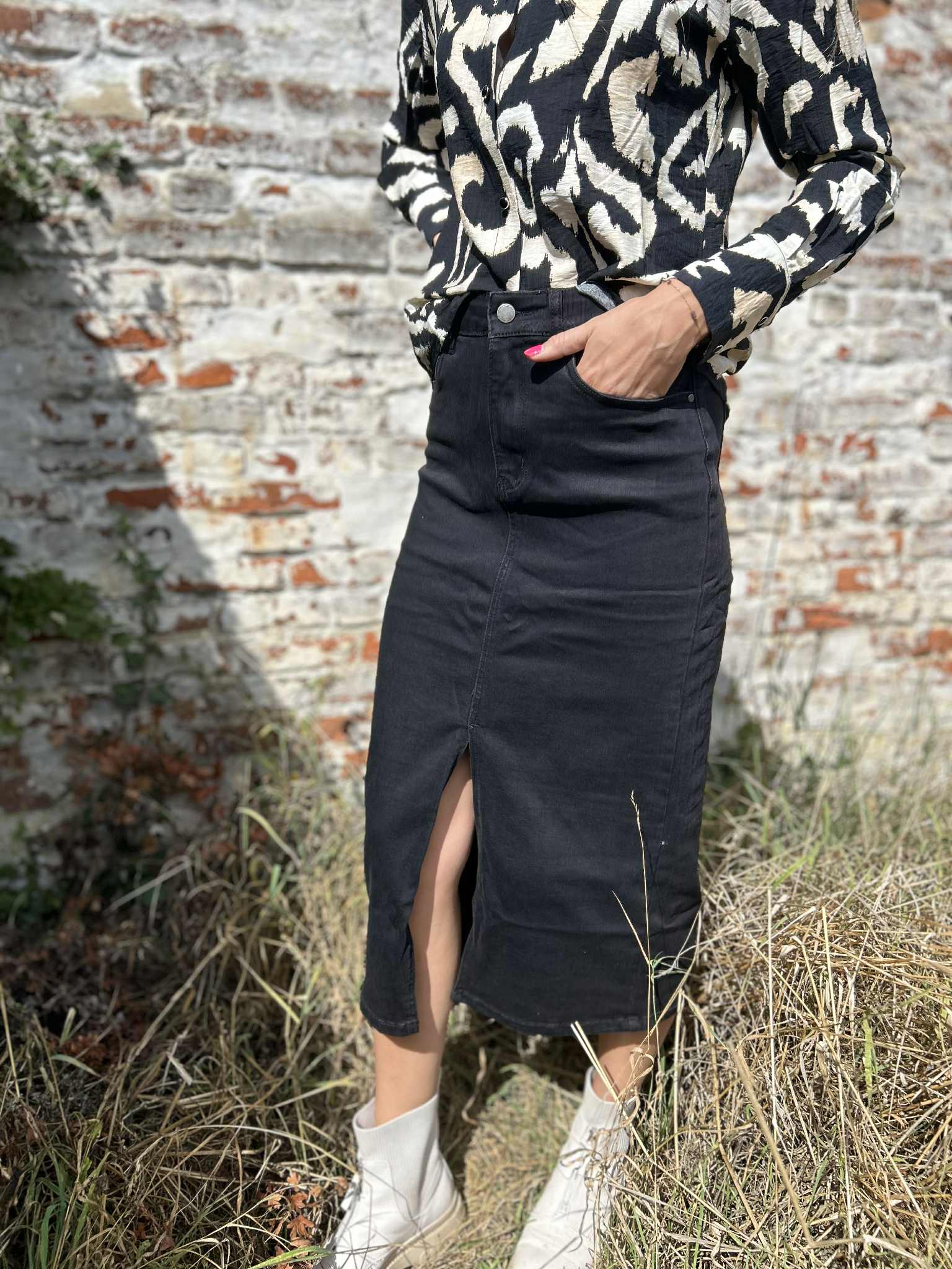 Maxi jeans rok met split vooraan en een lengte van ongeveer 85cm. De jeans rok heeft een aangename elastische stof en handige zakken voor en achteraan.