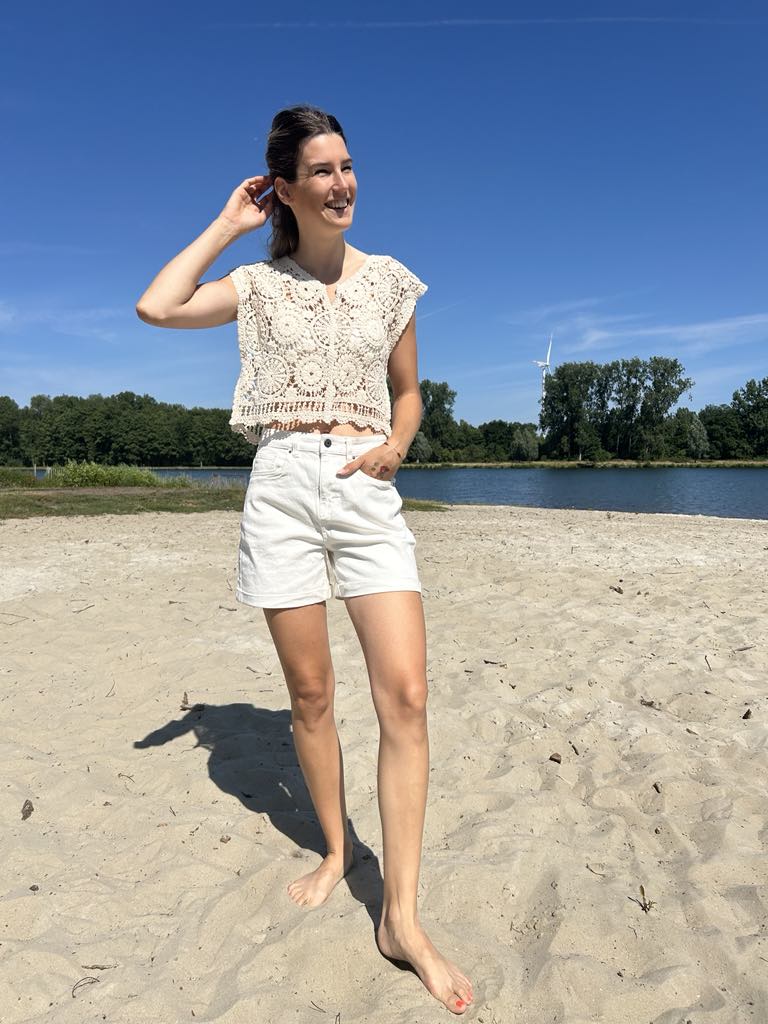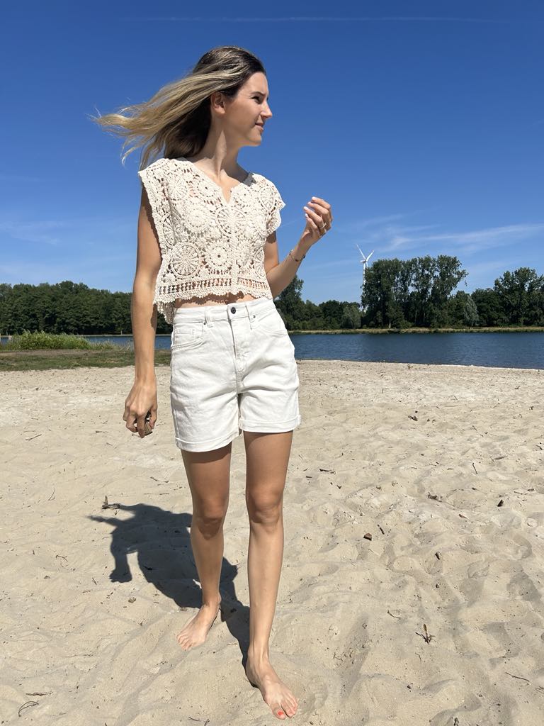 Jeansshort in de kleur ecru. De jeansshort heeft een aangenaam draagcomfort dankzij hoog katoenaandeel. De short heeft een hoge taille met losse pasvorm. De jeans heeft pijpen met een ideale lengte (niet te kort) en omgeslagen pijpen.