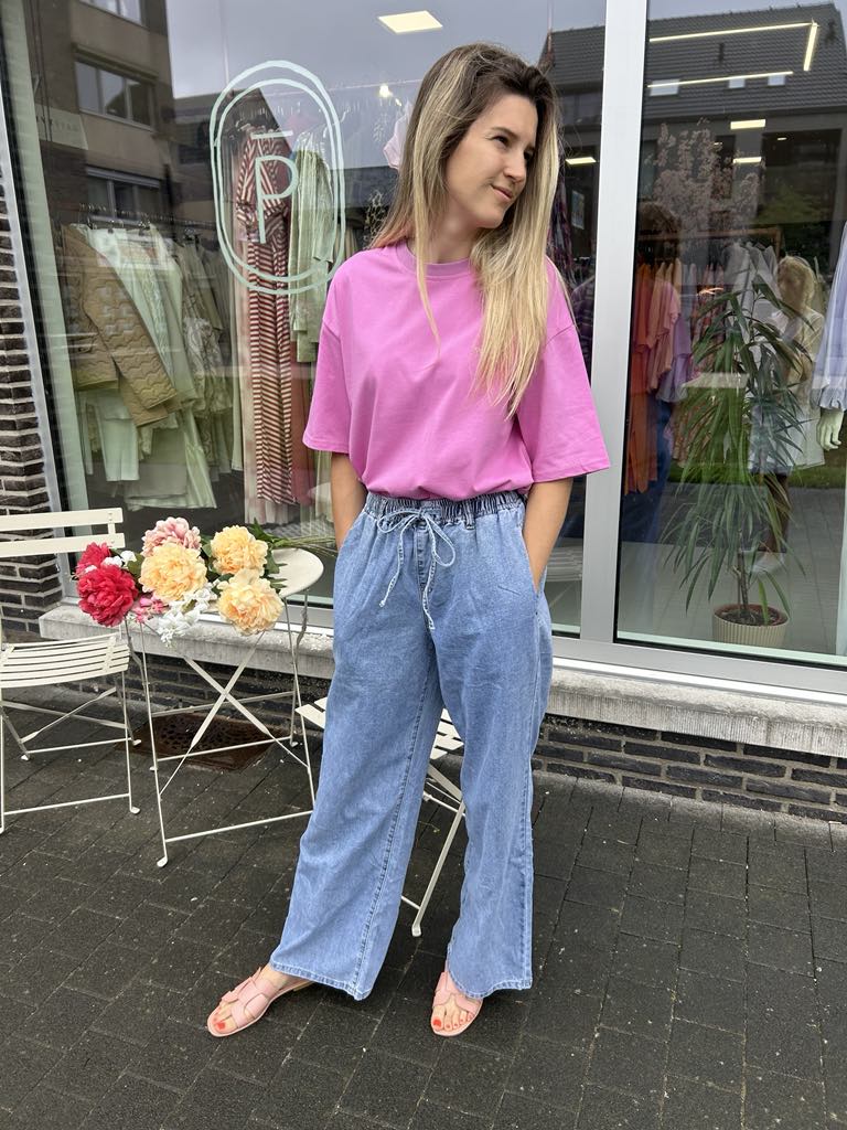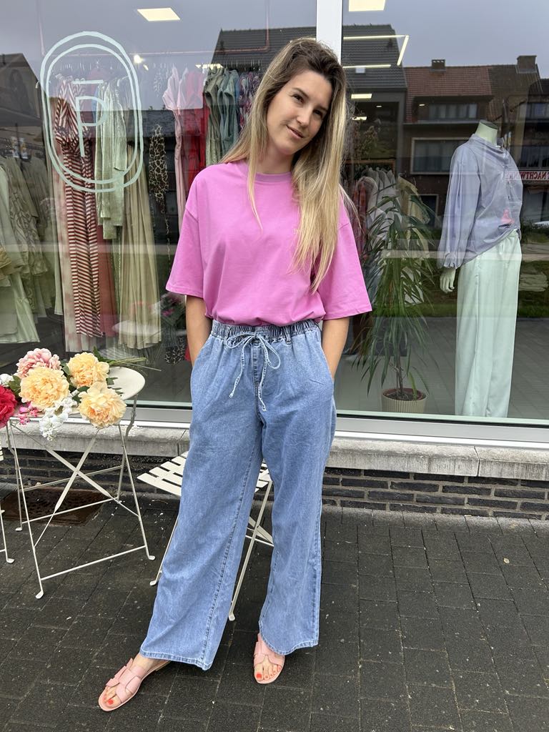 Wijde damesjeans van katoen en polyester, ideaal voor lente/zomer. Deze jeans heeft een elastiek aan de taille dat je kan aantrekken met koordjes. Deze jeans is comfy en casual.
