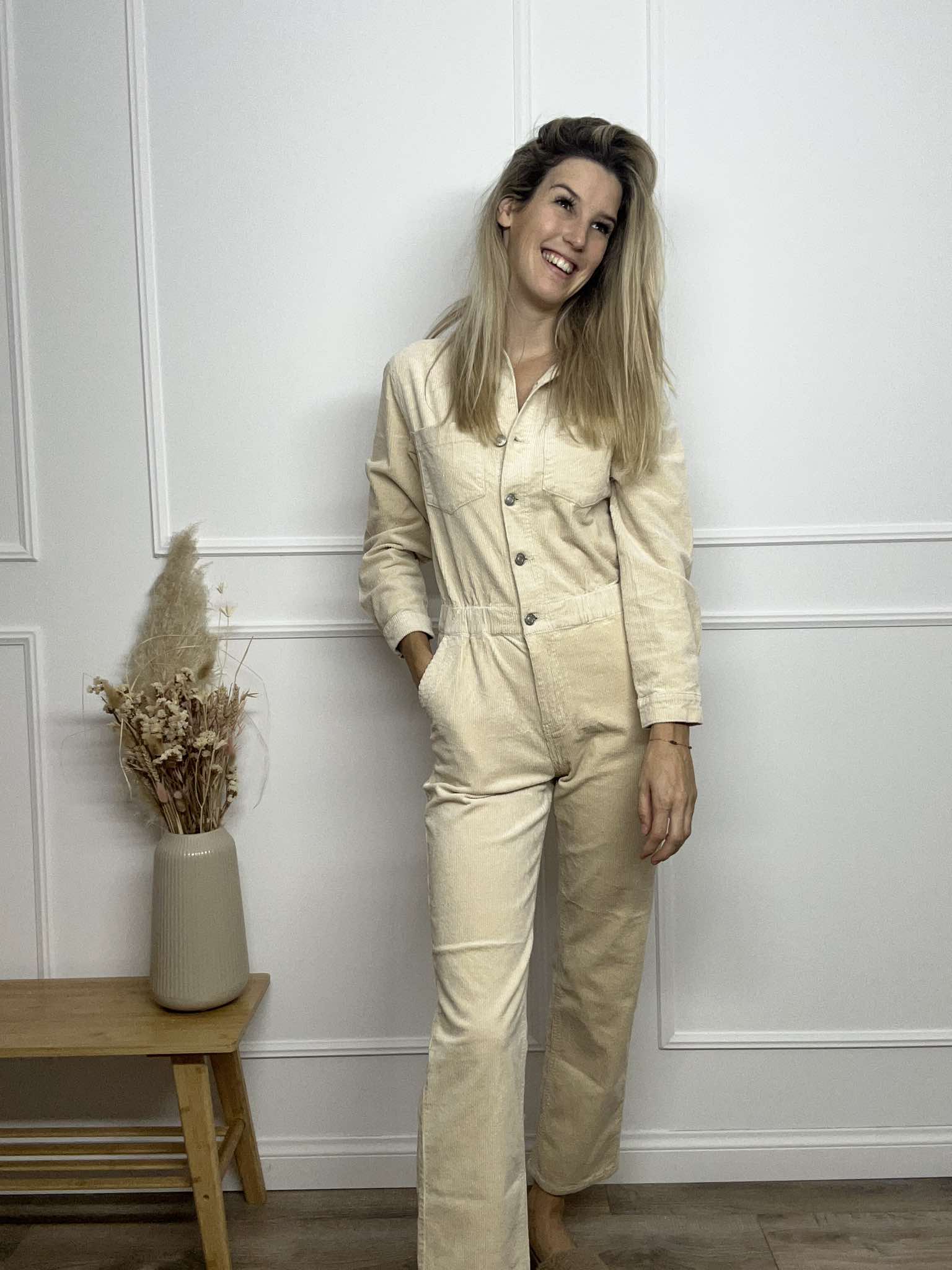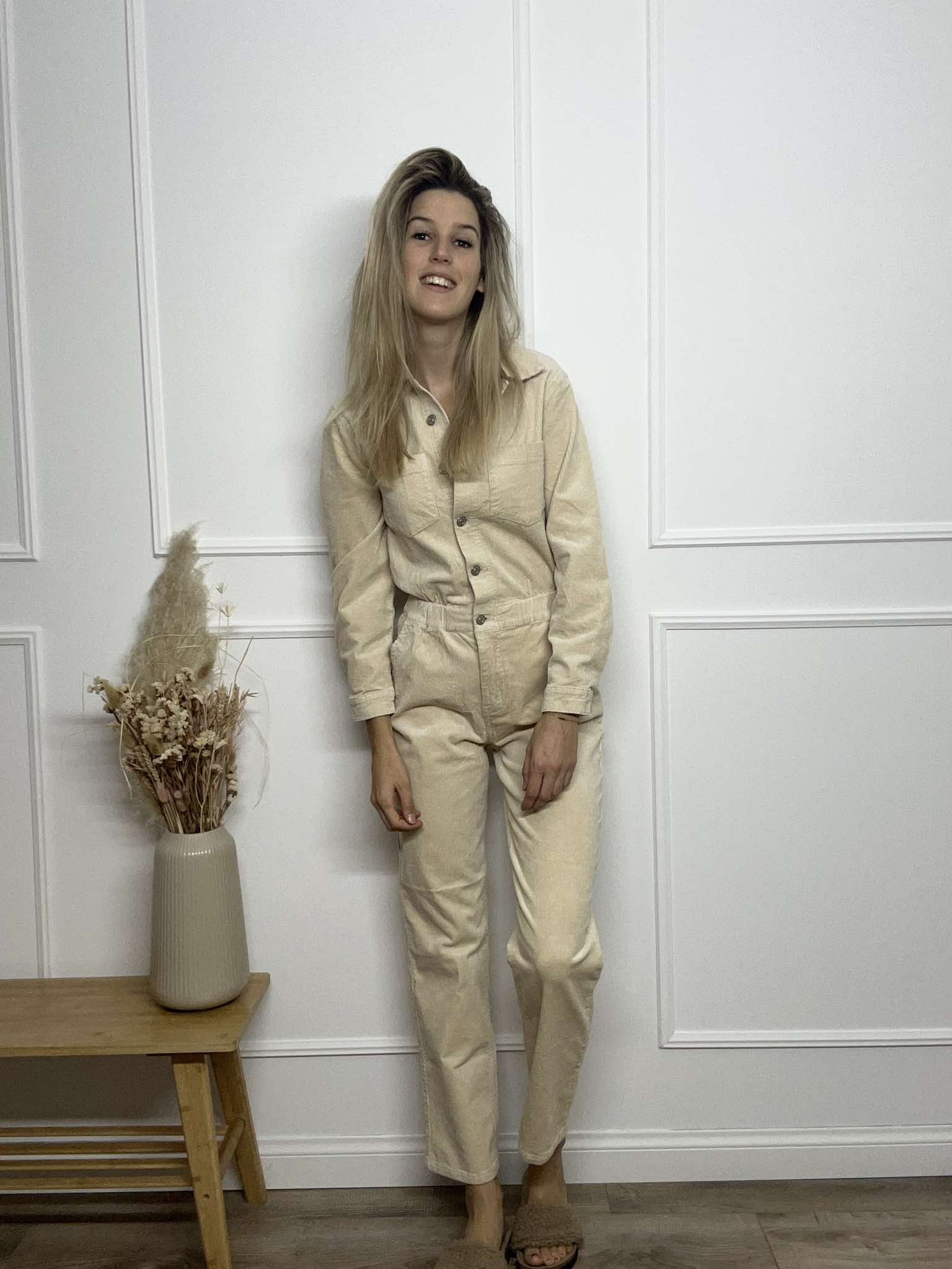 Deze jumpsuit is een velvet jumpsuit. Deze jumpsuit heeft dus een geribbelde stof. Het bovenstuk van de jumpsuit sluit met knoopjes. Op de taille zit een elastiek zodat de taille geaccentueerd. De jumpsuit heeft lange mouwen en handige zakken vooraan.