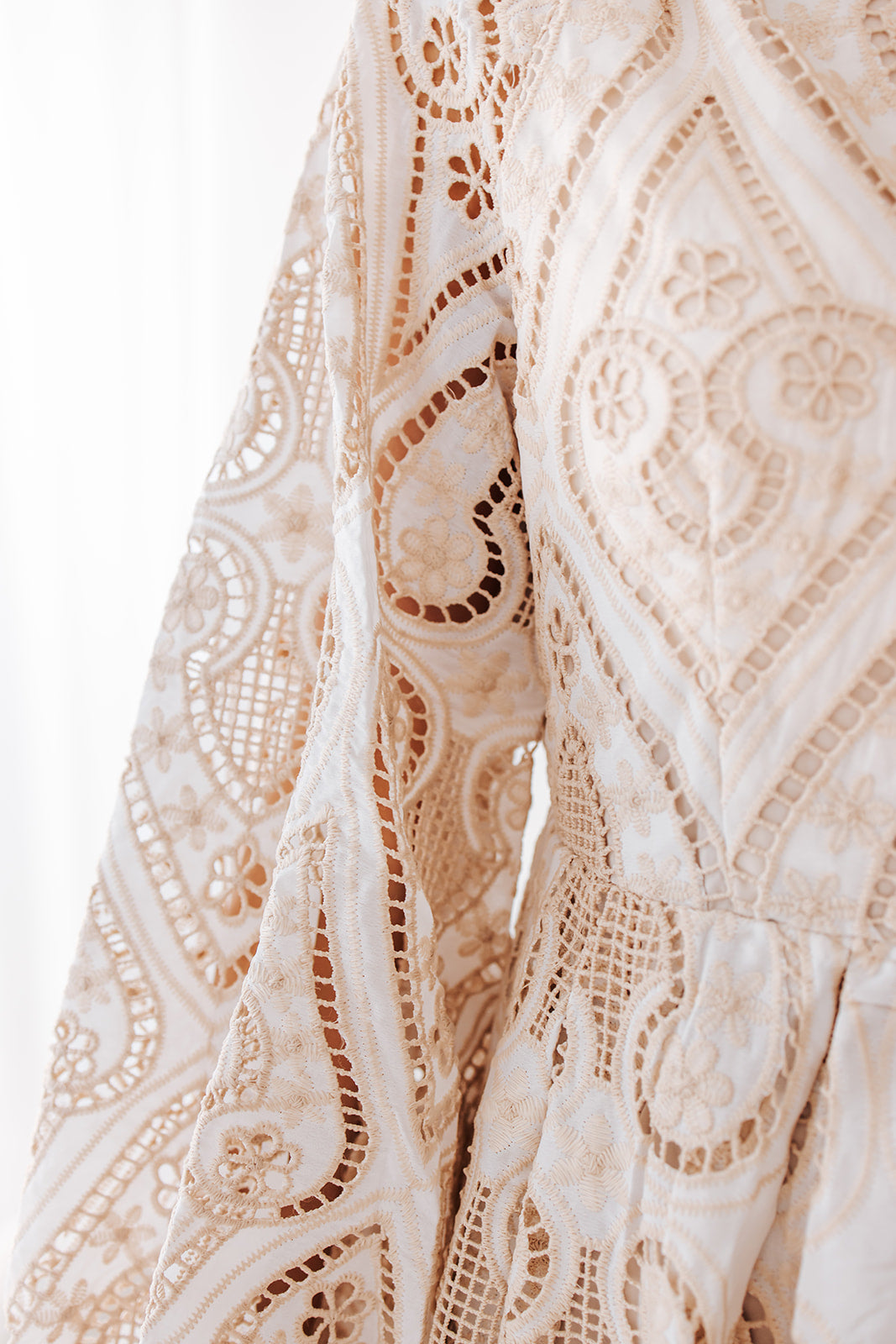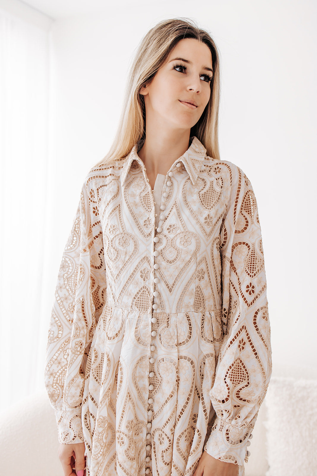 Jurk Paulien is een geborduurde katoenen kanten jurk met een overhemdkraag. Er zijn