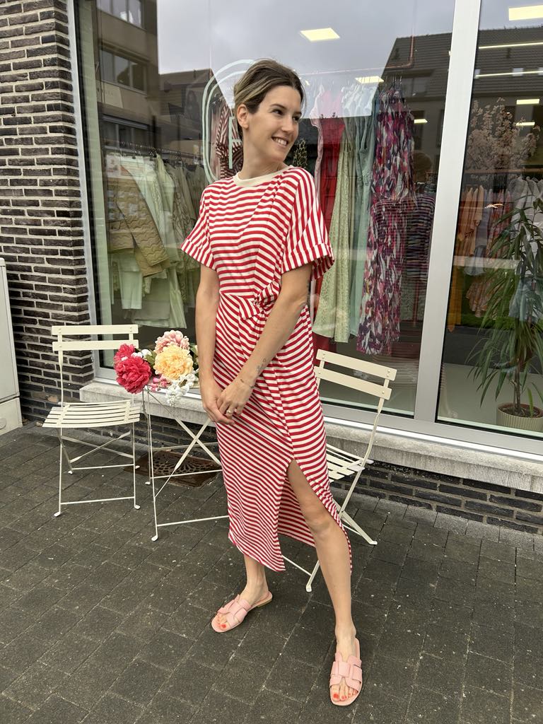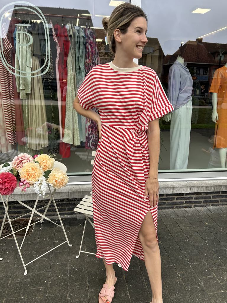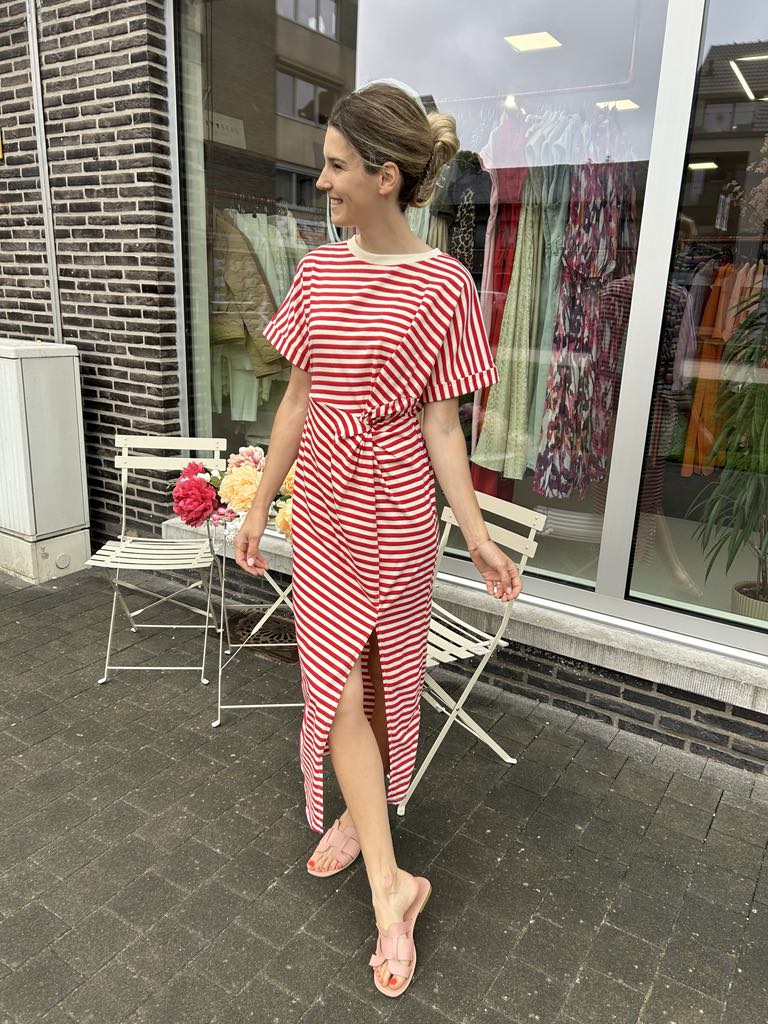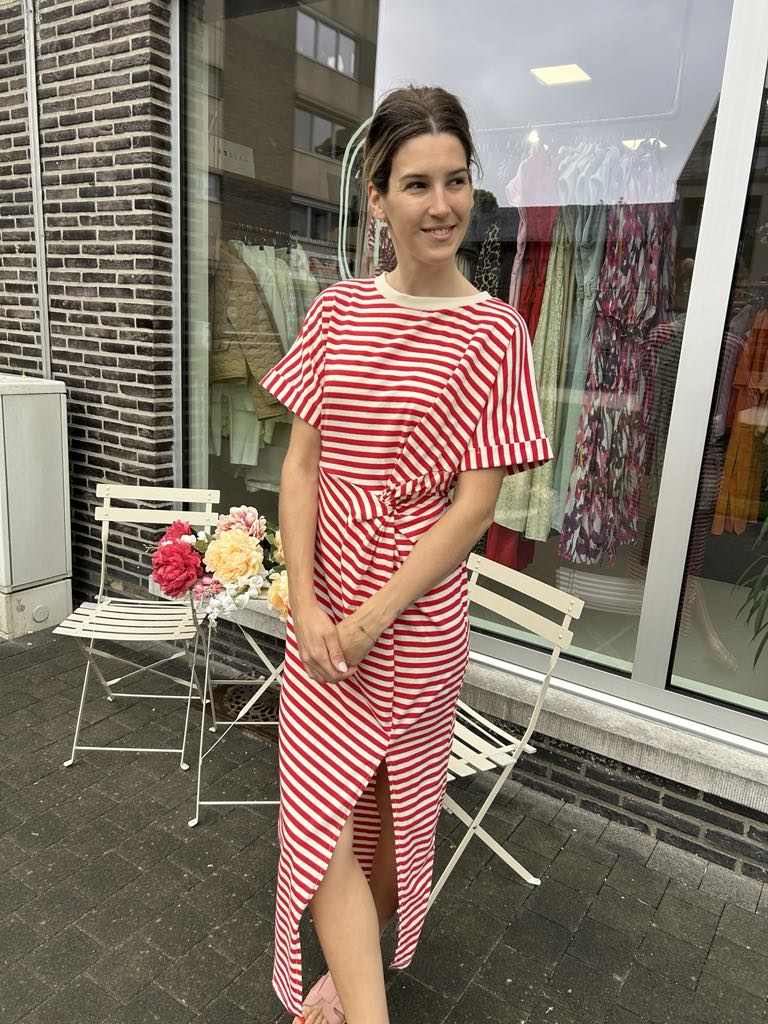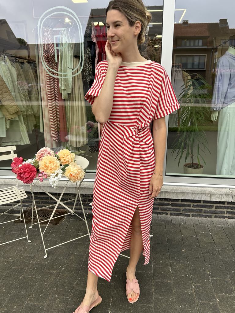 Deze jurk heeft een leuk streepjes motief in een elastisch dun stofje. Vooraan heeft de jurk een knoop detail op de taille en een split aan de zijkant. Dit jurkje draagt heel aangenaam aan! De jurk is TU en kan van maat S tot L gedragen worden.