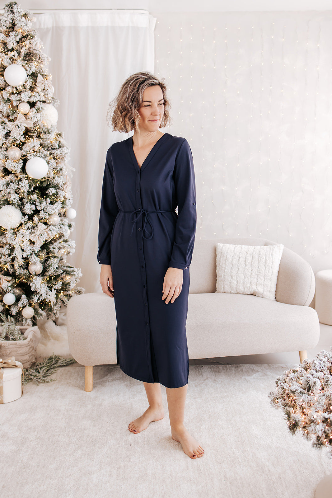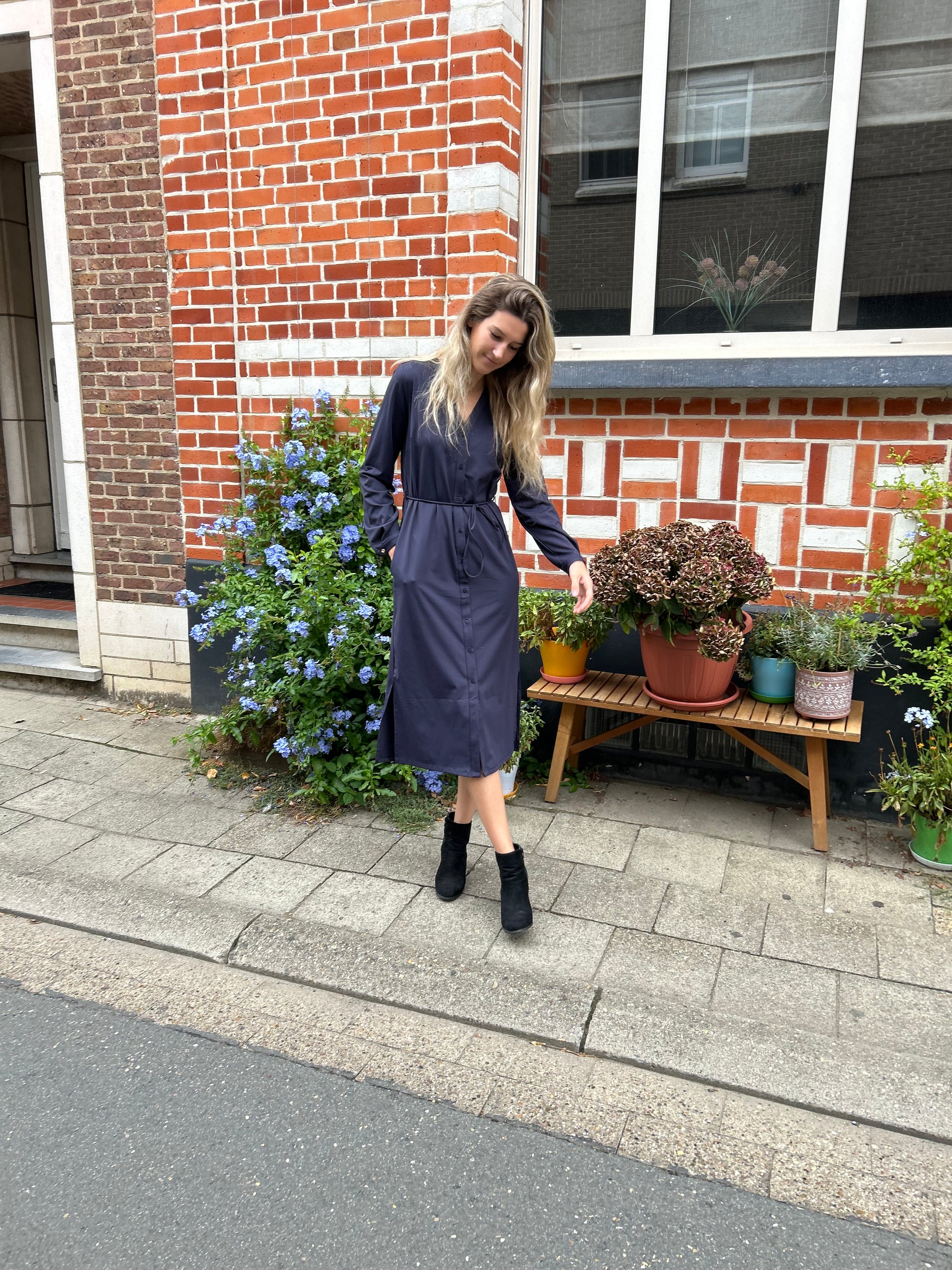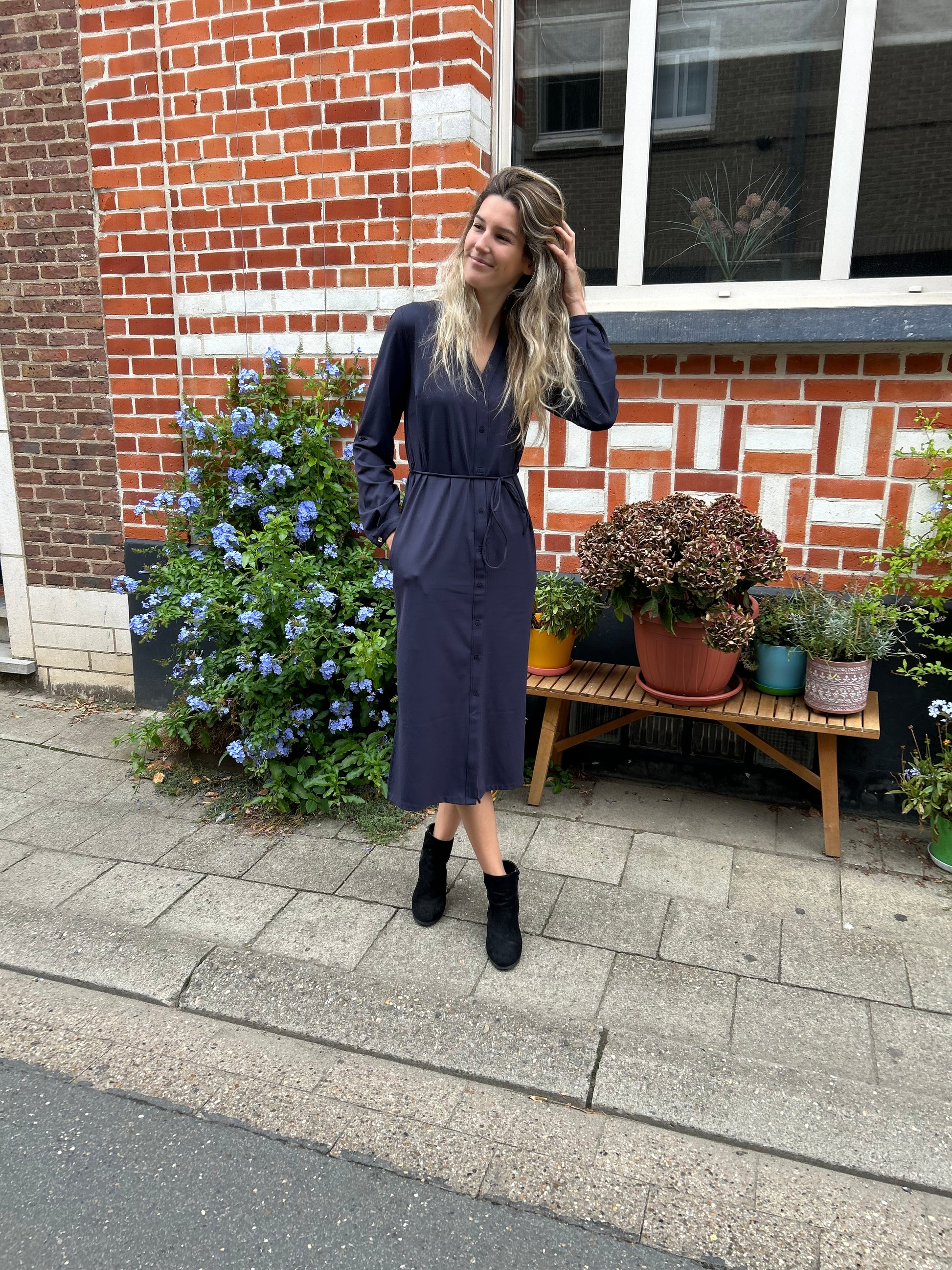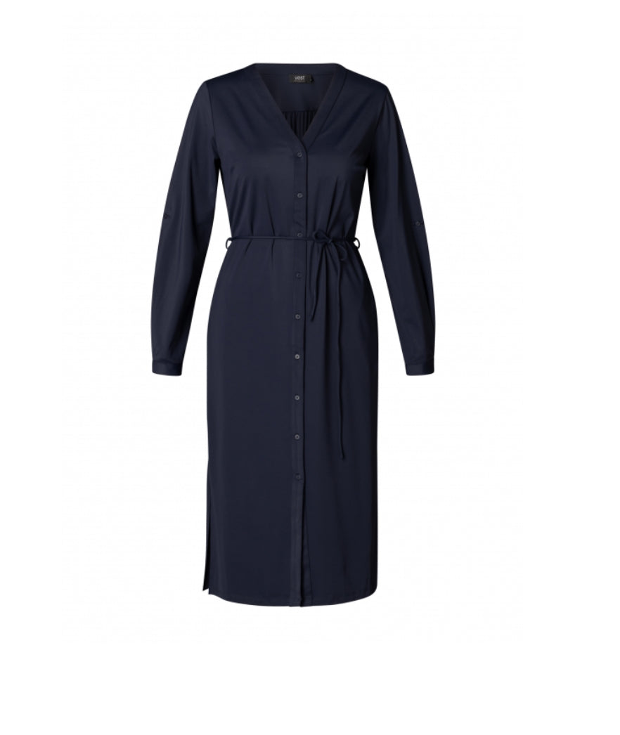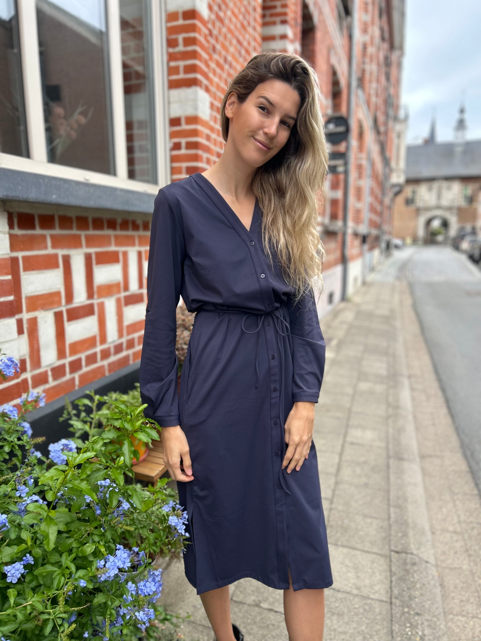 De travelstof van deze jurk zorgt voor een zachte, rekbare pasvorm die dankzij de kreukbestendigheid altijd netjes blijft. Met een doorlopende knoopsluiting en een V-hals in een klassieke donkerblauwe kleur is dit een veelzijdig en makkelijk te combineren item.