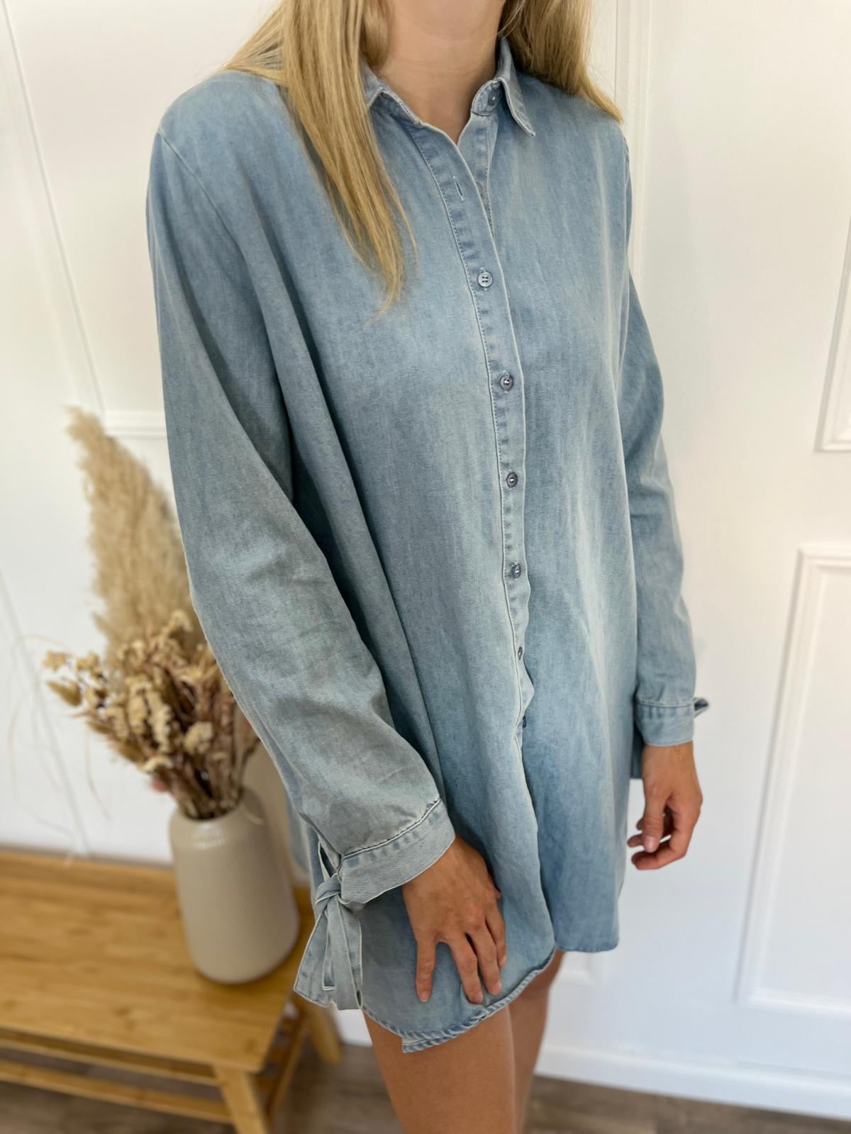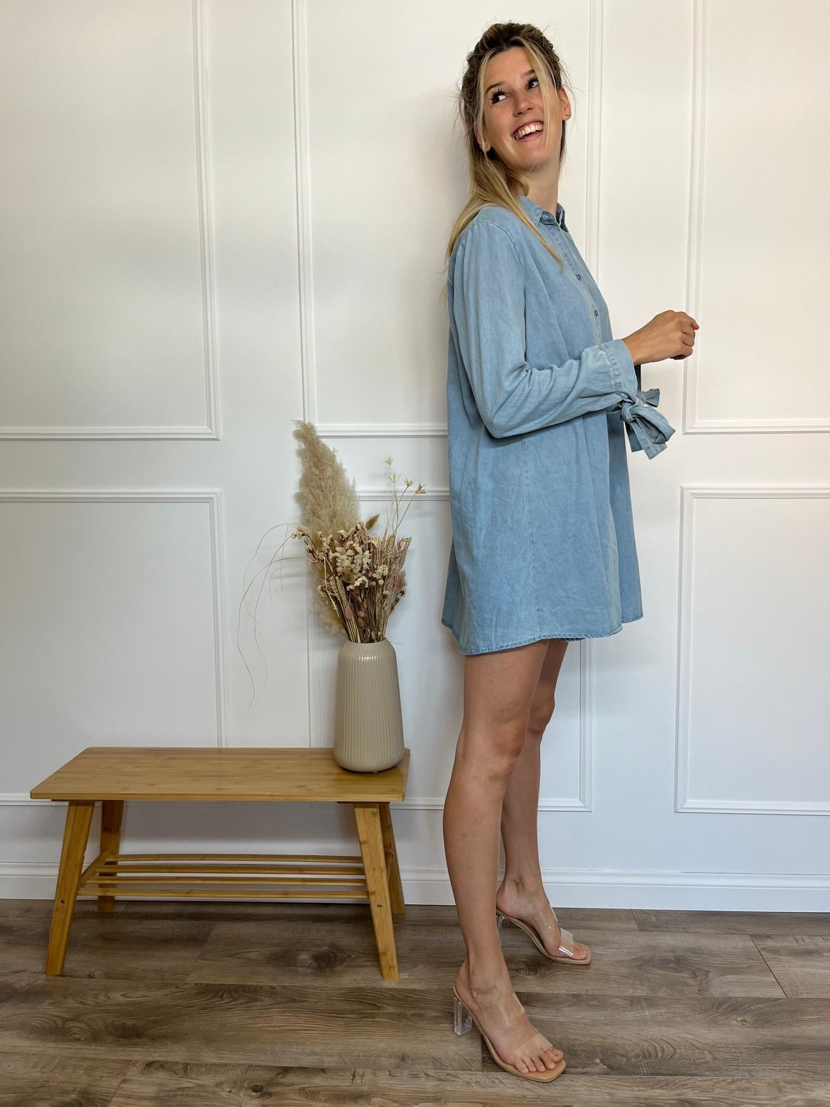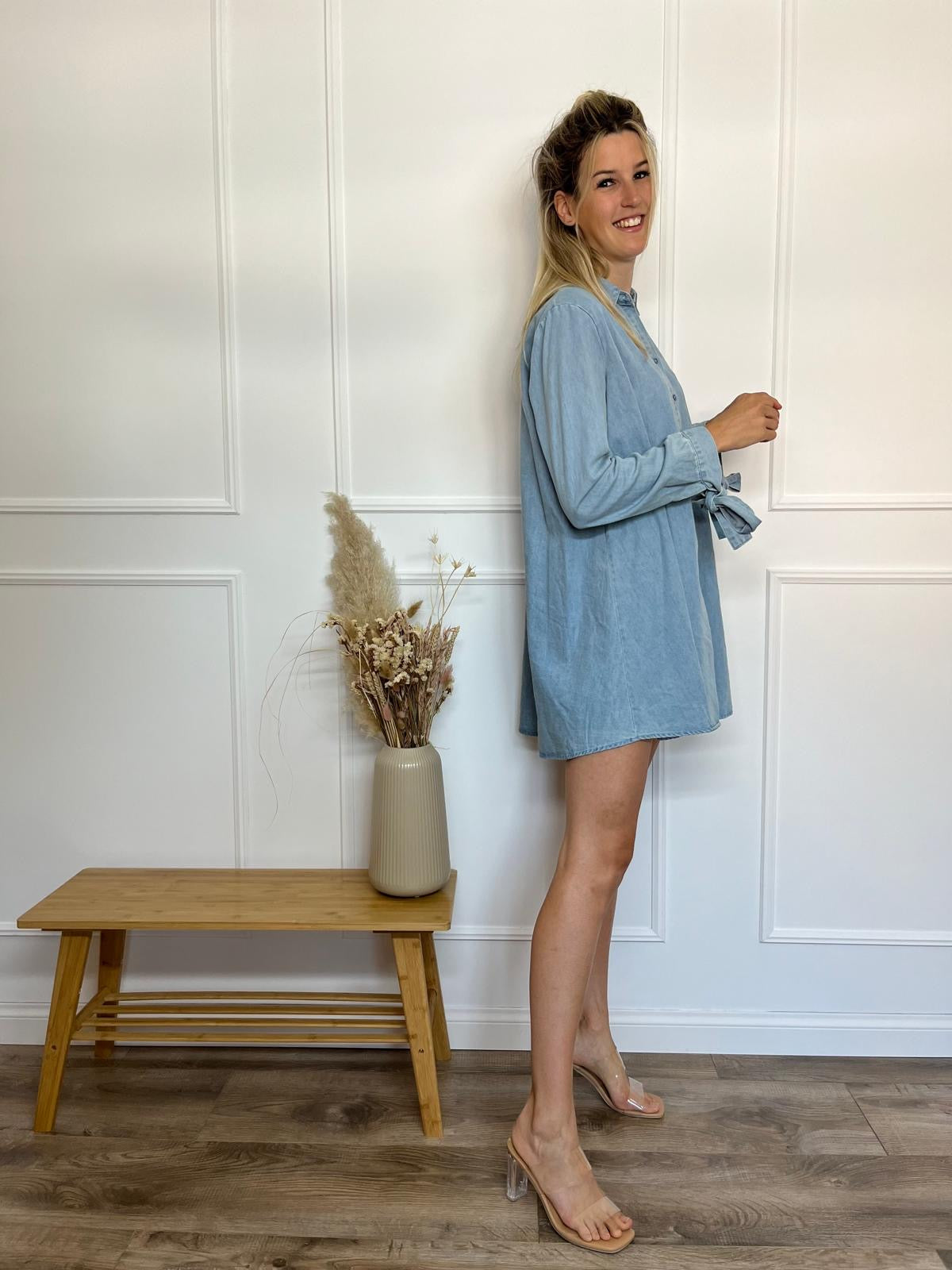 Onze jurk Daphnea is een korte denim shirt A-lijn jurk. Deze jurk heeft lintjes aan de onderkant van de mouwen die je kan strikken. De jurk heeft knoopjes van boven tot onder.