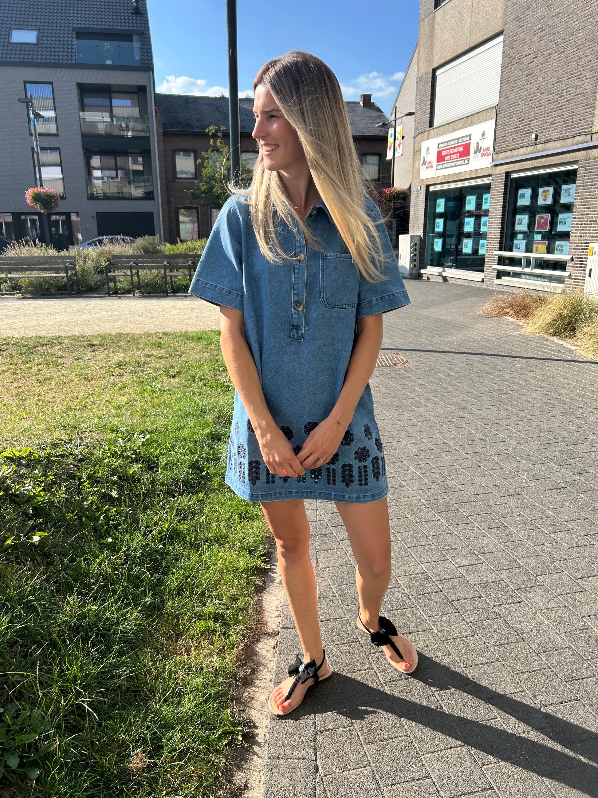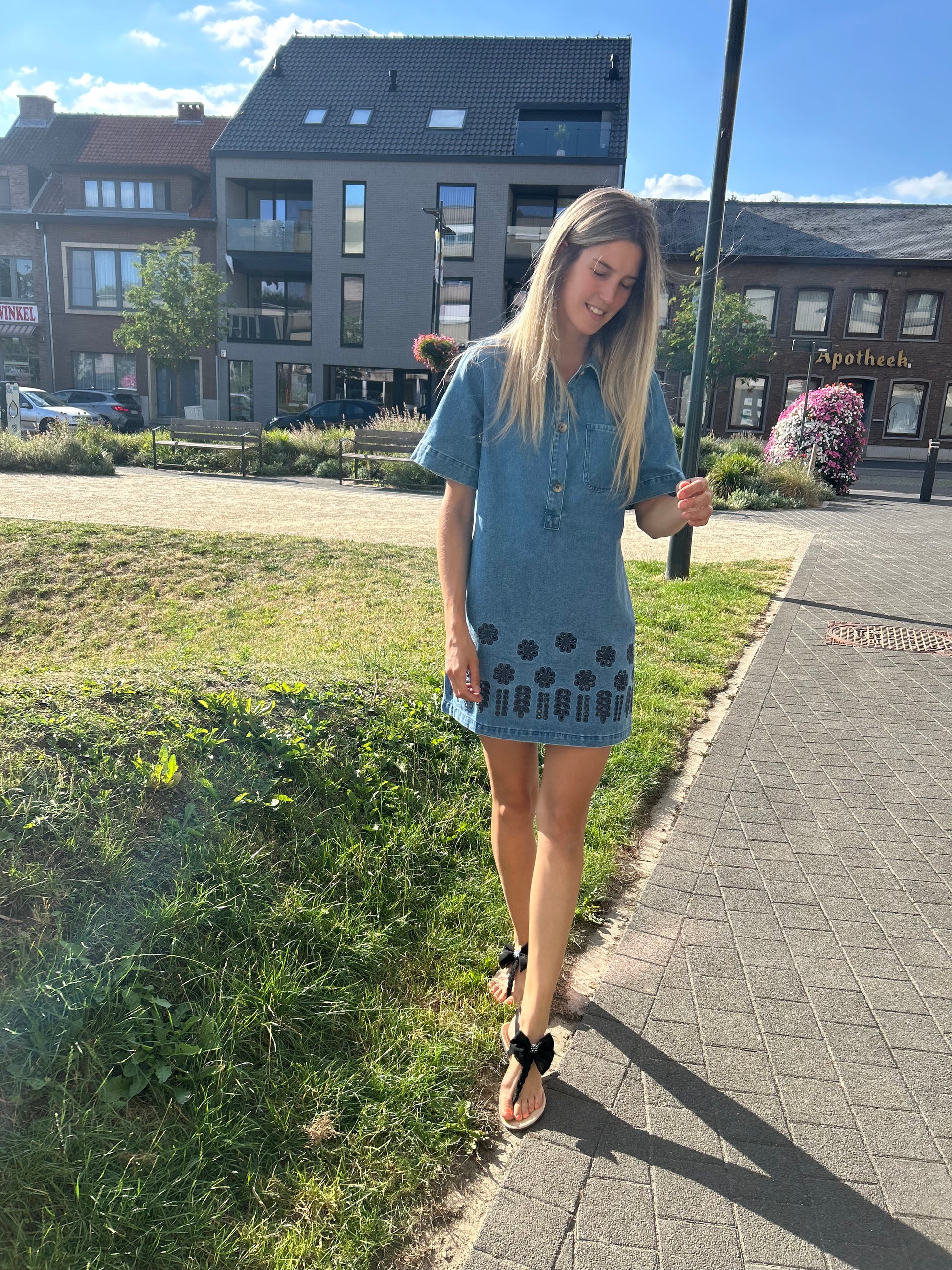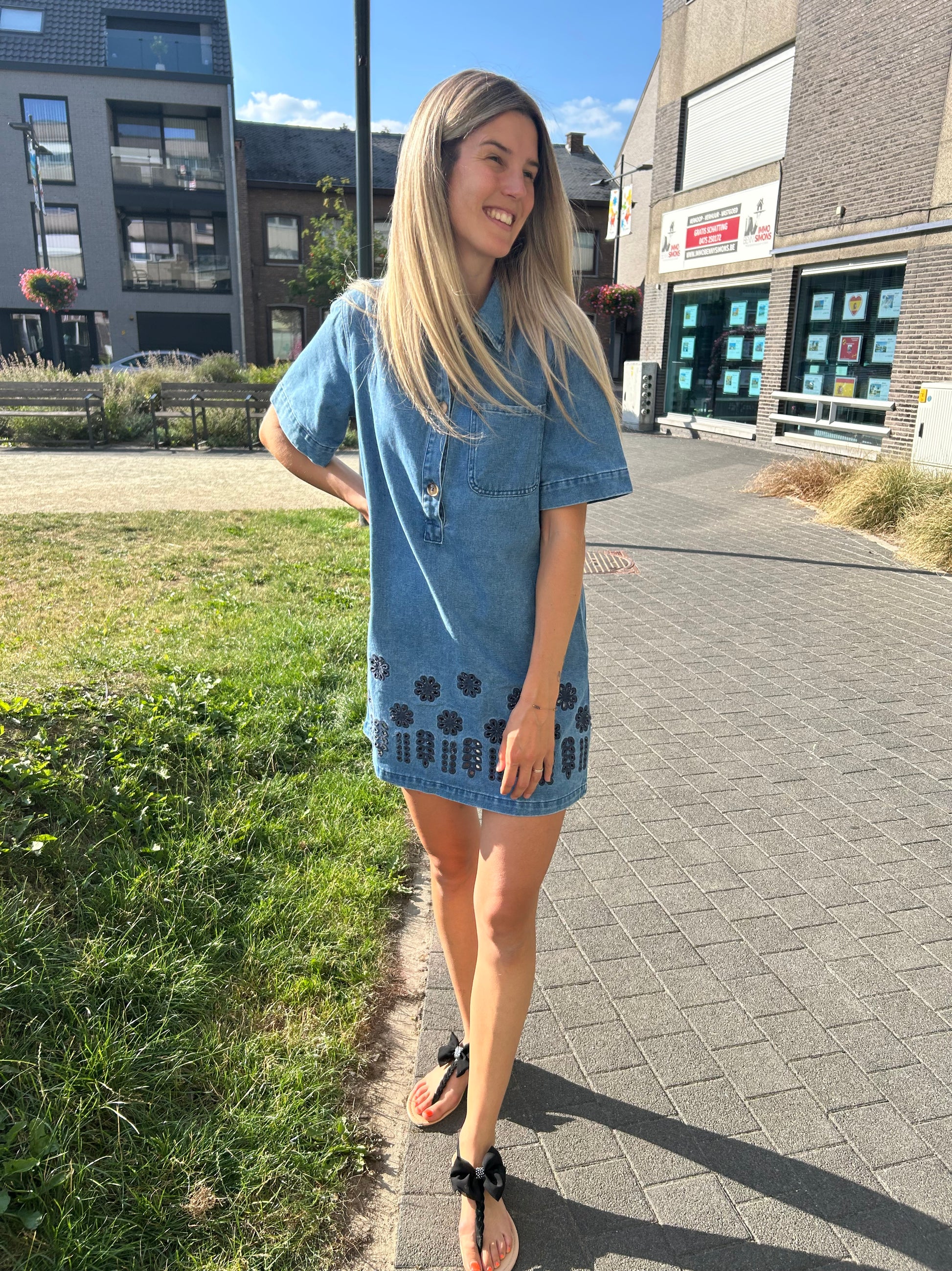 Rechte jeansjurk met leuk delicaat borduurwerk aan de onderzijde. De jurk is een los model en heeft korte mouwen. De jurk heeft een V-hals met vervolgens knoopjes om te sluiten tot aan de borst. Alsook is er een zakje ter hoogte van de borst. We raden deze jurk aan tot een lengte van 1m70. Voor model Lien is de jurk iets te kort, zij is 1m78 groot.