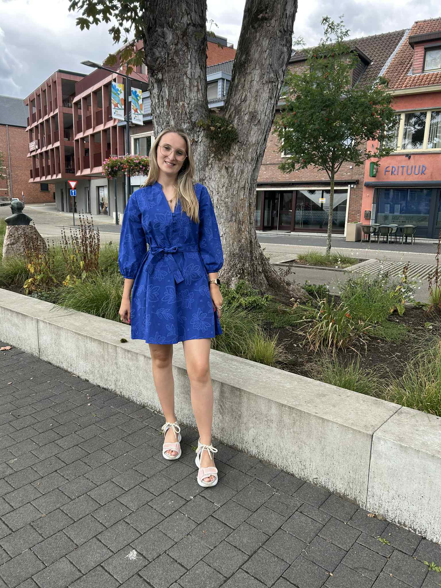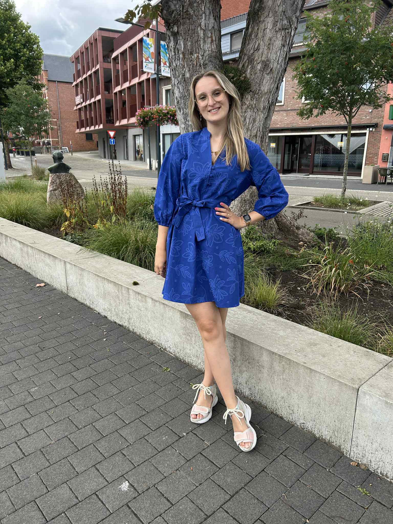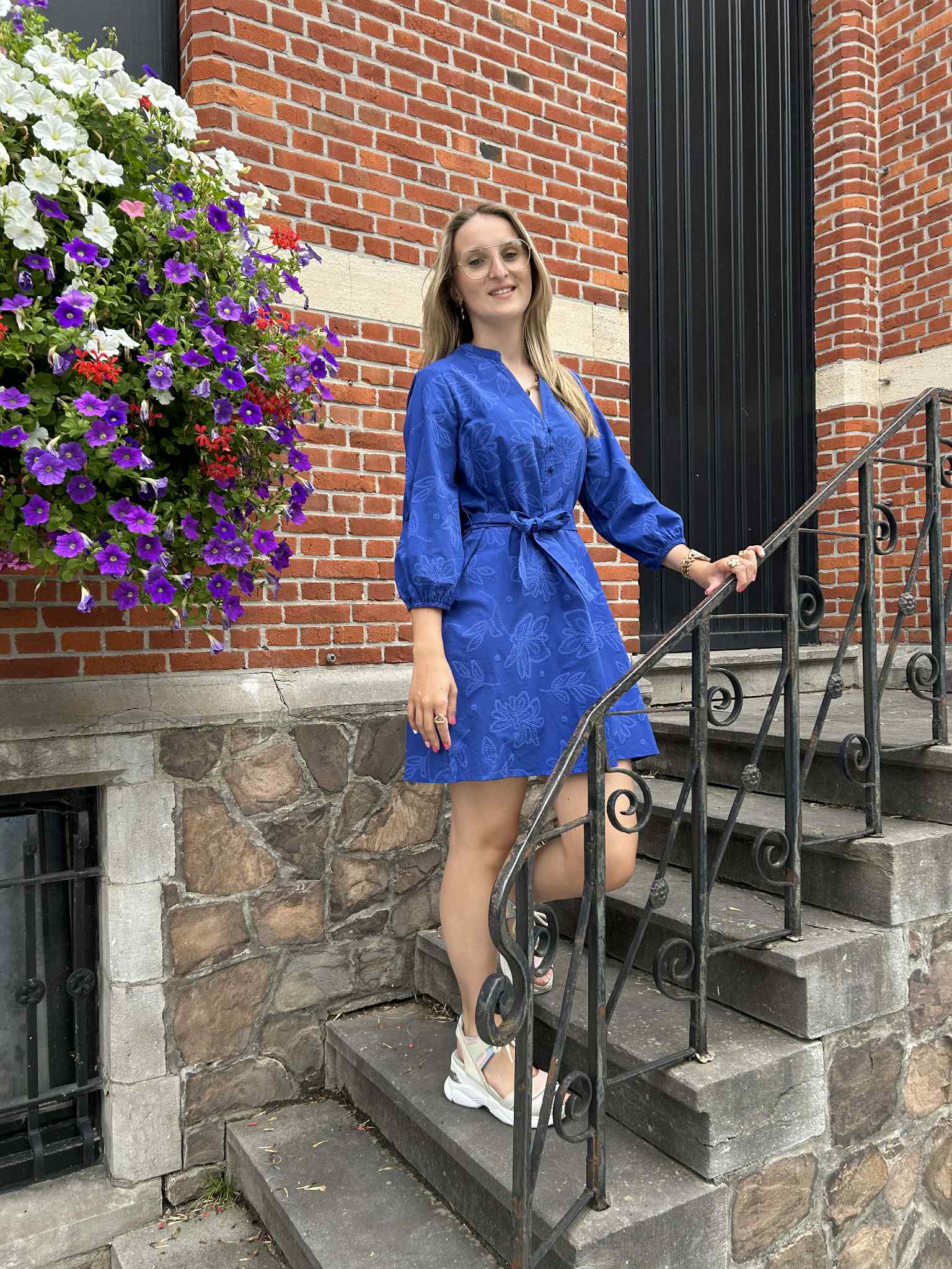 Jurk Lidia is een prachtige blauwe katoenenjurk. De jurk heeft een doorlopende knoopsluiting, ballonmouwen en een afneembare ceintuur. Op de jurk is een mooi geborduurd bloemenpatroon te vinden.