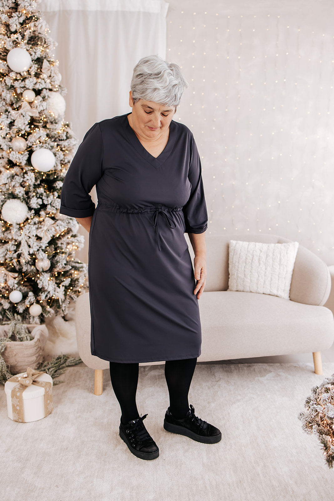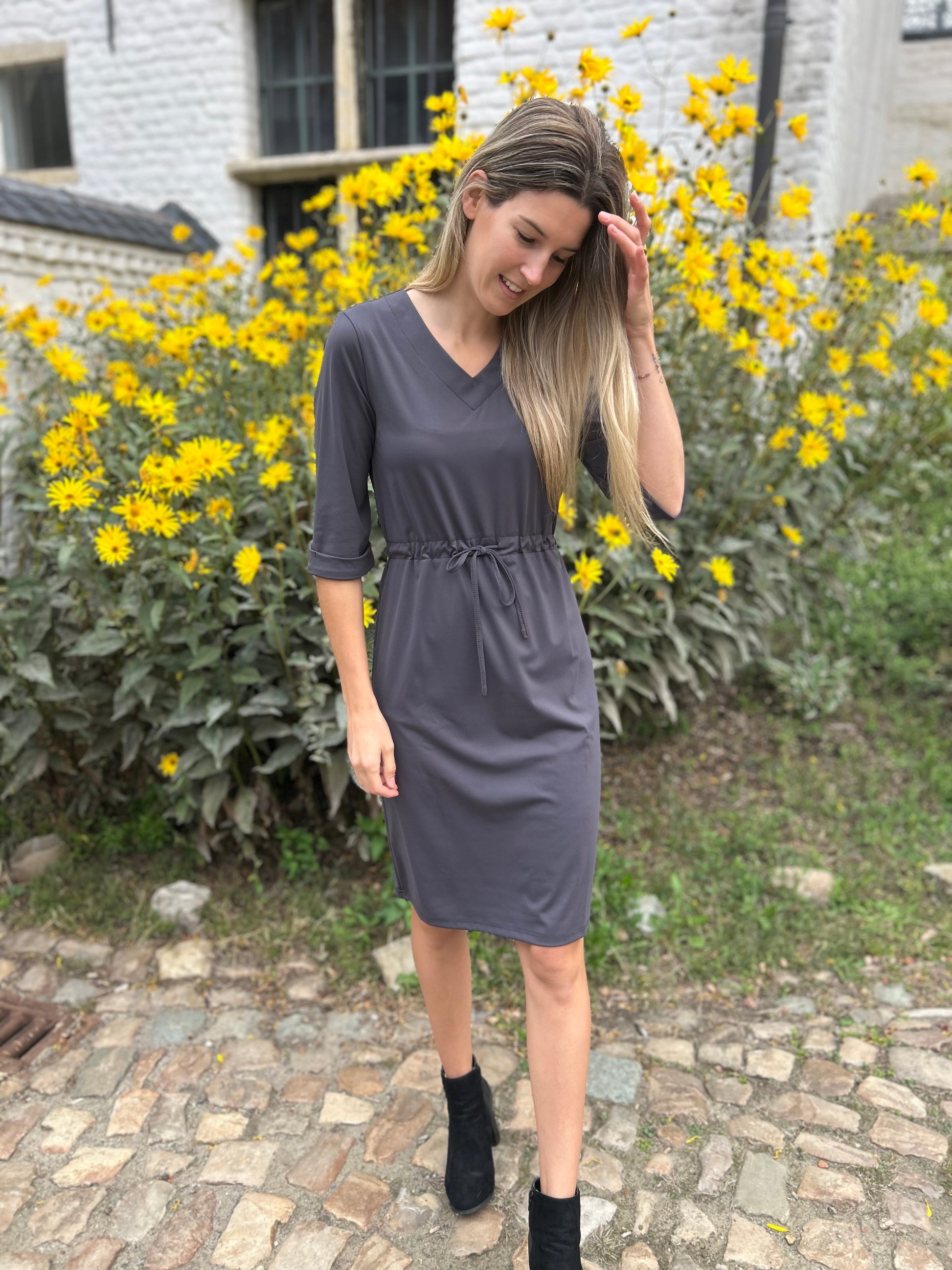 Deze Ivy Beau jurk heeft driekwart mouwen en een V-hals. De jurk is gemaakt van travelstof en valt tot net onder de knie. Het model is een A-lijn midi jurk met rechte mouwen. Rond de middel bevind zich een koordje om aan te trekken.