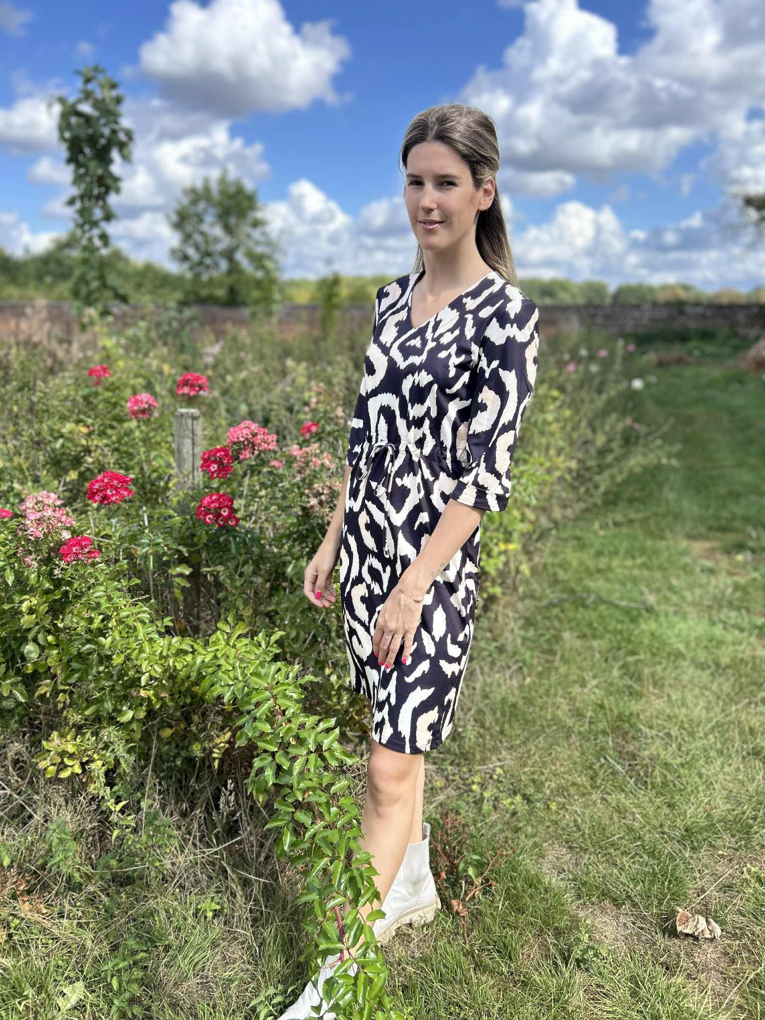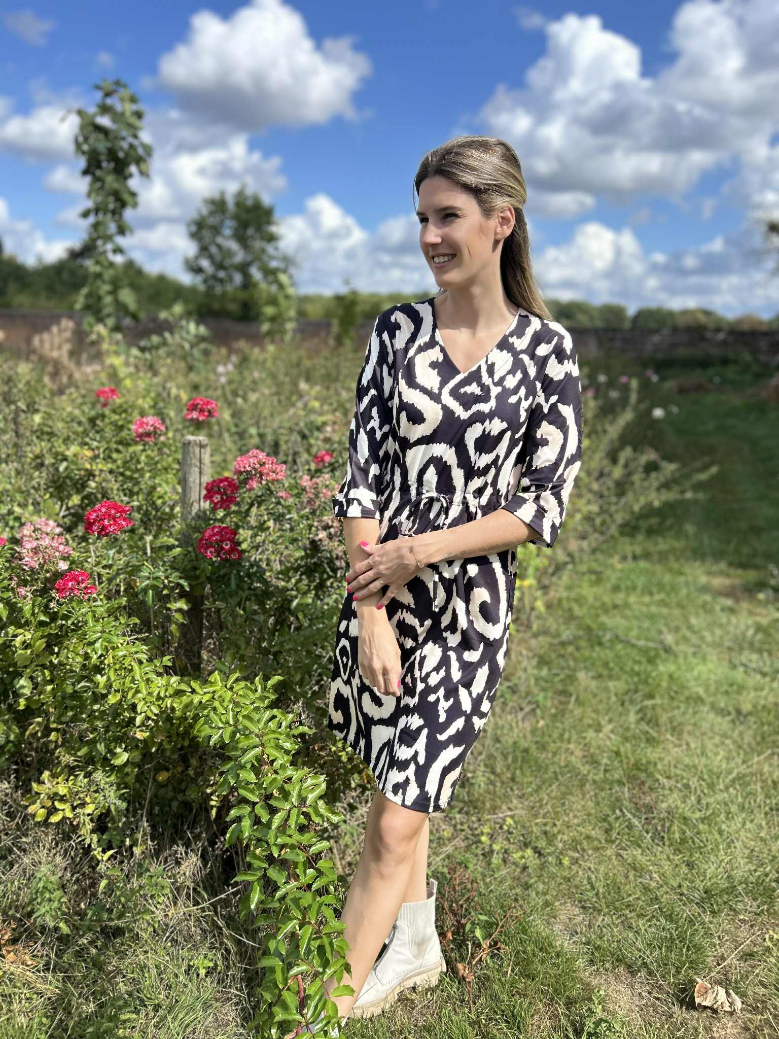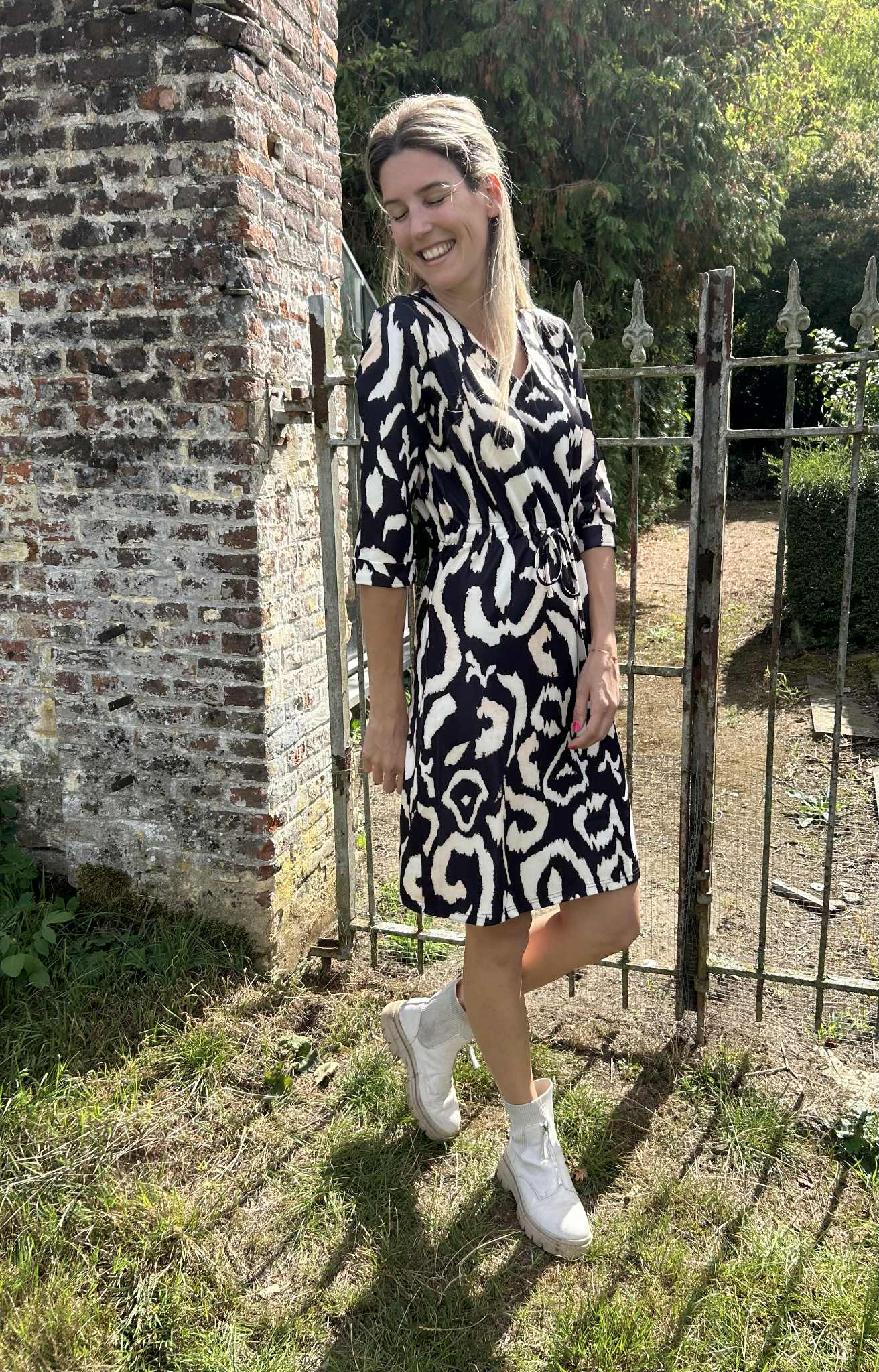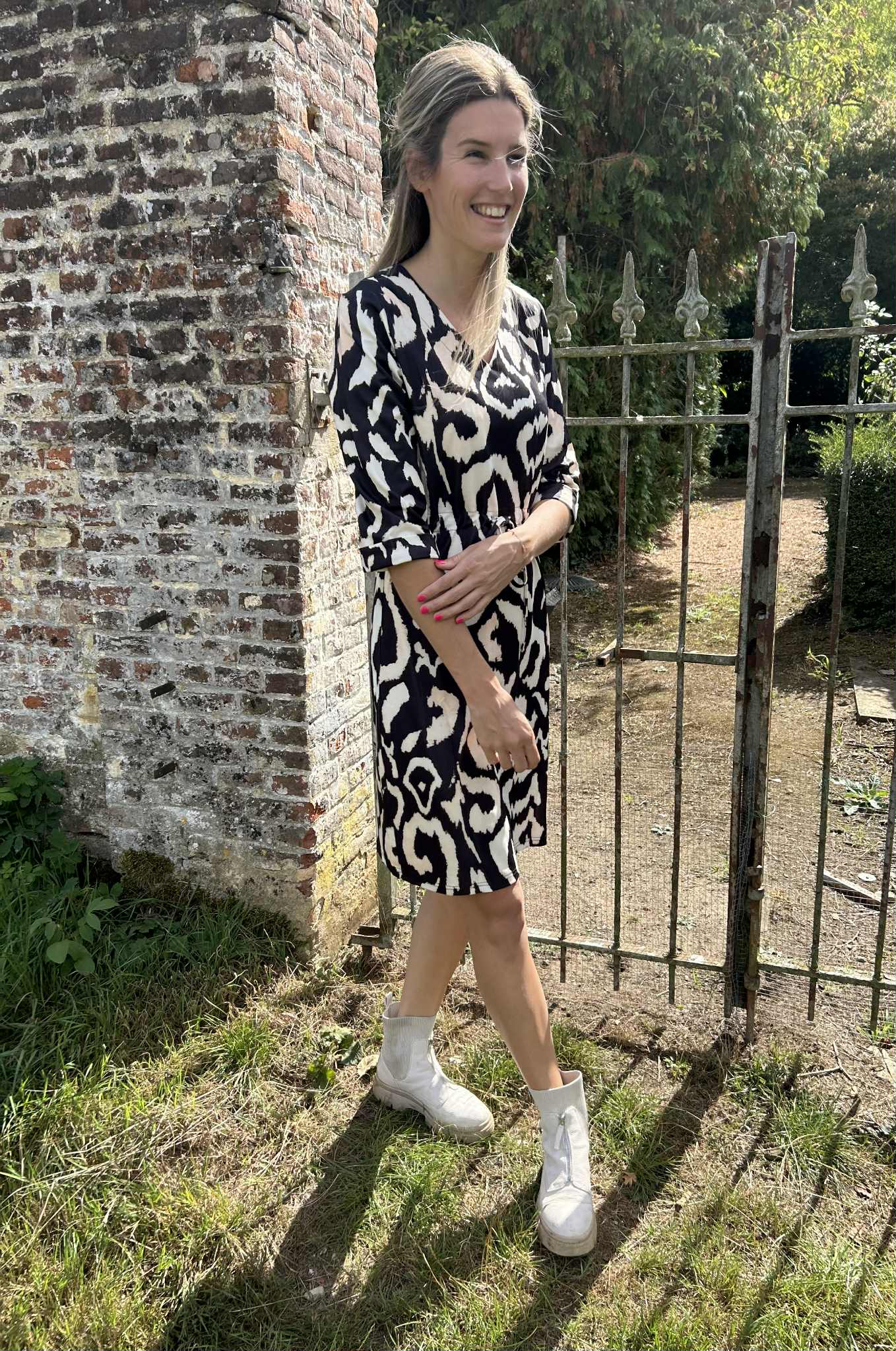 Deze Ivy Beau jurk heeft driekwart mouwen en een V-hals. De jurk is gemaakt van travelstof en valt tot net onder de knie. Het model is een A-lijn midi jurk met rechte mouwen. Rond de middel bevind zich een koordje om aan te trekken.