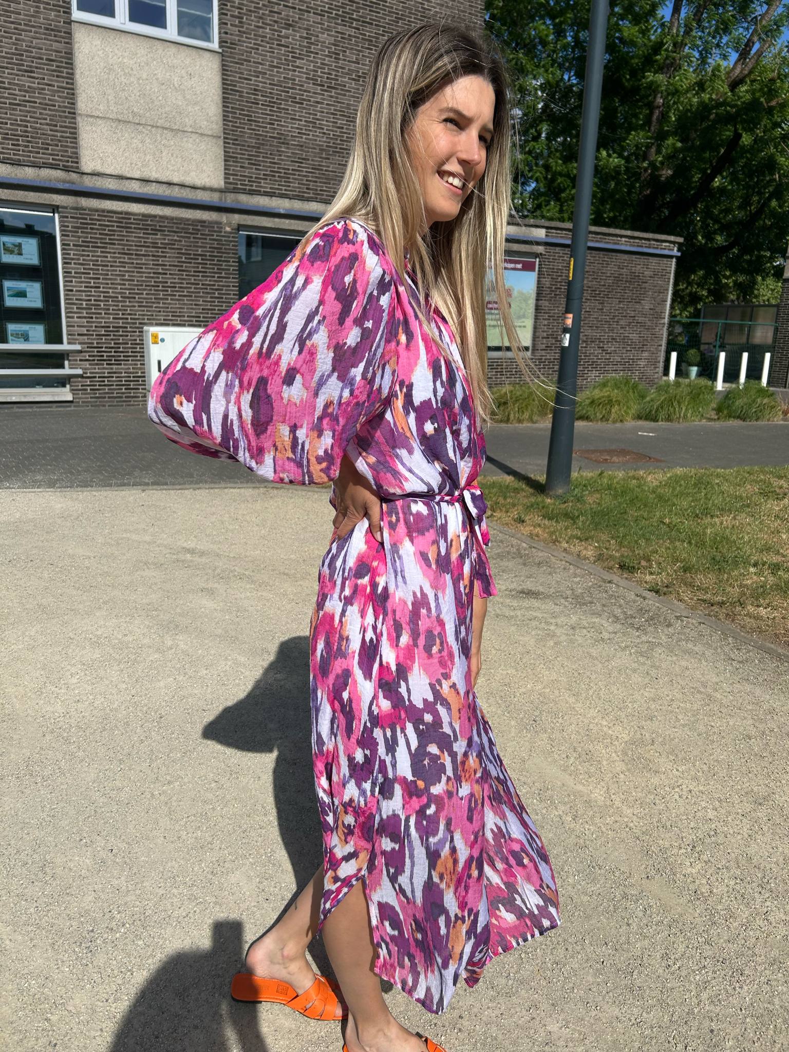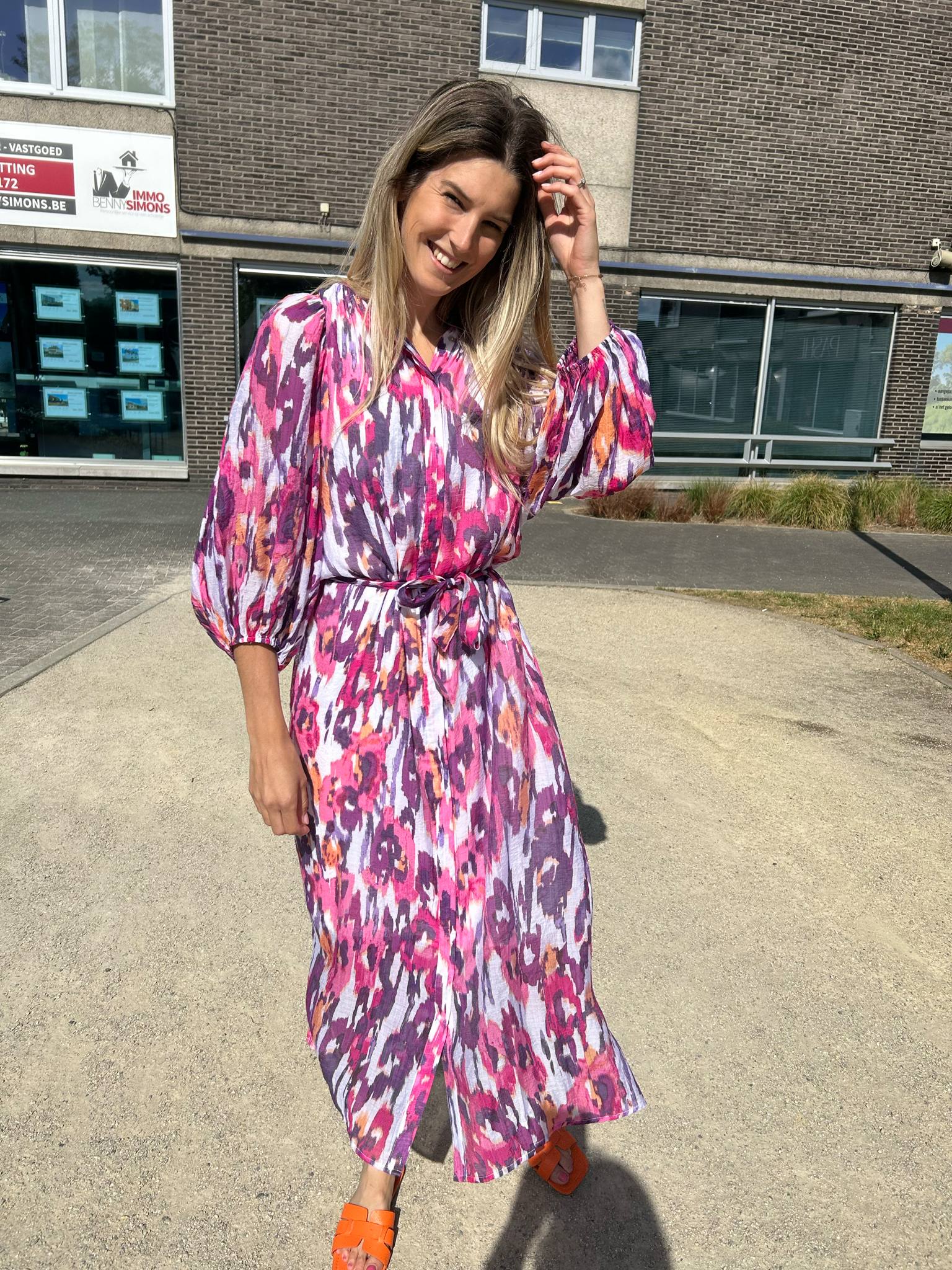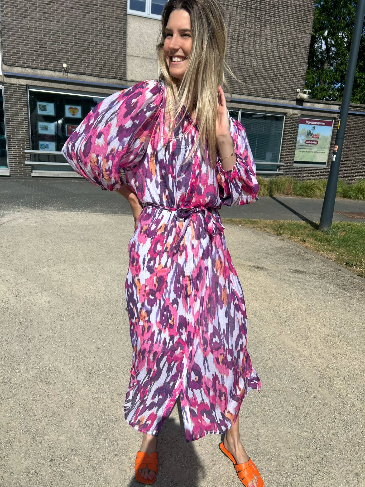 Maxi-jurk van het merkje Yest in een zomerse roze/paarse print. Deze heerlijk wijde doorknoopjurk is dé eyecatcher van deze zomer! De mouwen zijn wijd aangezet en hebben een elastische zoom. Verder heeft deze jurk een witte voering om doorschijnen te voorkomen.