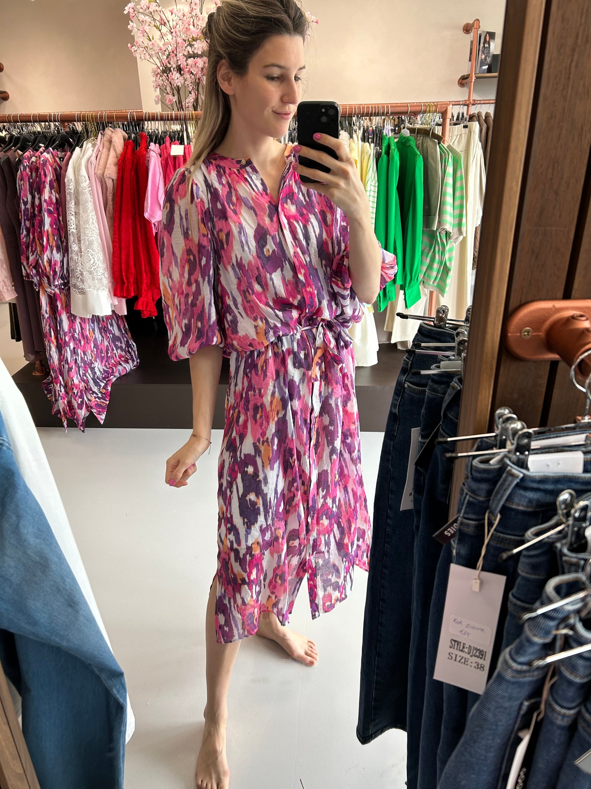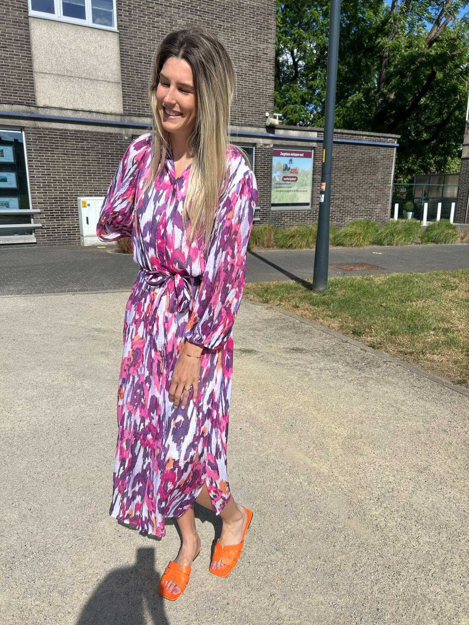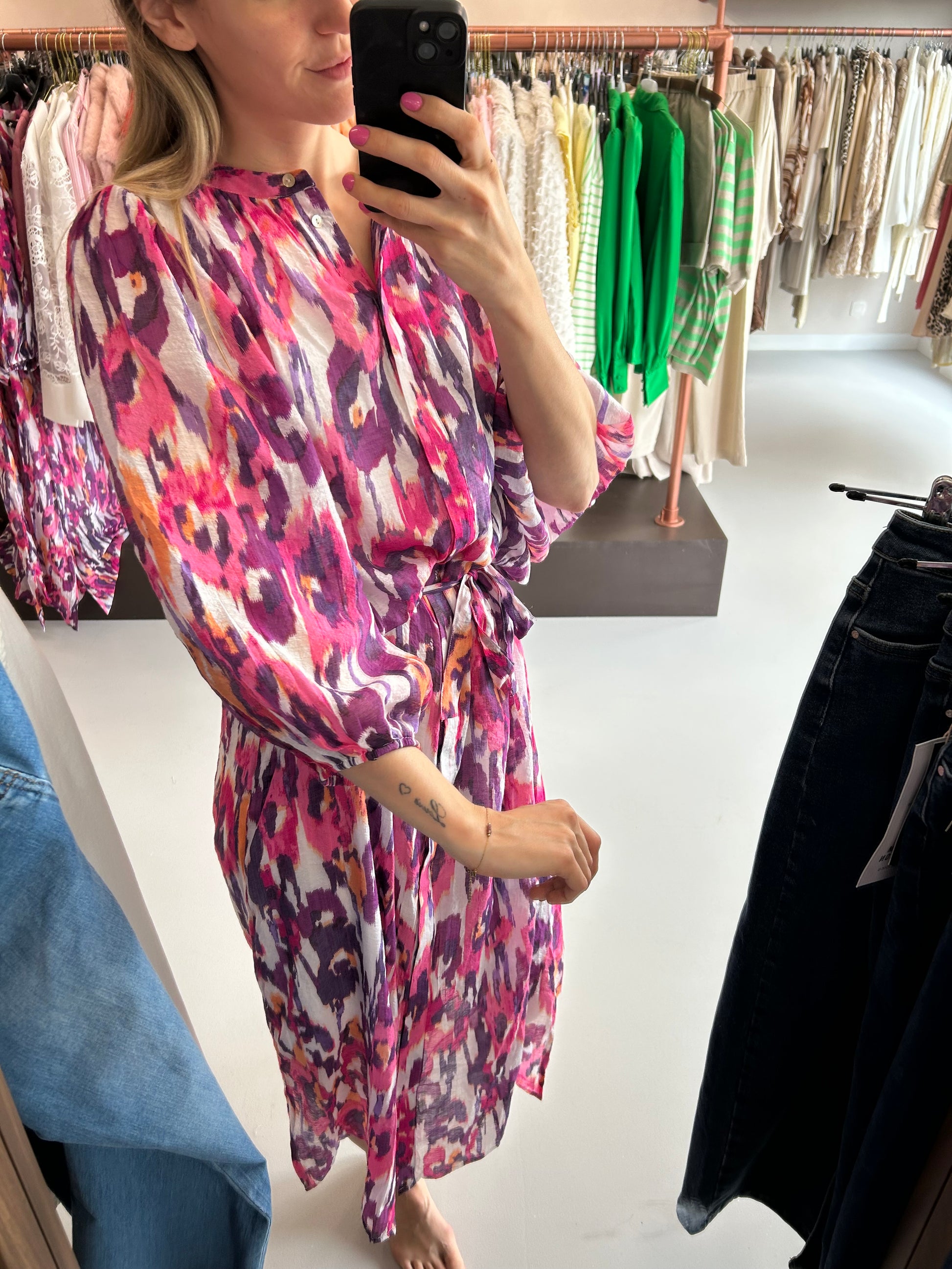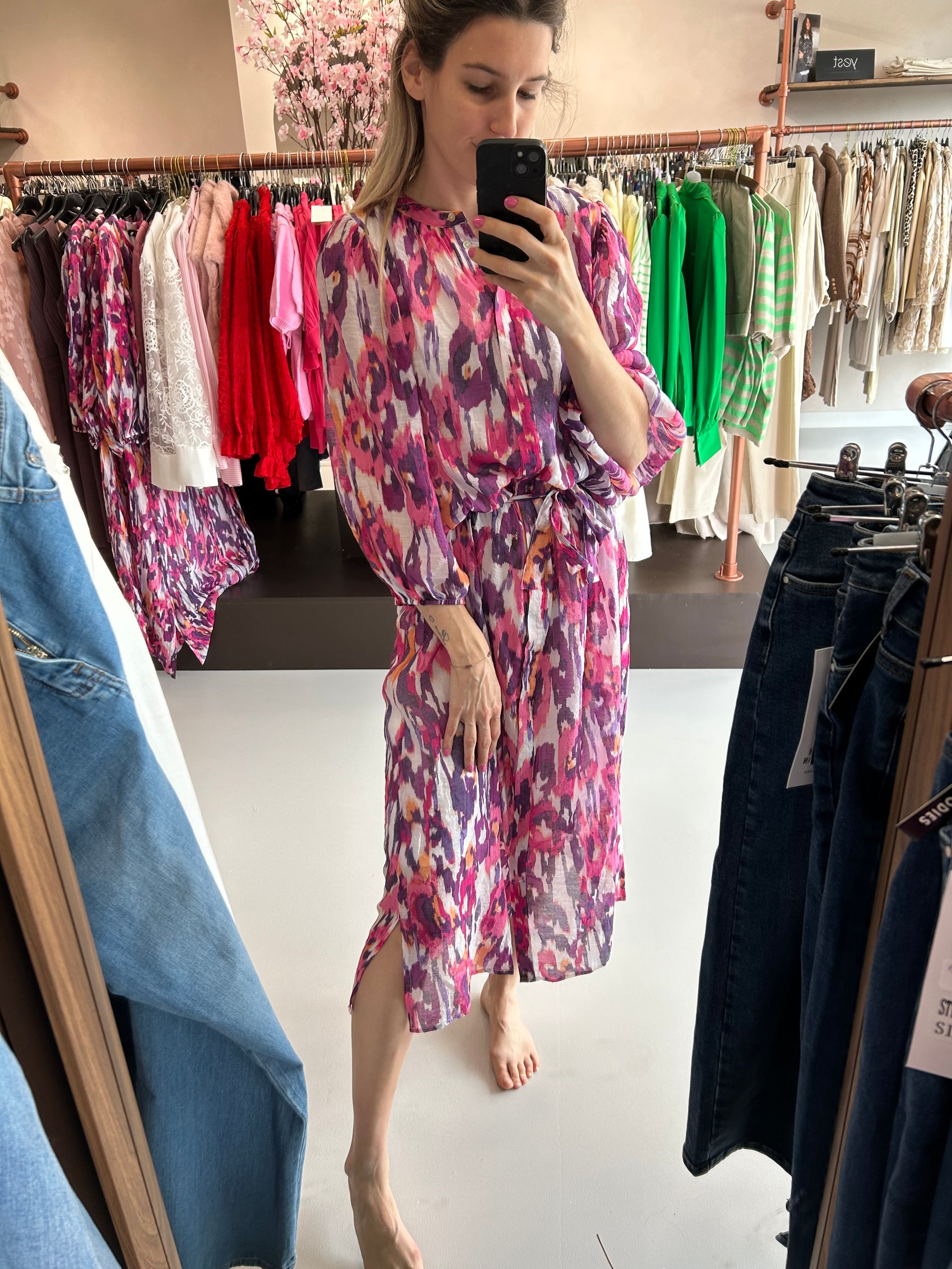 Maxi-jurk van het merkje Yest in een zomerse roze/paarse print. Deze heerlijk wijde doorknoopjurk is dé eyecatcher van deze zomer! De mouwen zijn wijd aangezet en hebben een elastische zoom. Verder heeft deze jurk een witte voering om doorschijnen te voorkomen.