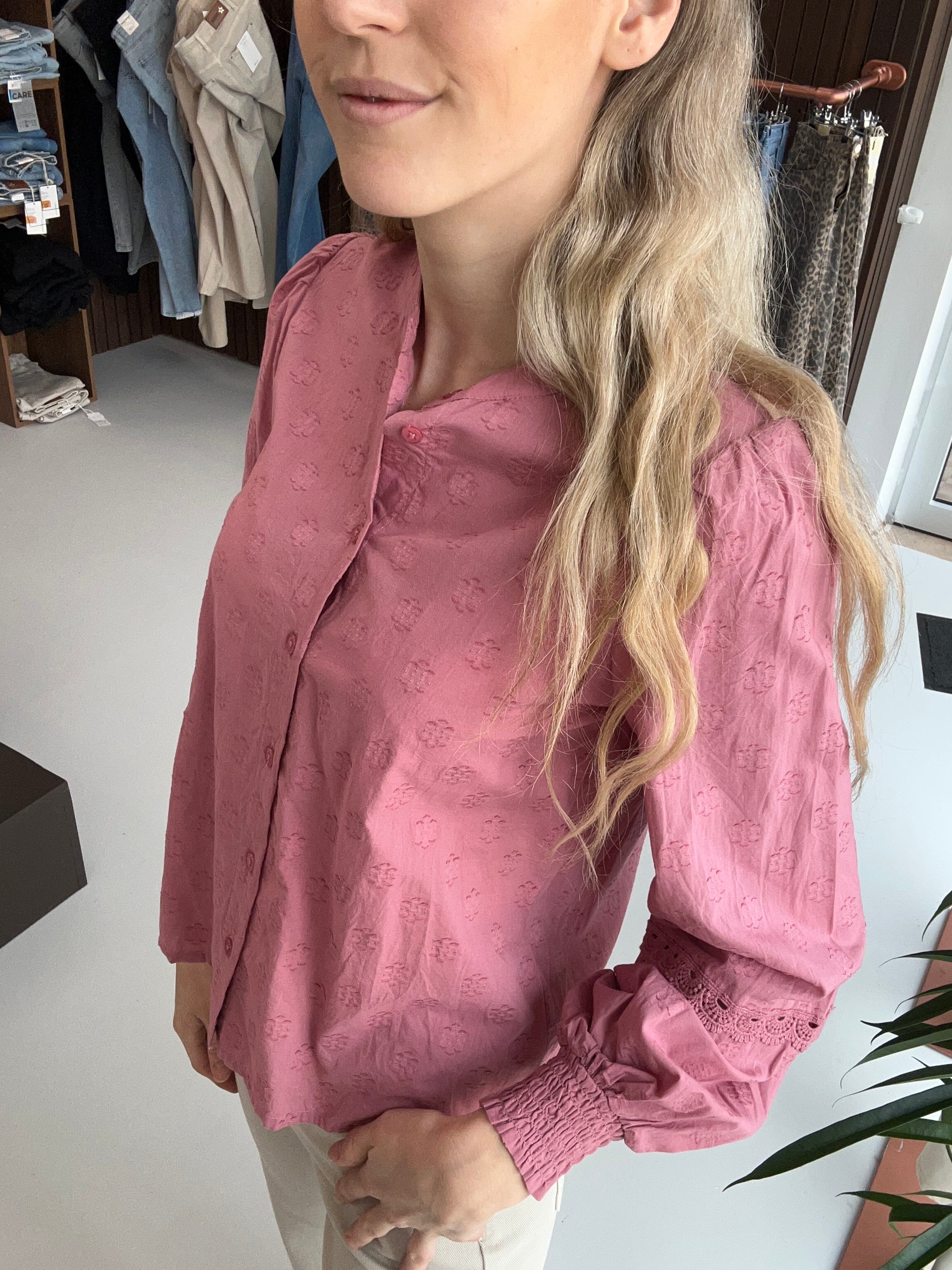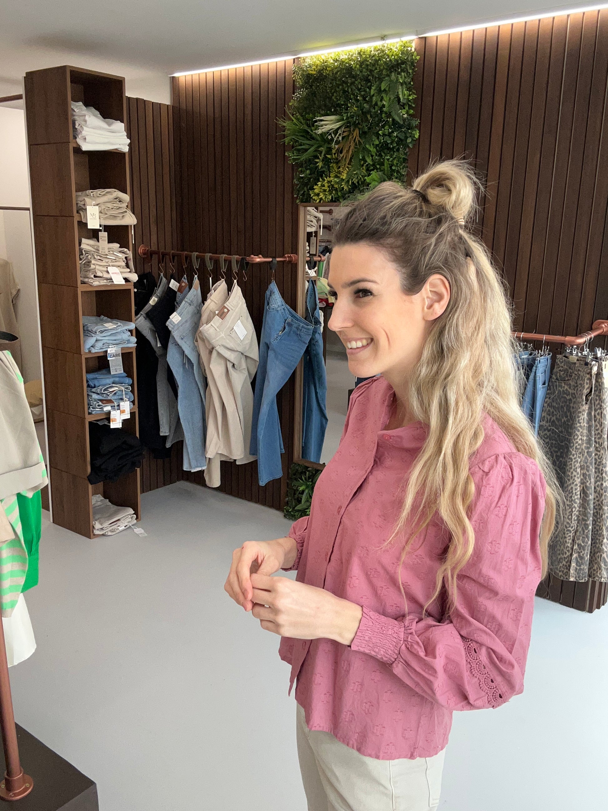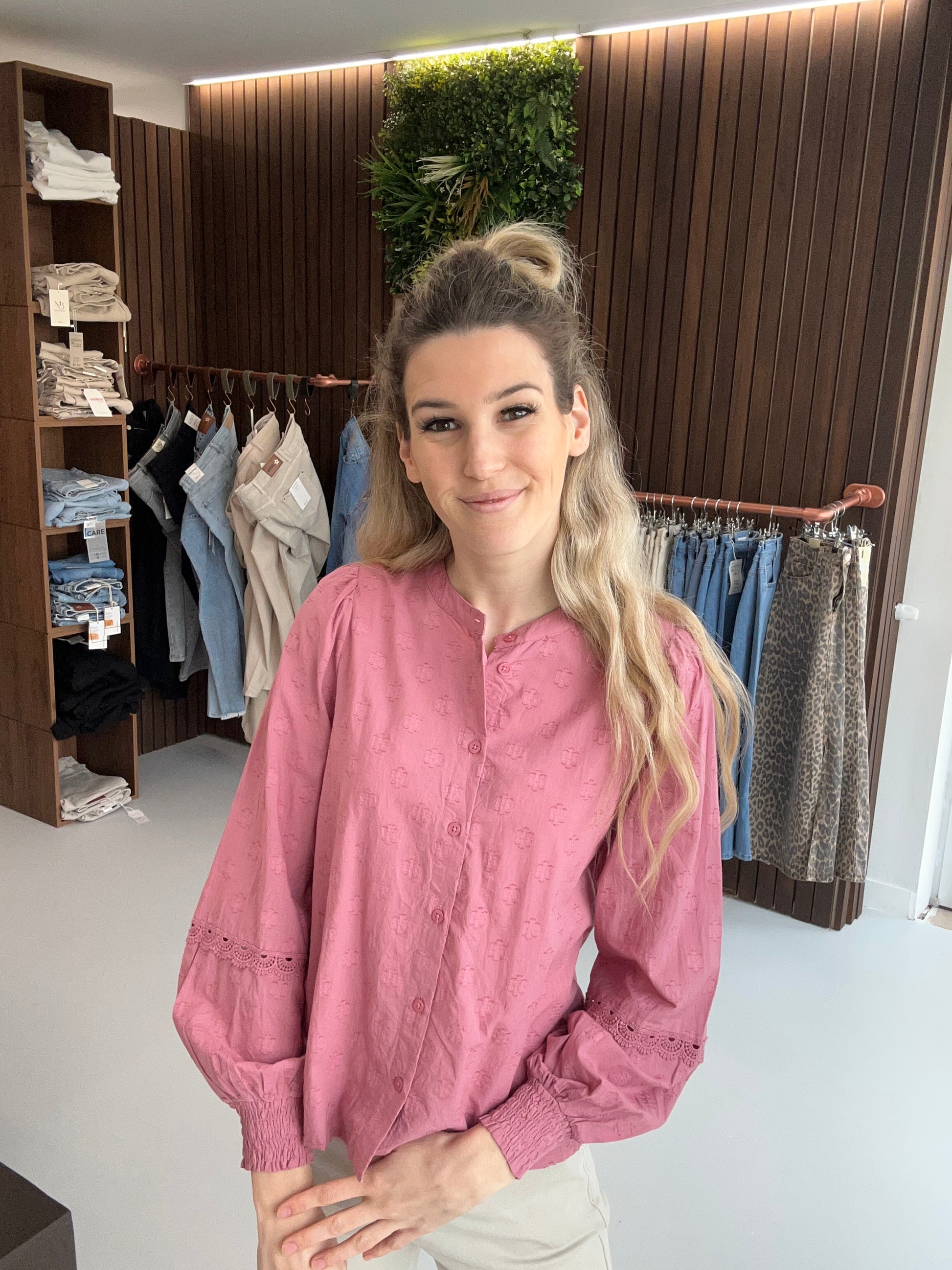 Deze blouse is een prachtige kanten blouse met een regular fit. Ook is de blouse afgewerkt met knoopjes van boven tot onder. De blouse heeft wat pofmouwen en is aansluitend aan de pols met een elastische band. De blouse is licht transparant en heeft een mooi bloemenpatroon.