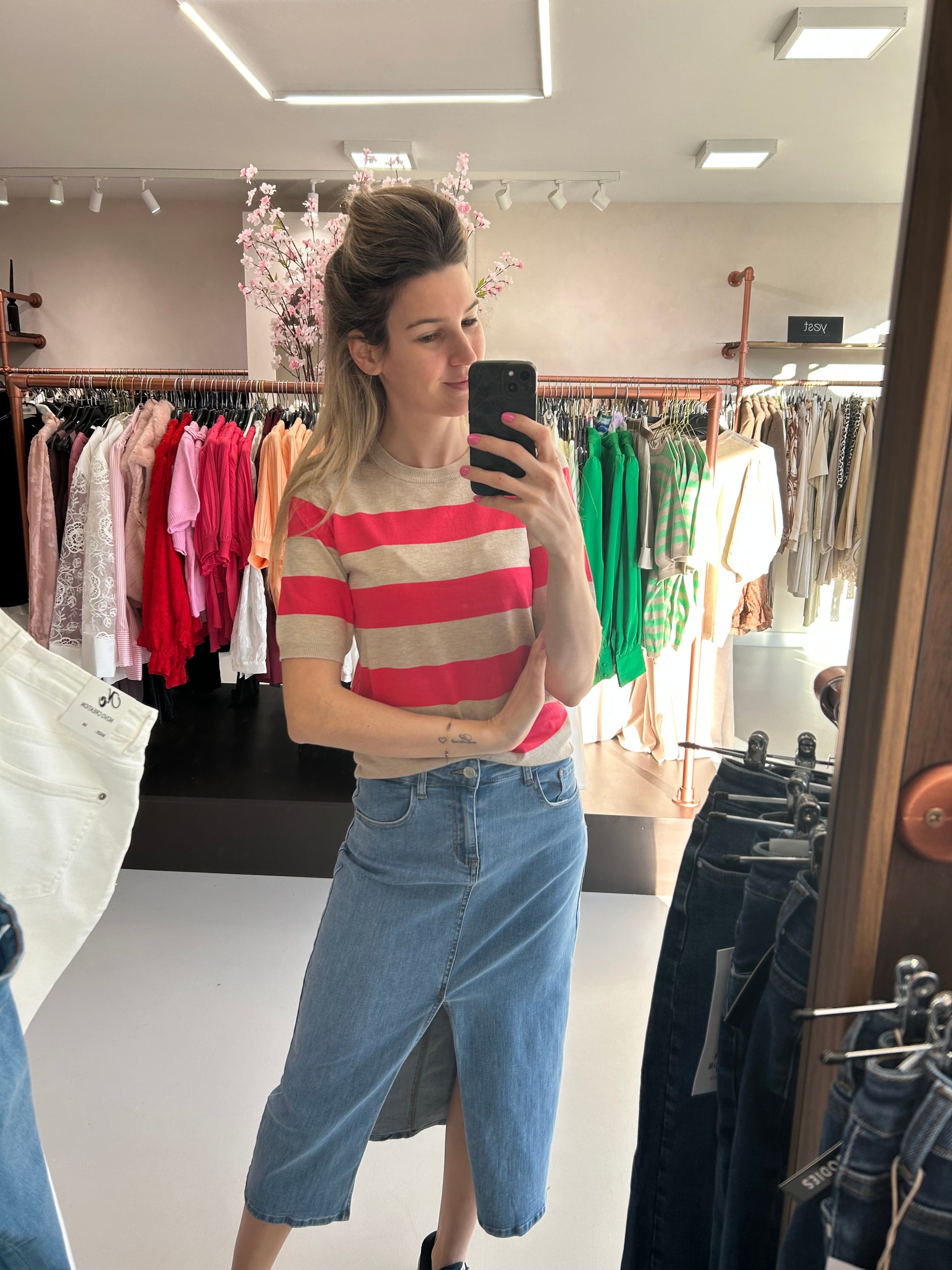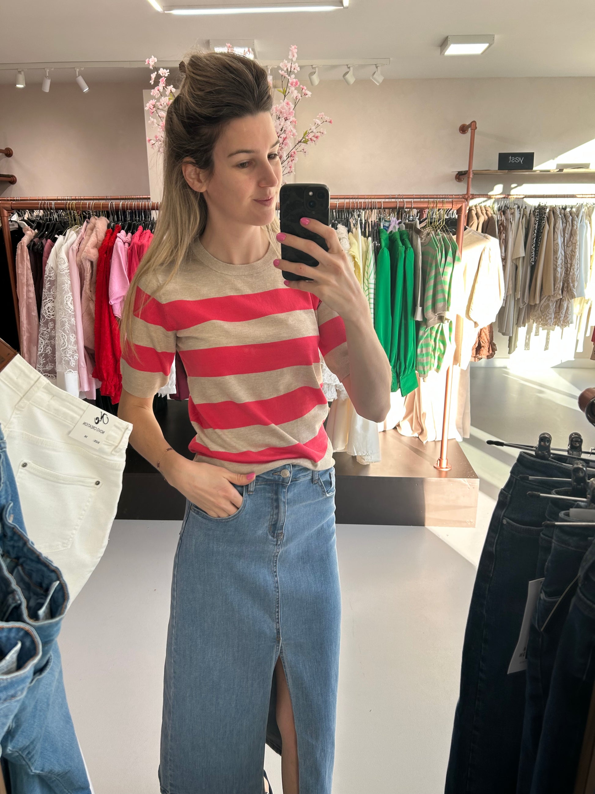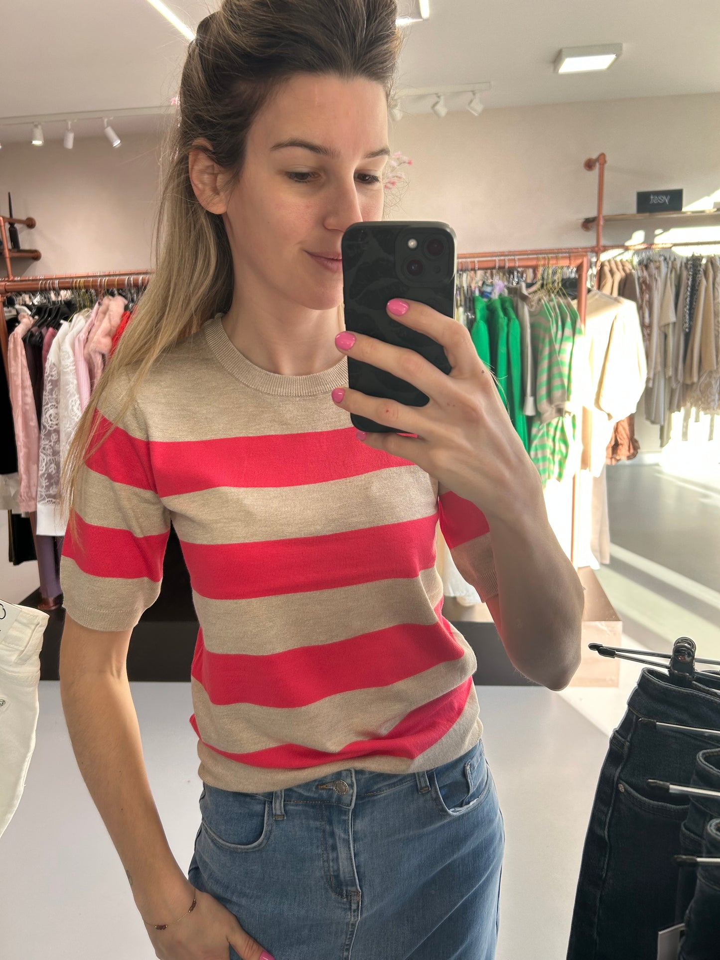 Dit truitje is een iets meer aansluitend model. De mouwen zijn tot aan de elleboog. Dit truitje heeft een mooie combinatie van de 2 kleuren taupe en groen. Kan je zo dragen of onder een blazertje. Super zacht pulletje. Horizontale strepen aan de voorkant die doorlopen naar de achterkant