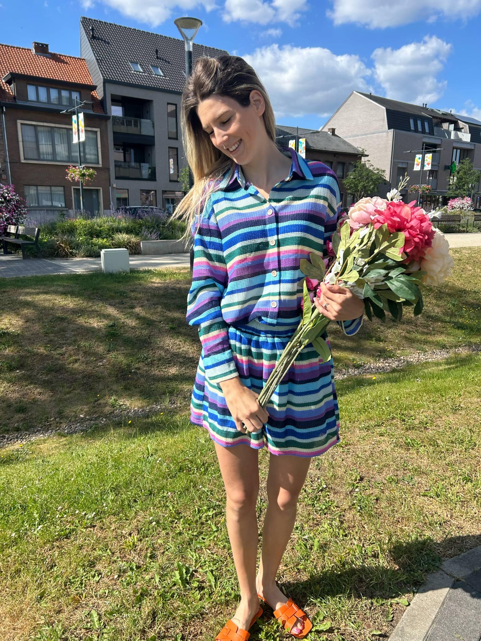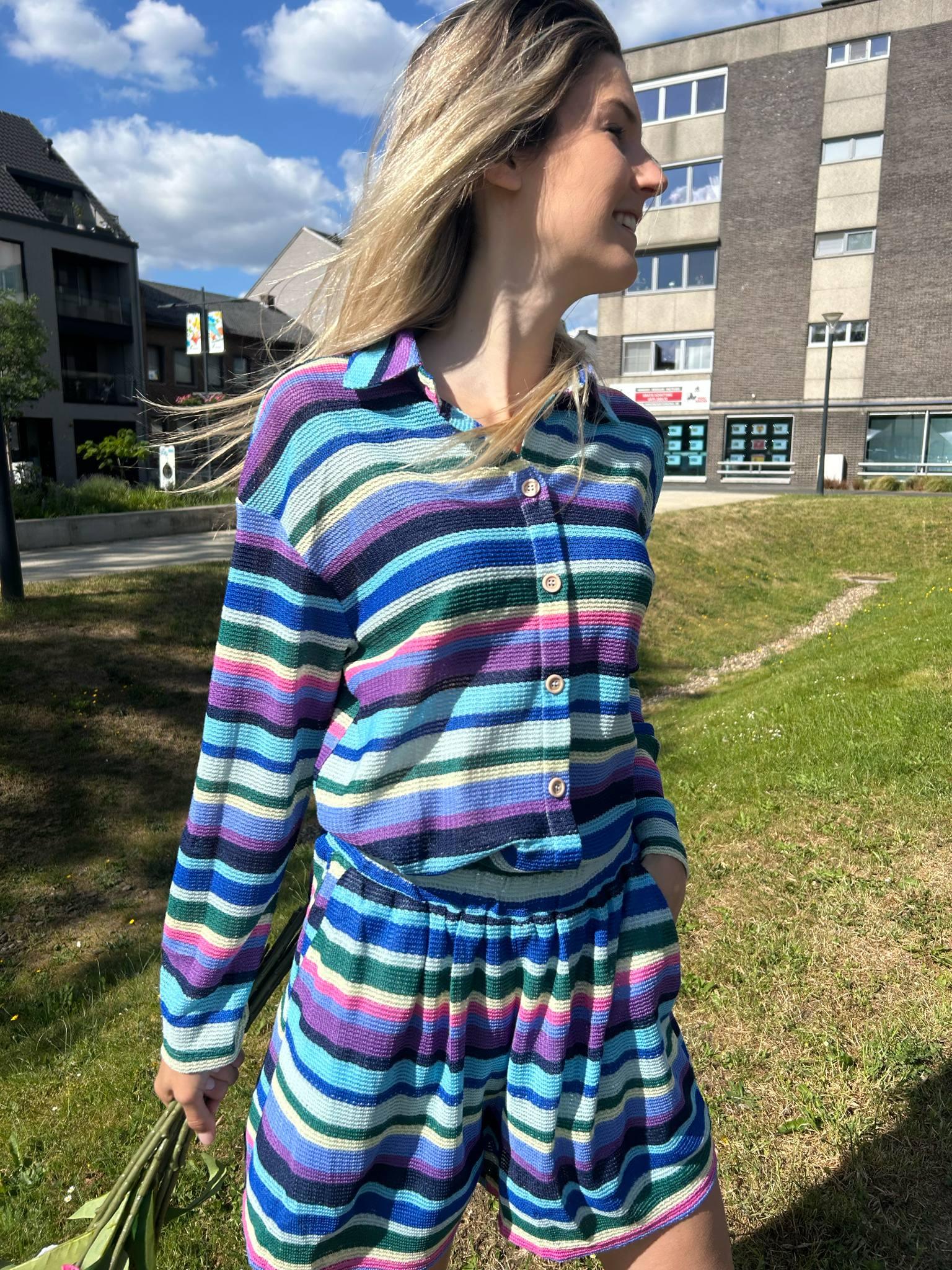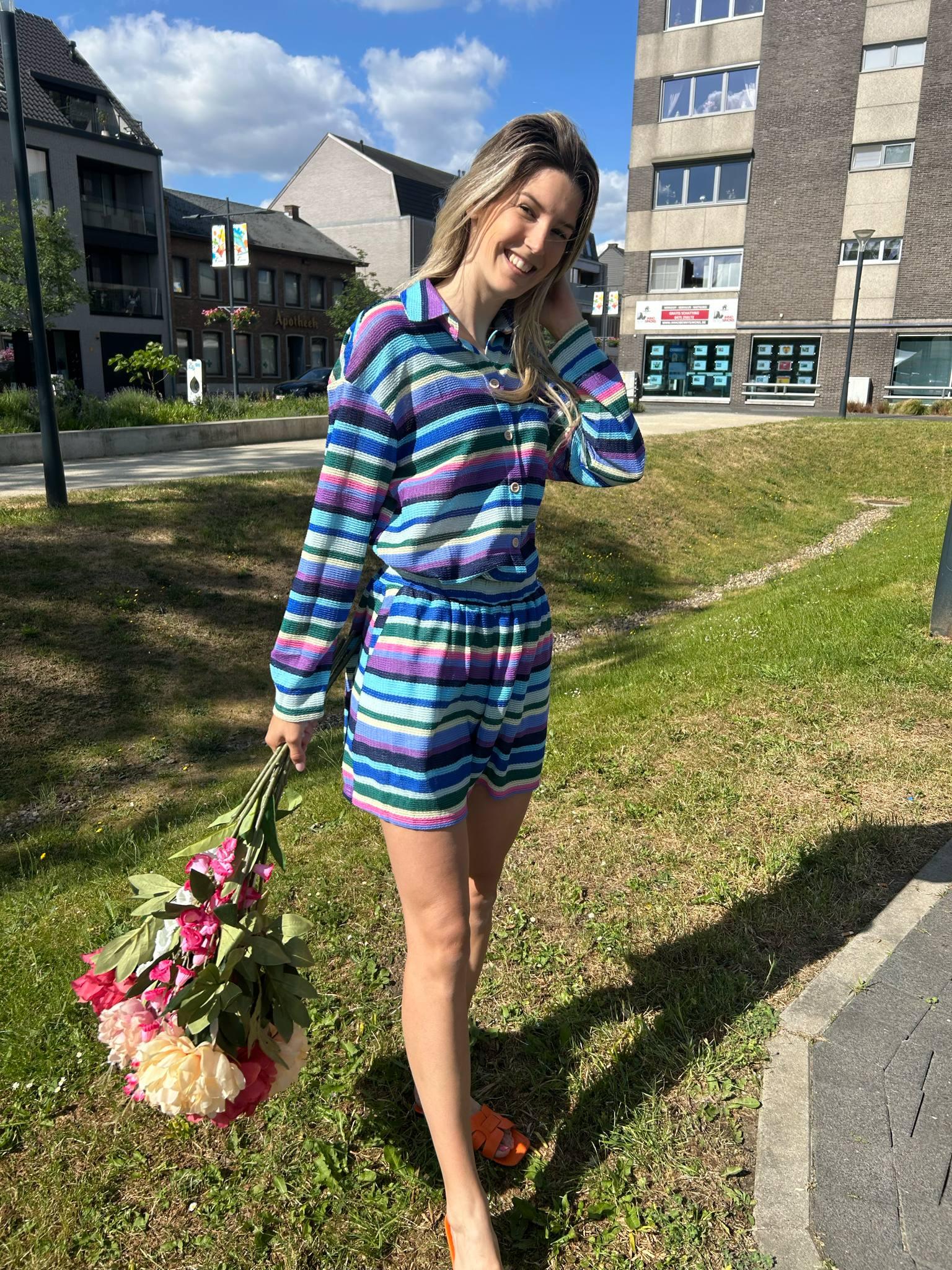 Multicolored braided set bestaande uit een short met elastiek en zakken en een hemdje met knoopjes van onder tot boven.