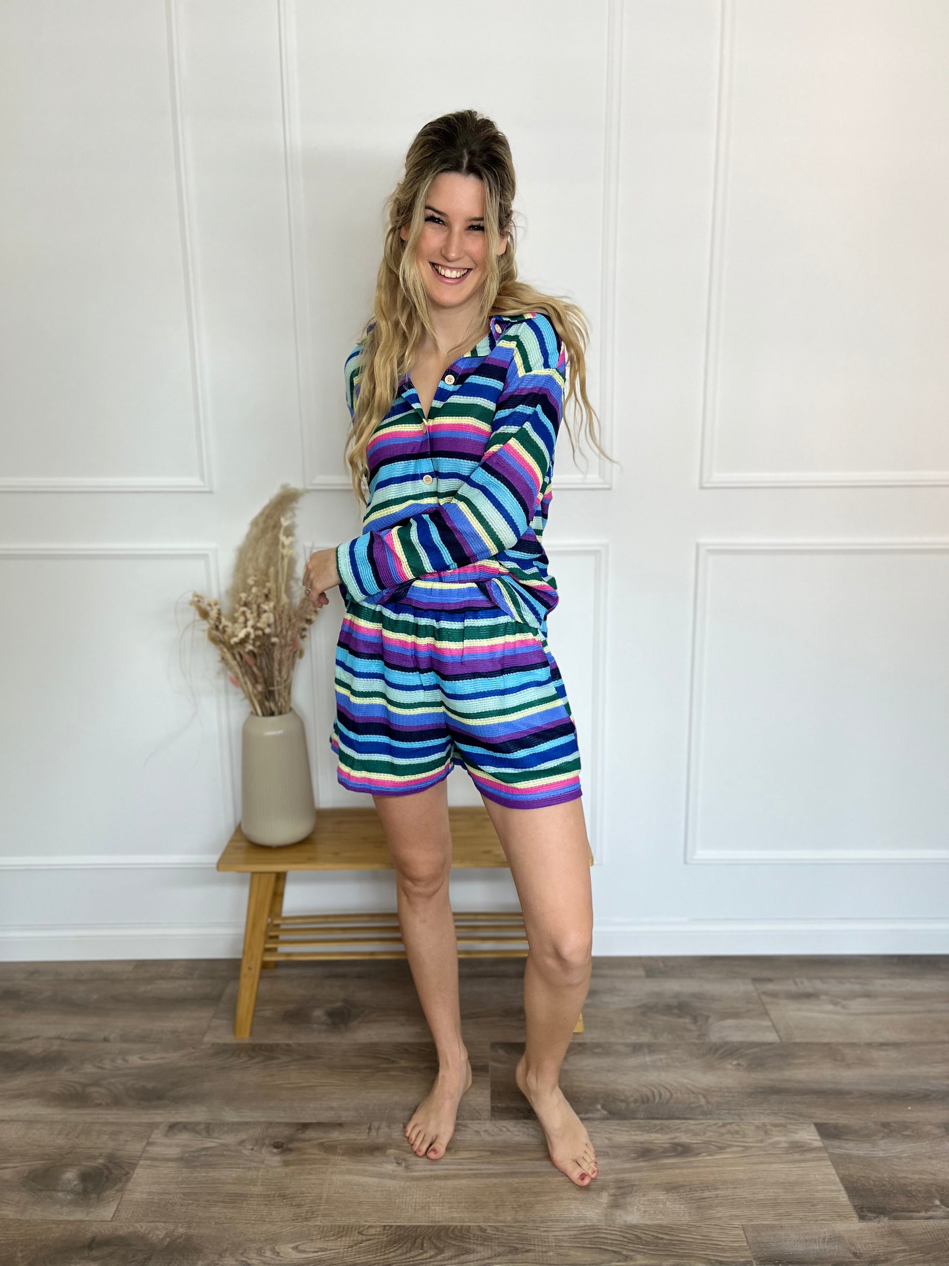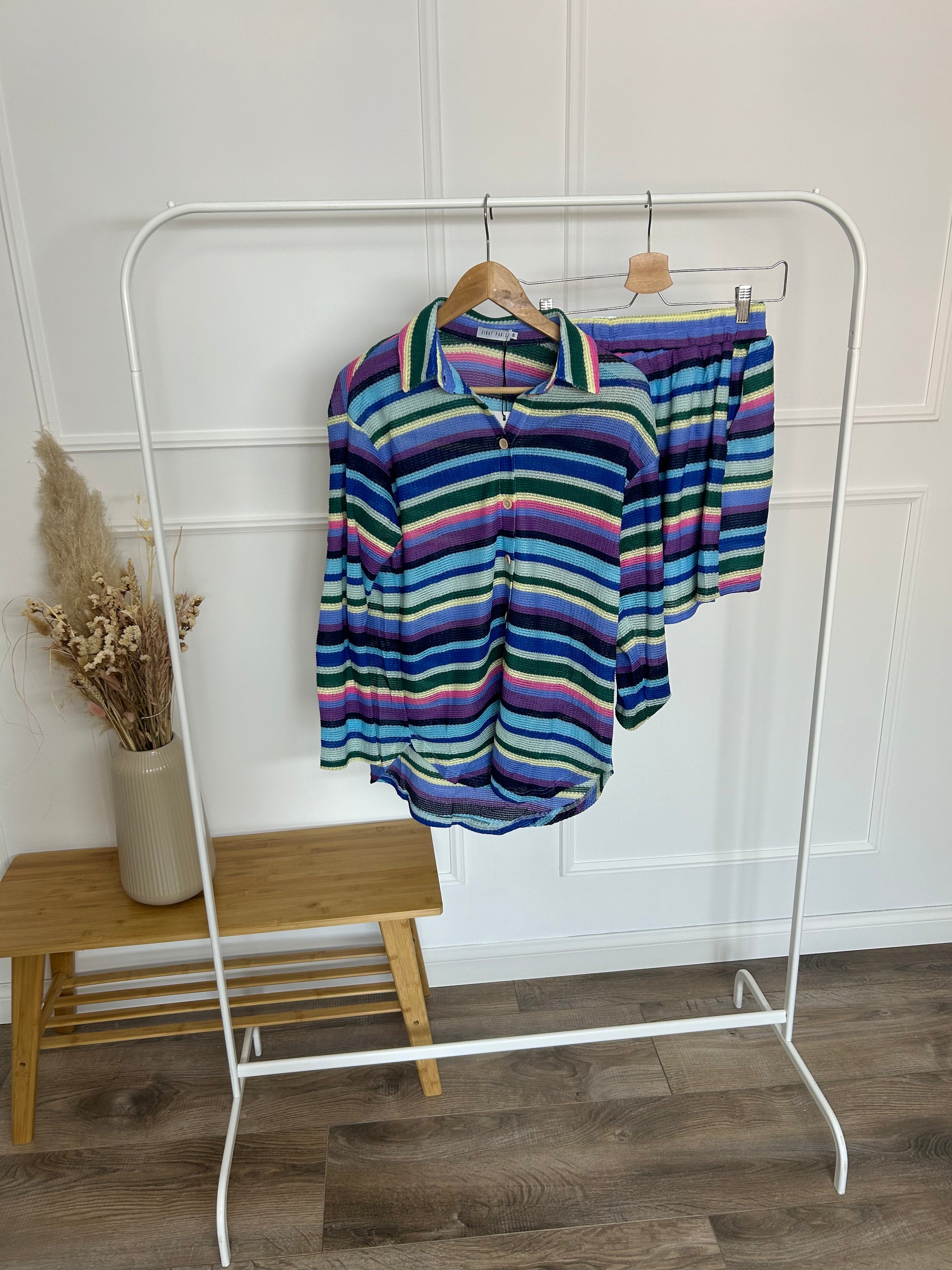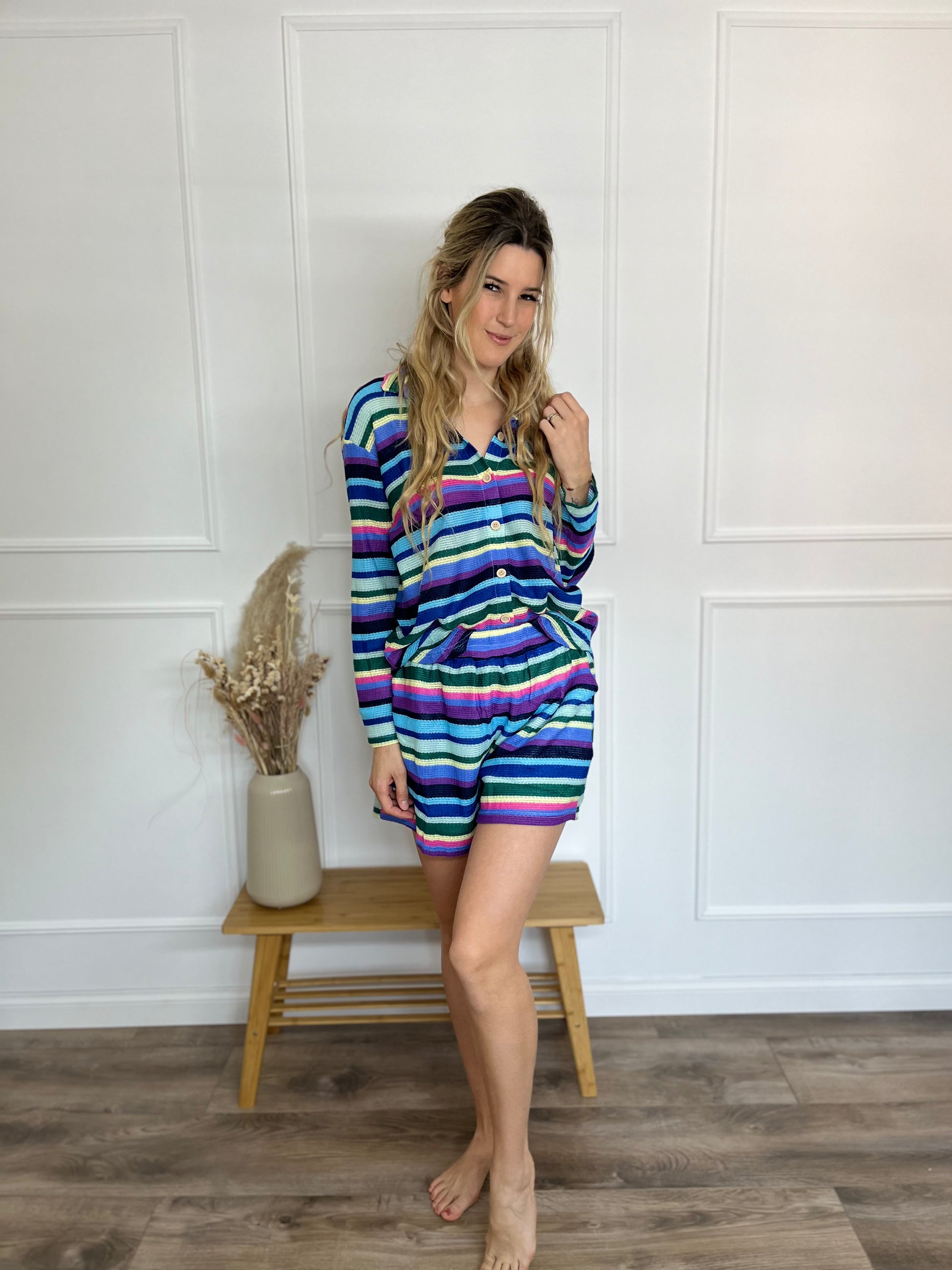 Multicolored braided set bestaande uit een short met elastiek en zakken en een hemdje met knoopjes van onder tot boven.