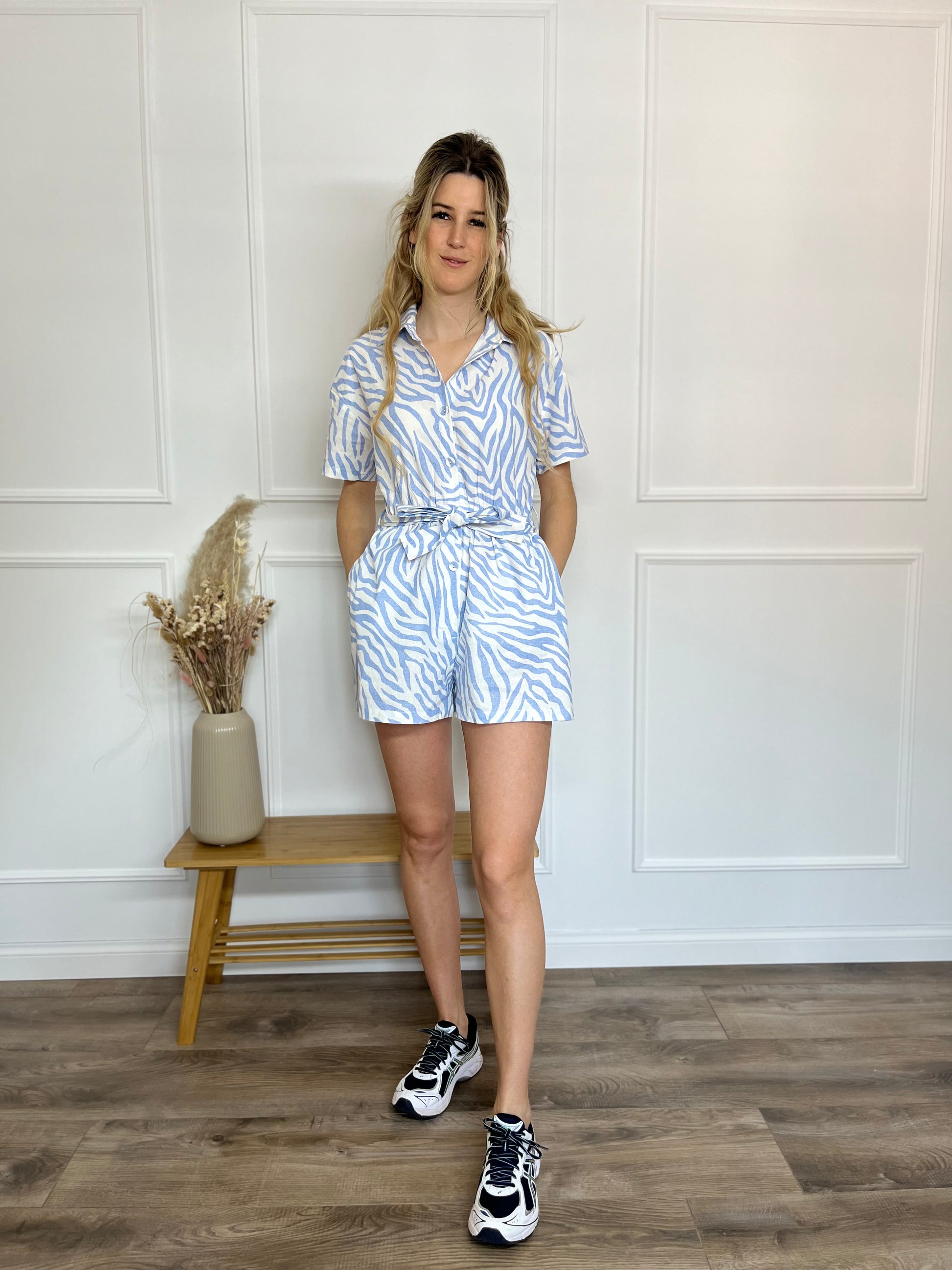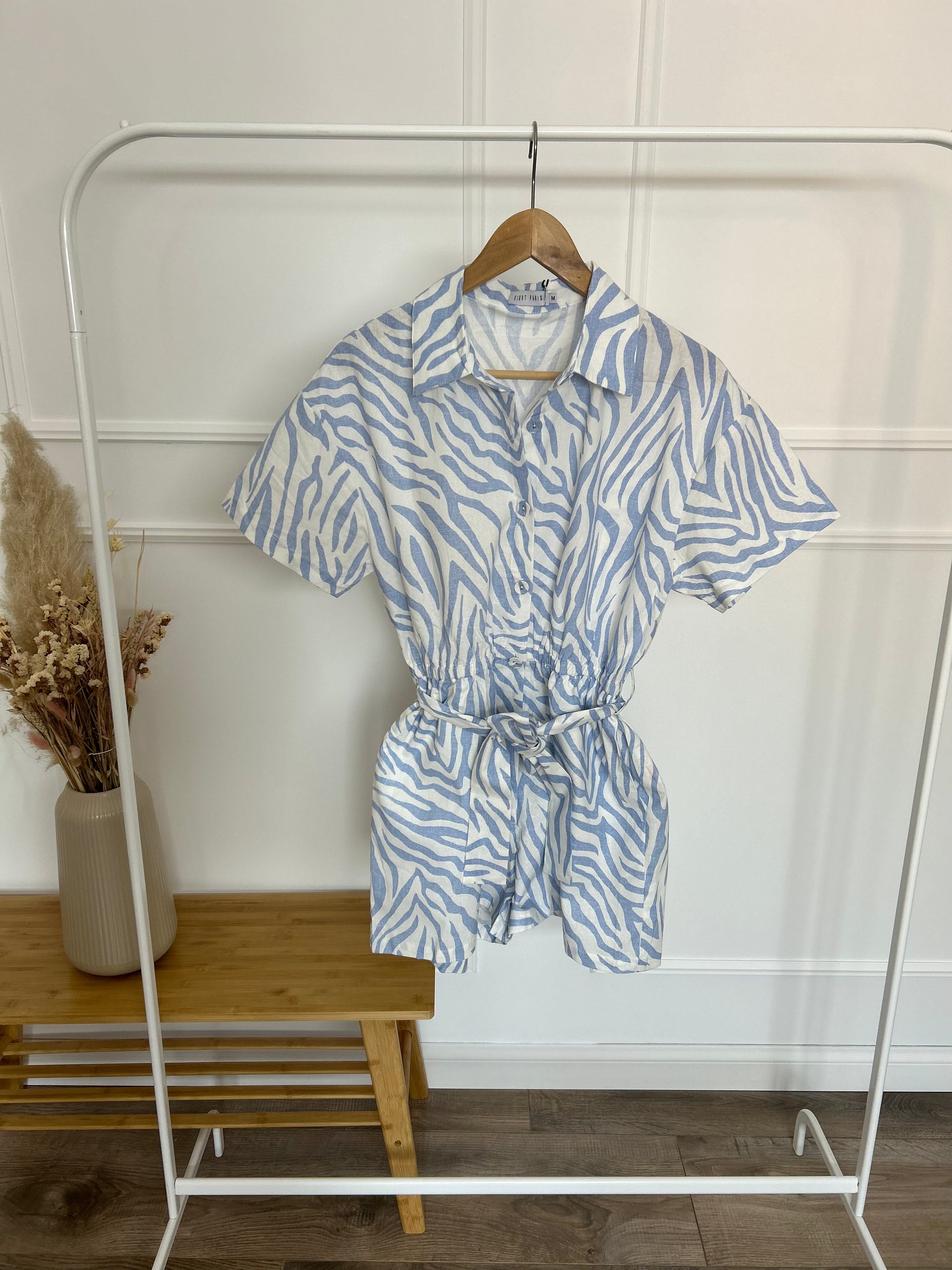 Playsuit zebra print met knoopjes, lint en elastische band.