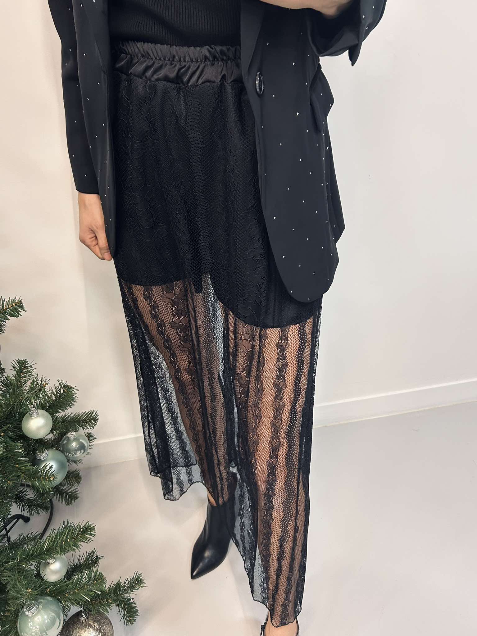 Rok Veronique is een lange kanten rok met een satijnen shortje aan de binnenkant. Super leuk om te dragen bij de feestdagen. Voor wie houdt van iets specialer is dit de ideale rok. De rok heeft een elastiek aan de taille. Wij combineerden de rok met onze "BLAZER FINN".